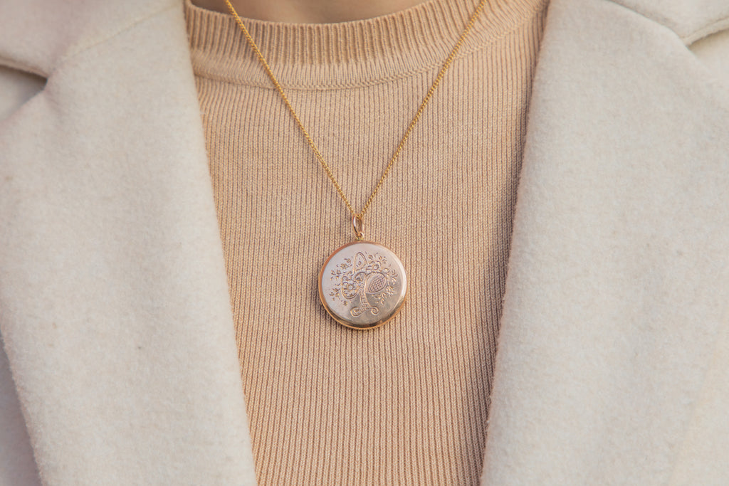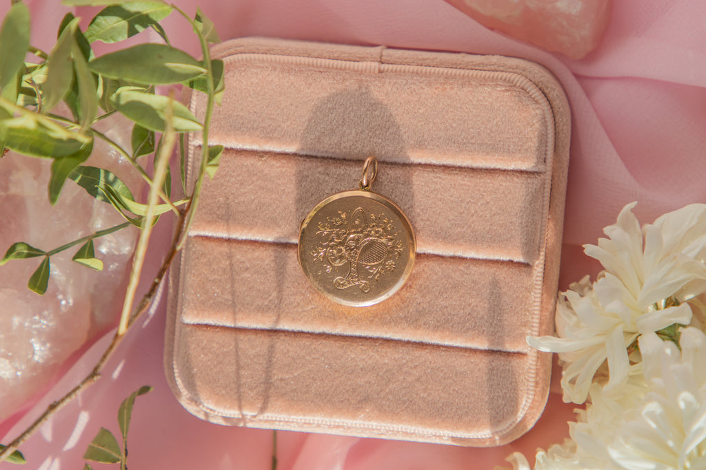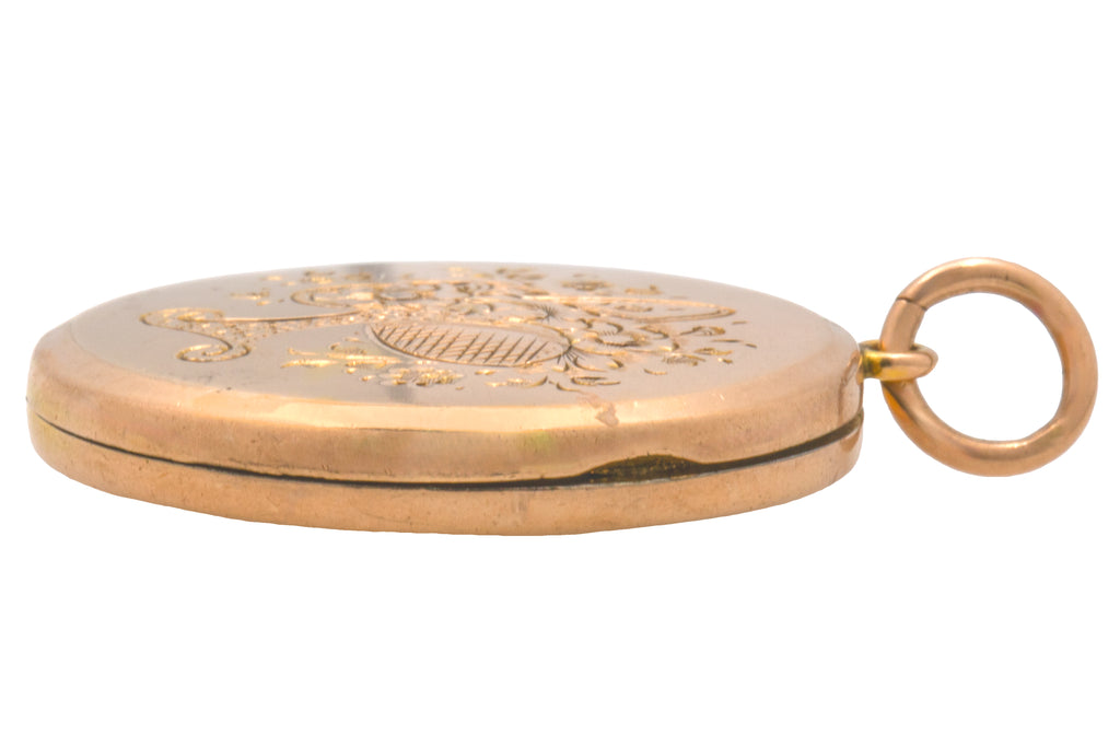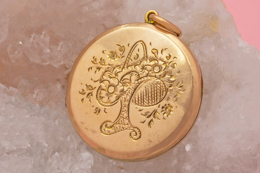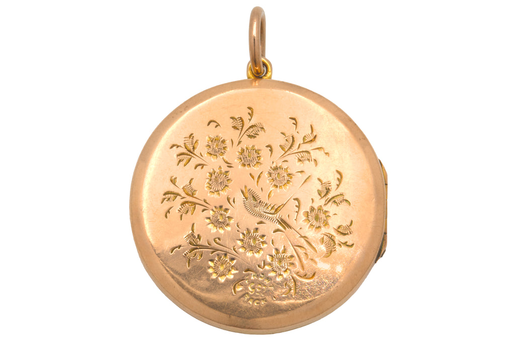 The most charming Victorian 9ct Gold round 'bouquet of flowers' locket. Beautifully engraved with sweet florals and swooping swallows, this perfectly round locket will instantly put a spring in your step.