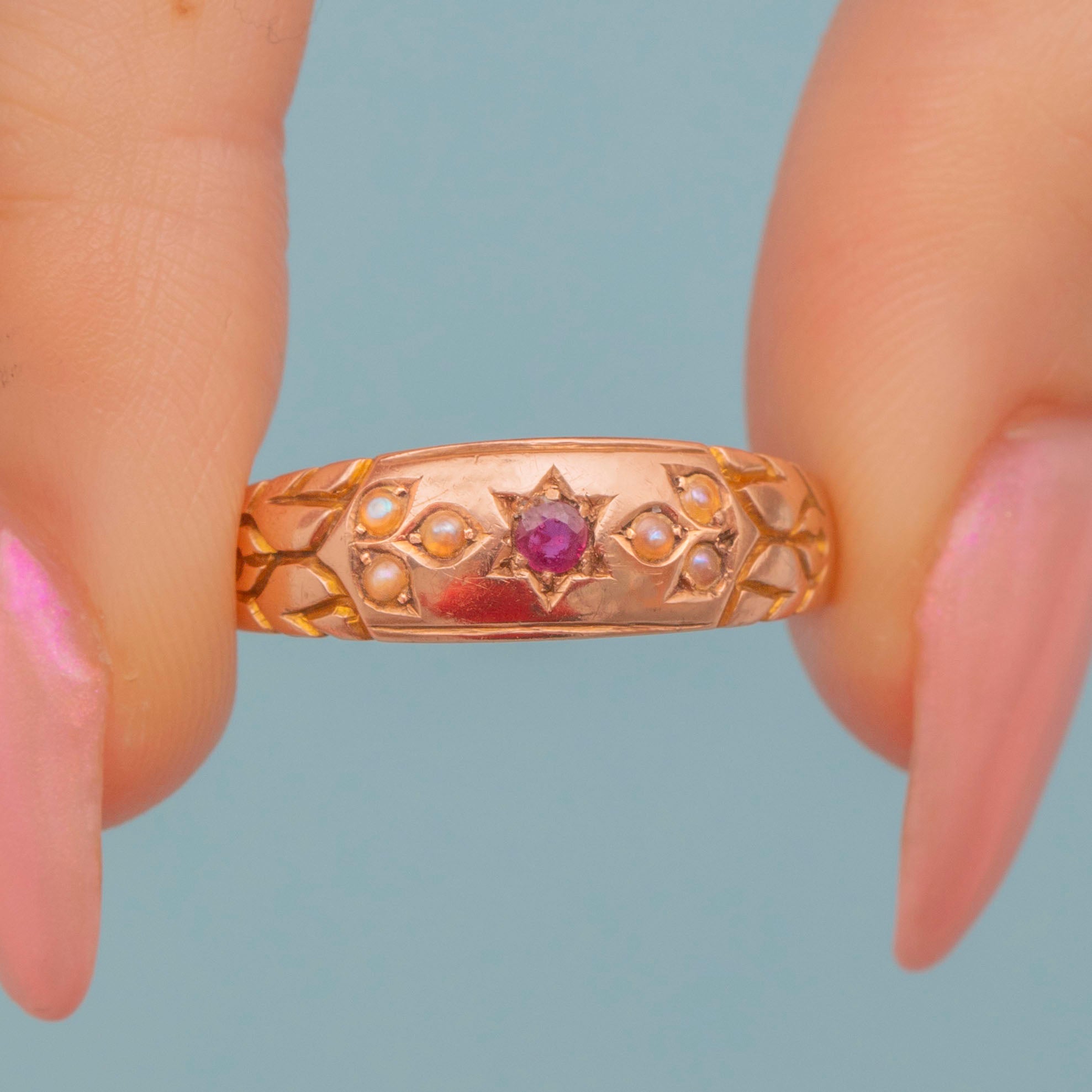 EXCELLENT: This Victorian 9ct Gold Ruby Pearl gypsy ring in in superb antique condition. She is Victorian, flaunting chunky & clear hallmarks. All gemstones sits secure, and her buttery band glides onto the hand like a dream! Dating back to 1900, her beauty has been well preserved!