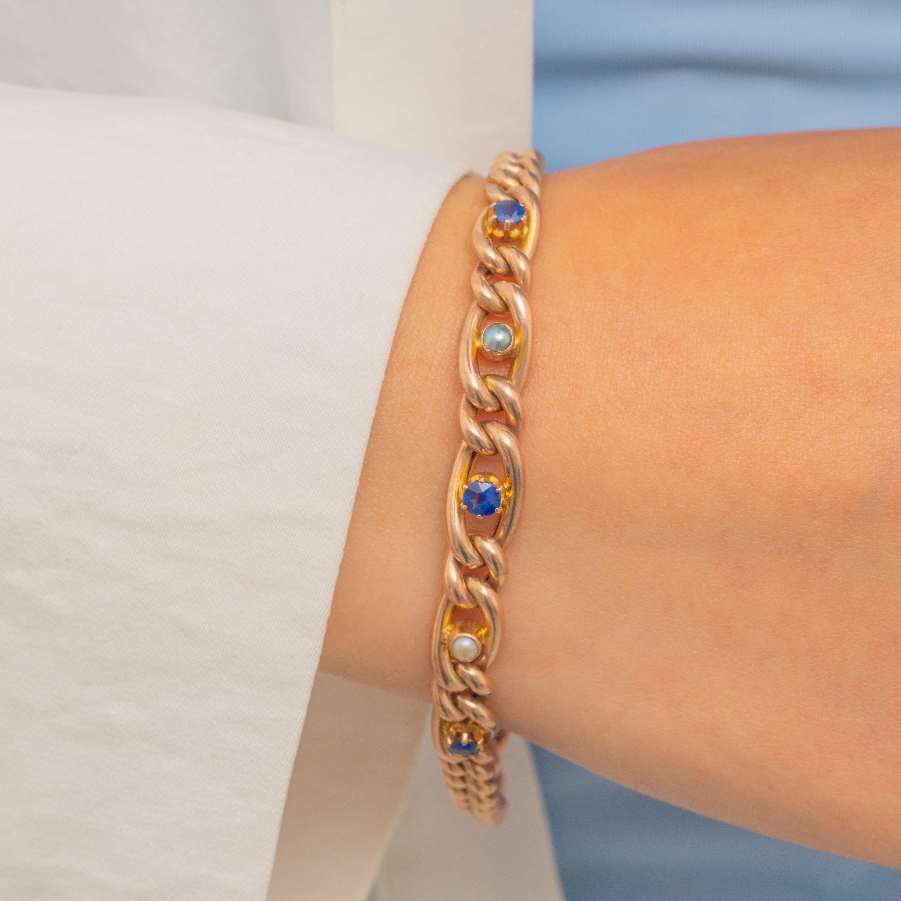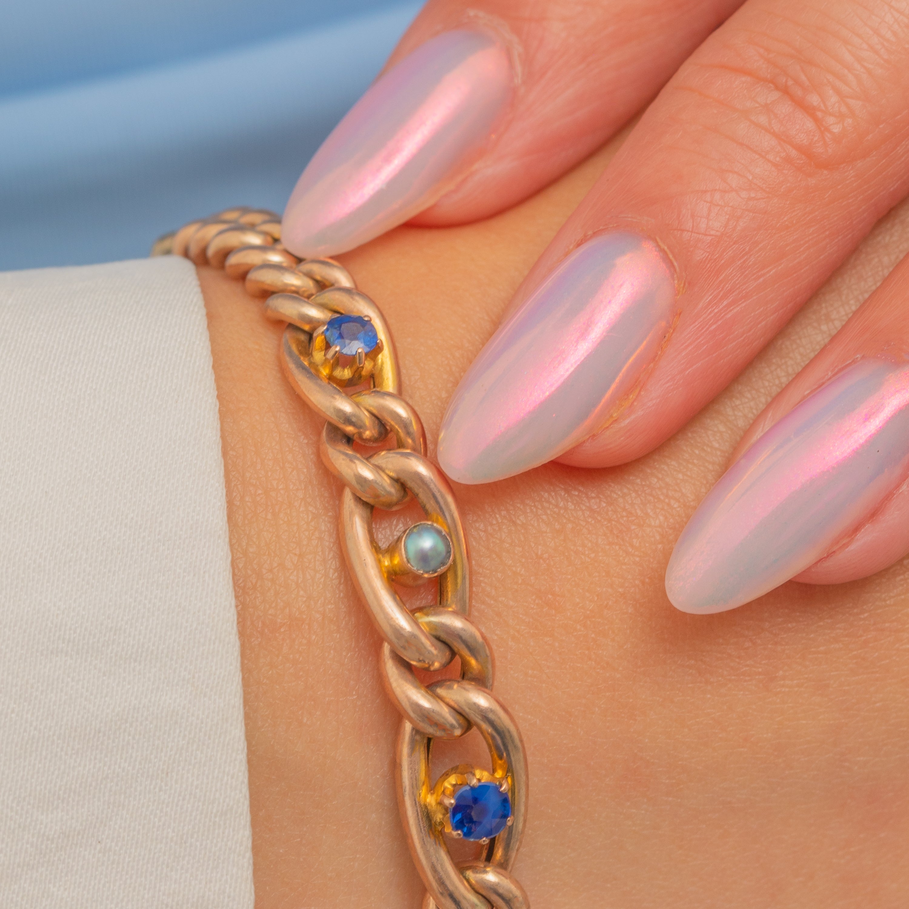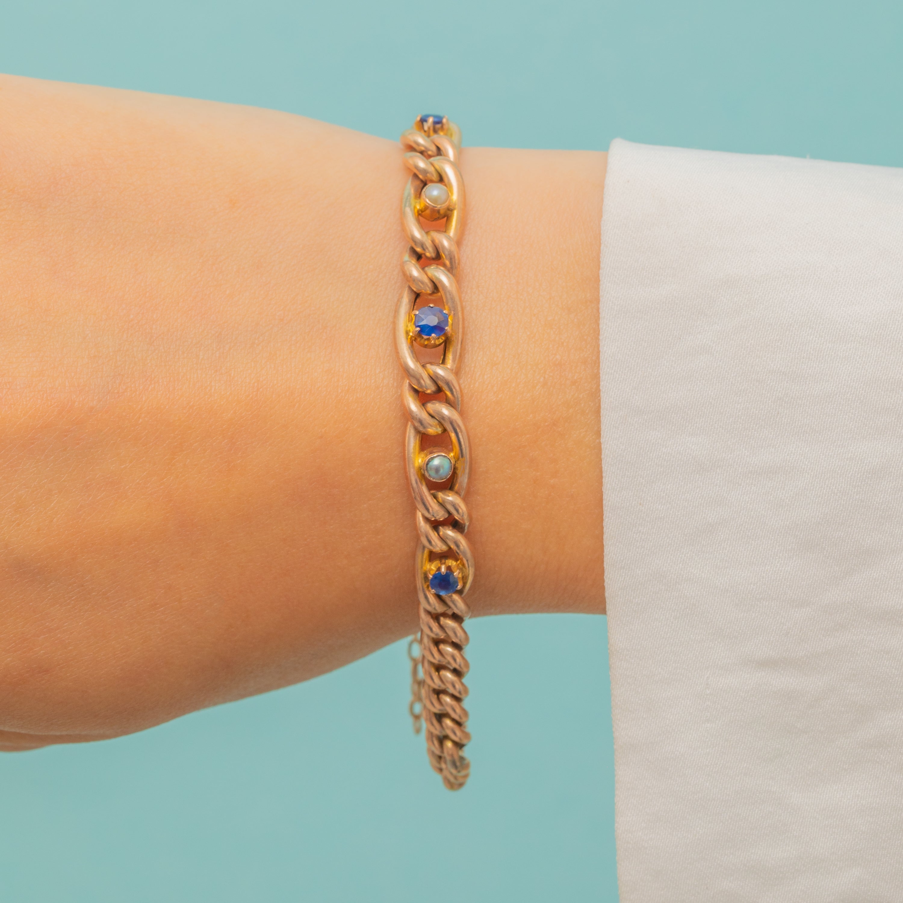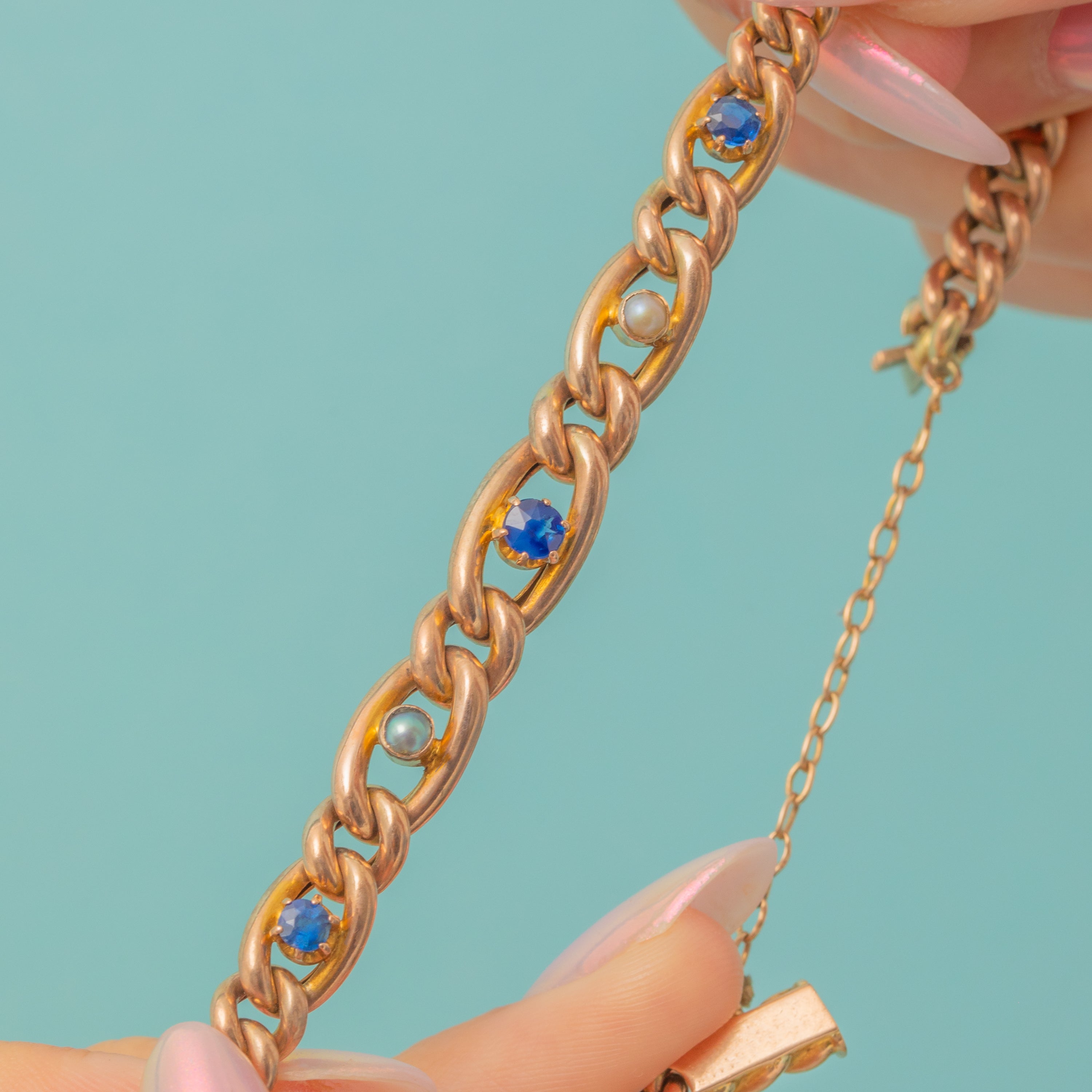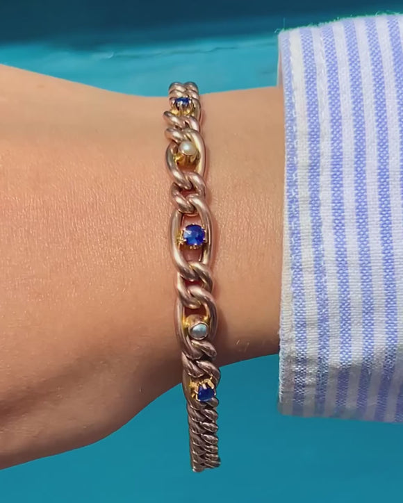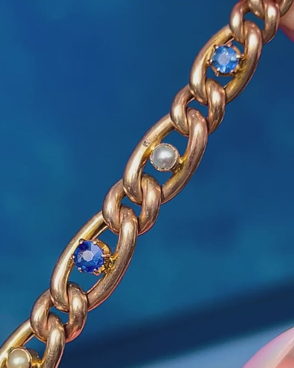 Victorian 9ct Gold Sapphire Pearl Curb Link Bracelet