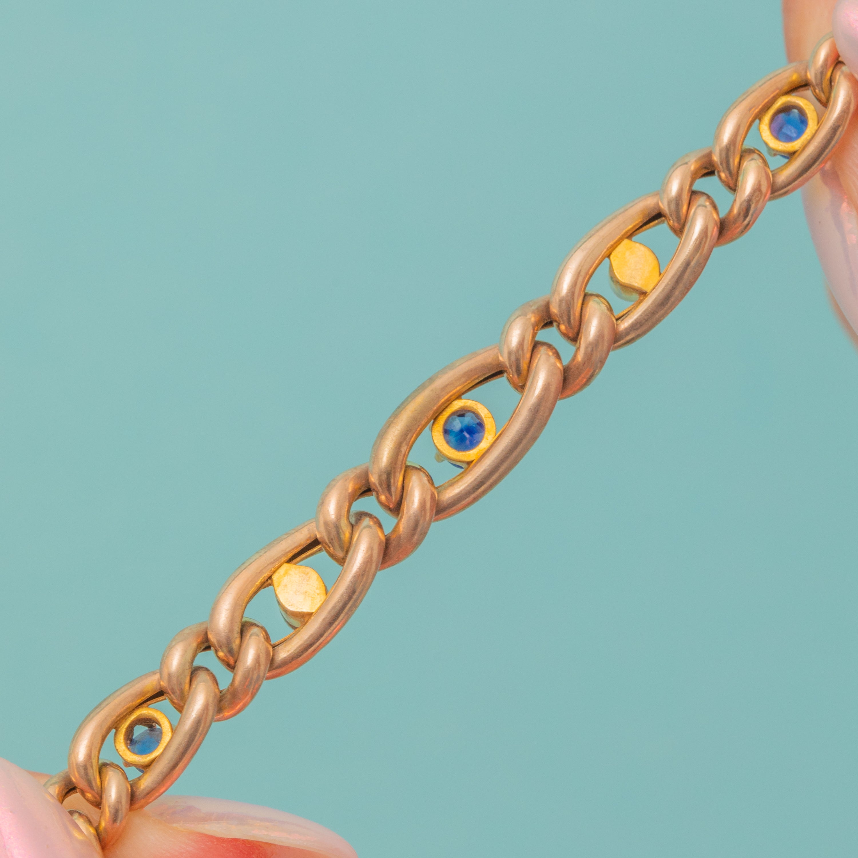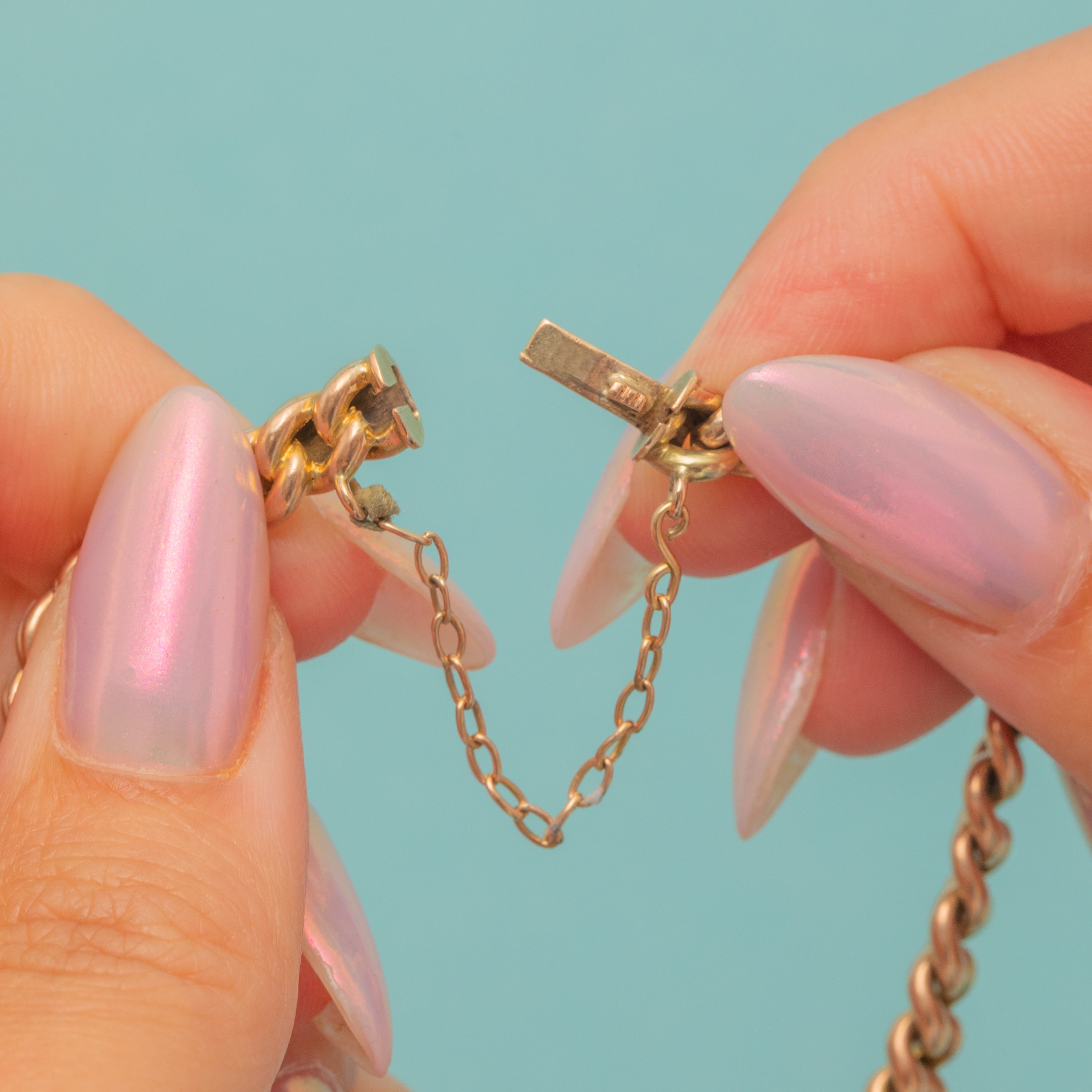 EXCELLENT: The Gold is warm, with a gorgeous rosy hue, and each link is securely connected, with only some minor spots of discolouration. The gems are all present and are securely set. With its clasp in perfect working condition and complete with a safety chain, you can wear this Victorian bracelet with utmost confidence!