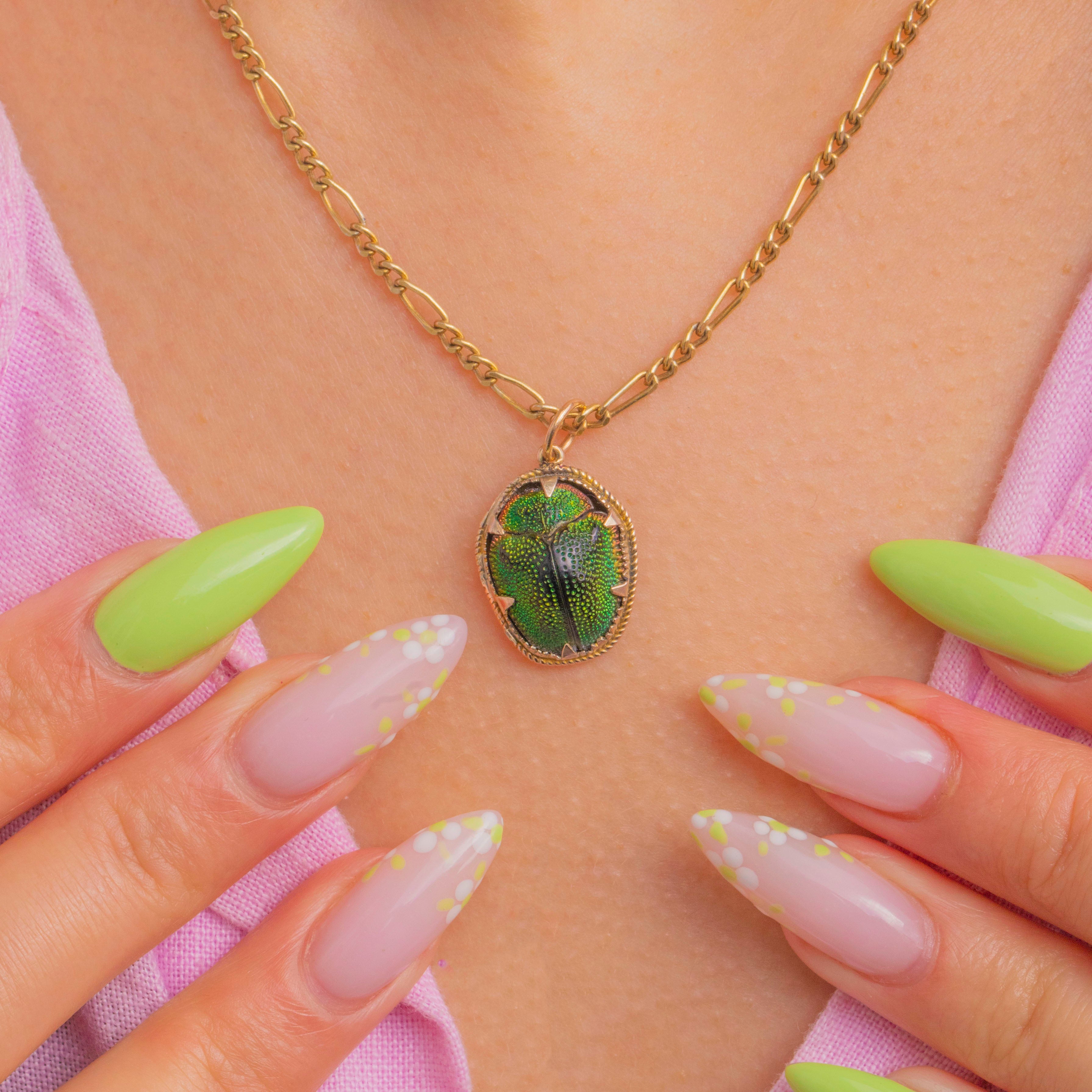 This Victorian 9ct Gold Scarab beetle charm captures nature’s iridescence in a petite, wearable jewel. An oval domed Scarab shimmers in vibrant green, framed by a twisted-rope border and held securely with neat claw prongs for a refined finish. A jump ring completes the design, ready to slip onto your favourite chain or charm bracelet.