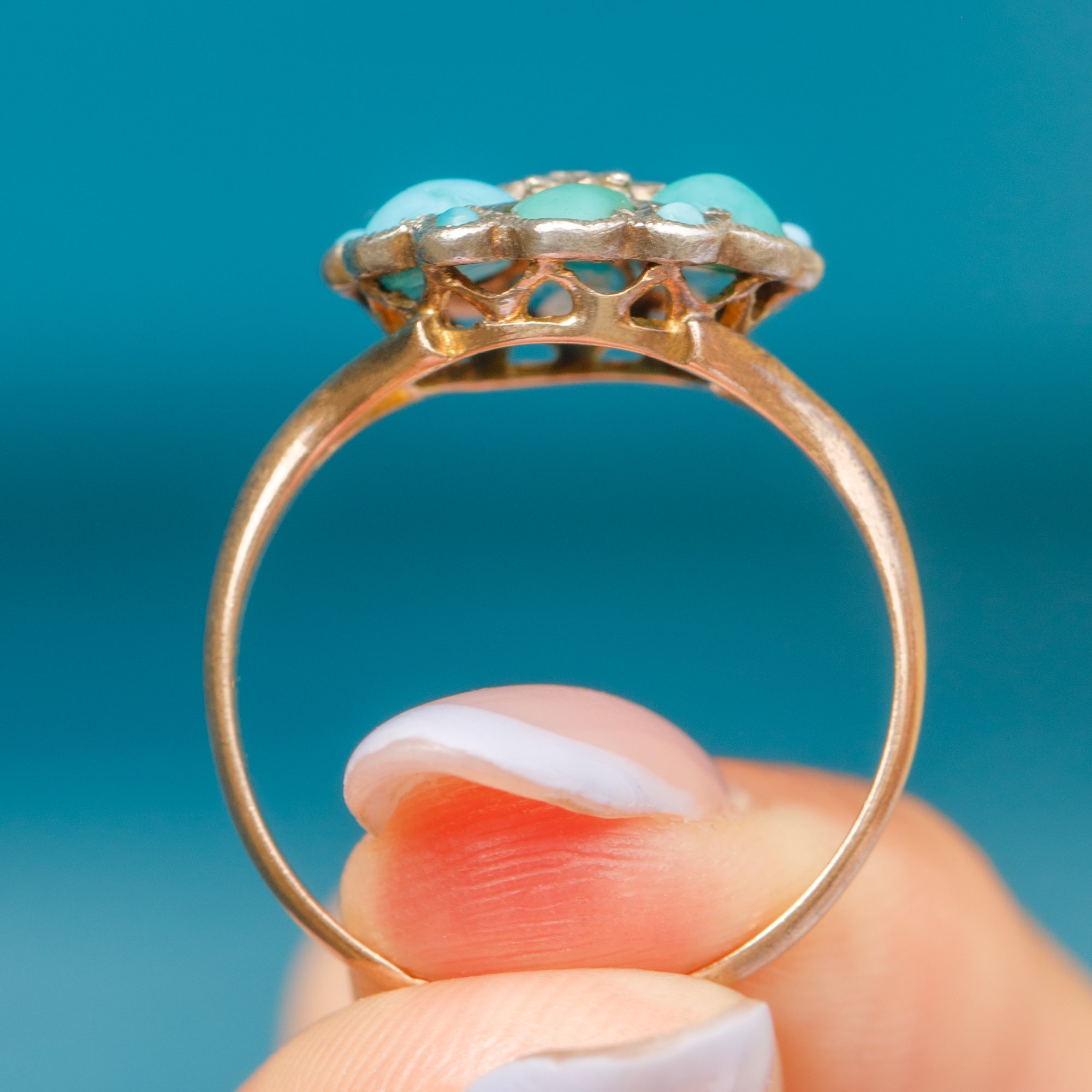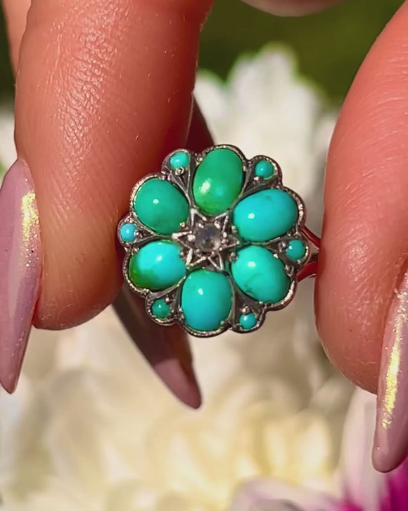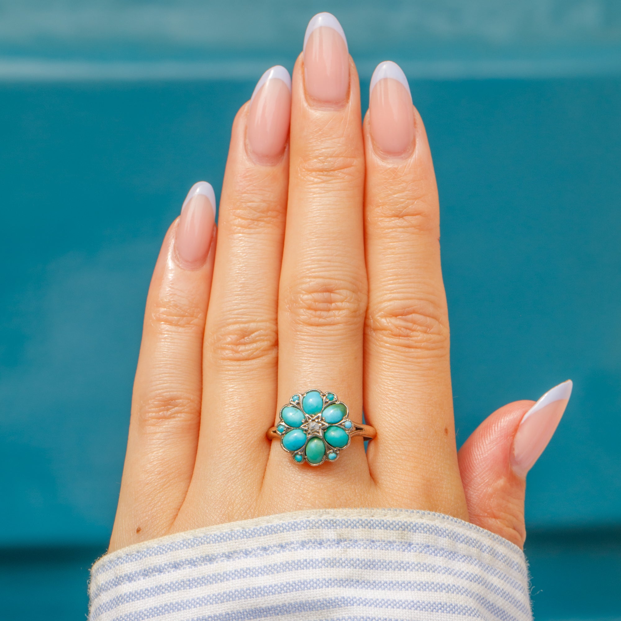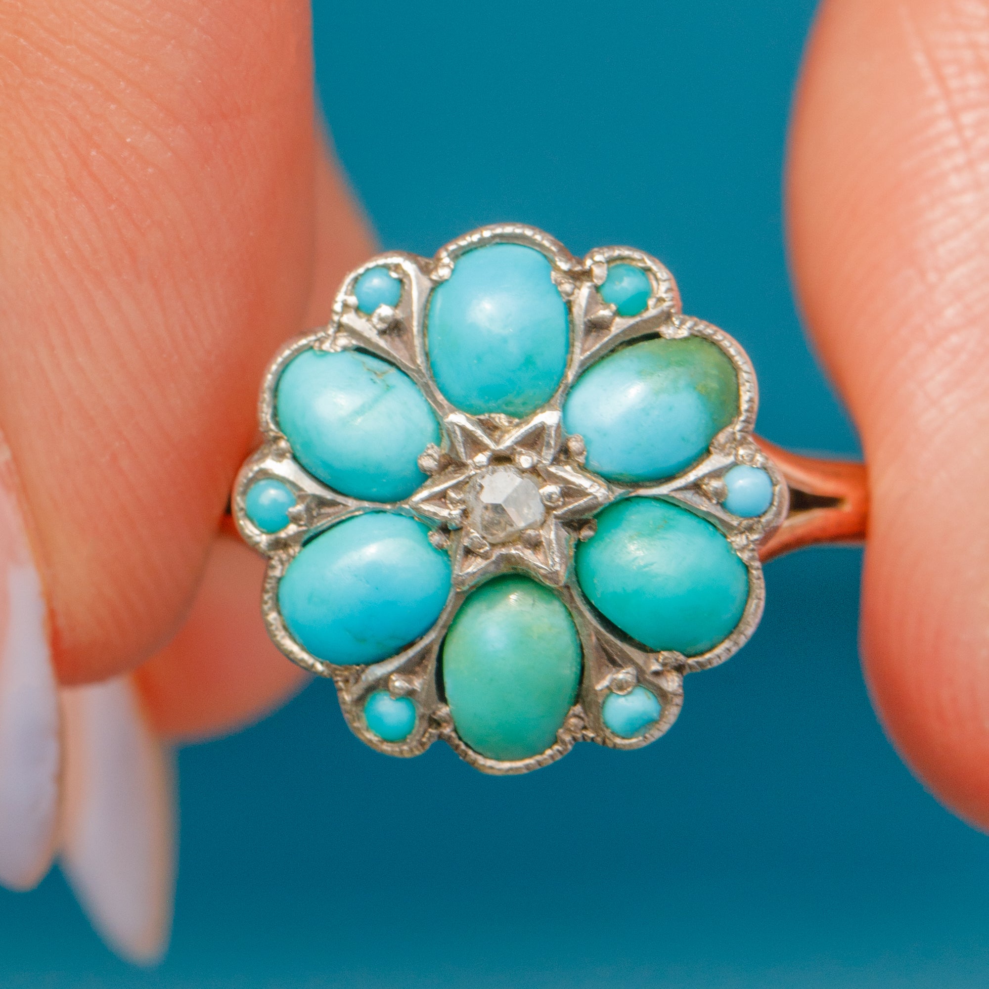 Crafted from rosy 9ct Gold, her large ring face has been formed into an adorable floral motif, with a central scintillating rose-cut Diamond surrounded by vibrant Turquoise petals. Each Turquoise stone has a distinct azure and green tone, giving this Victorian cluster ring a lovely, unique charm.