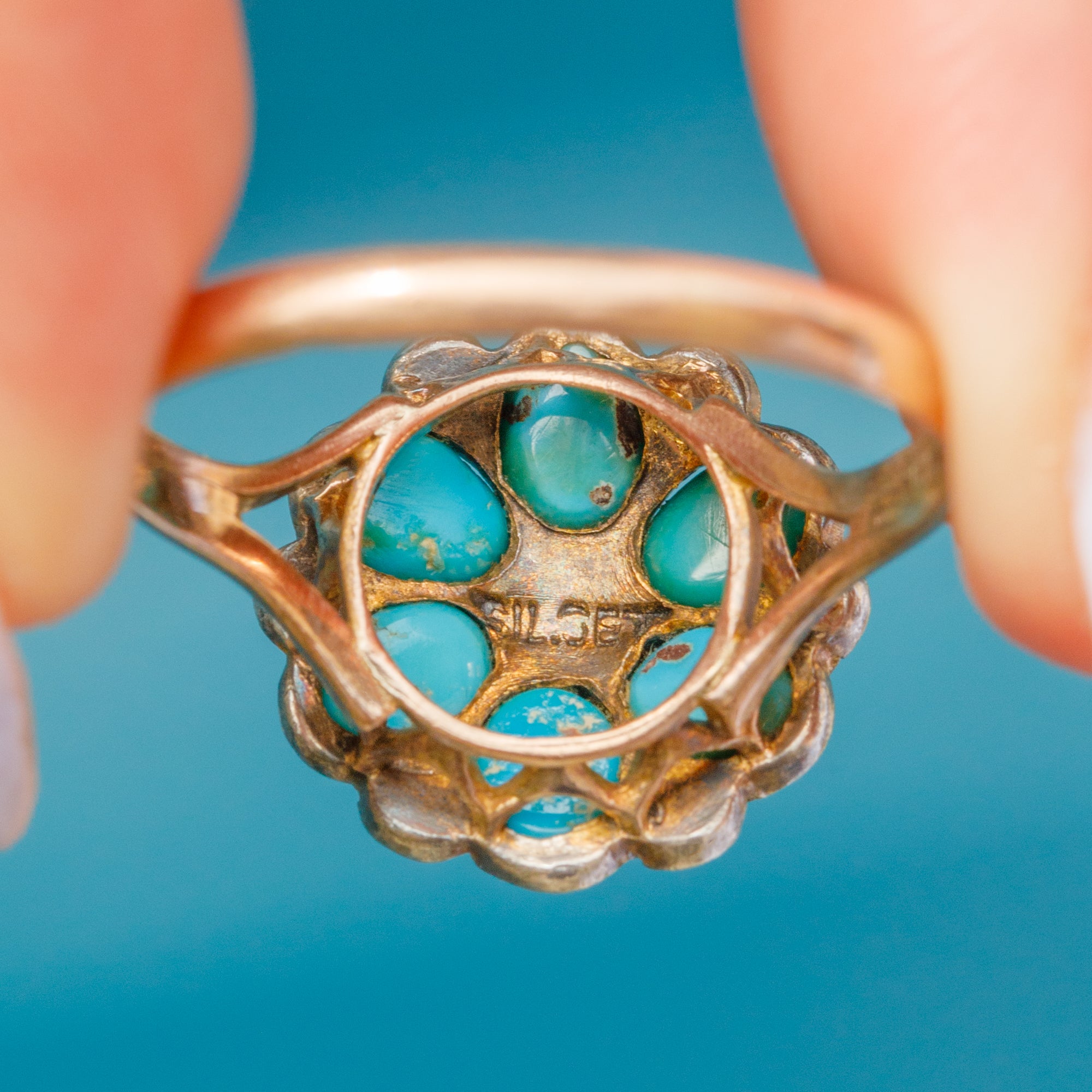 This antique 9ct Gold Turquoise Diamond cluster ring is a stand-out piece!