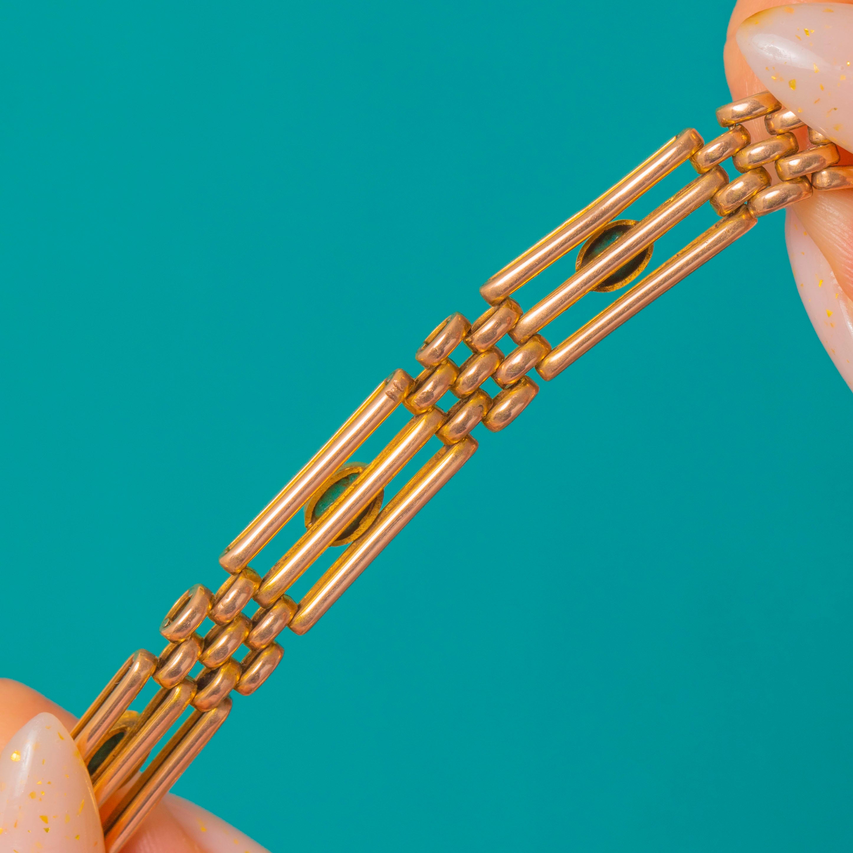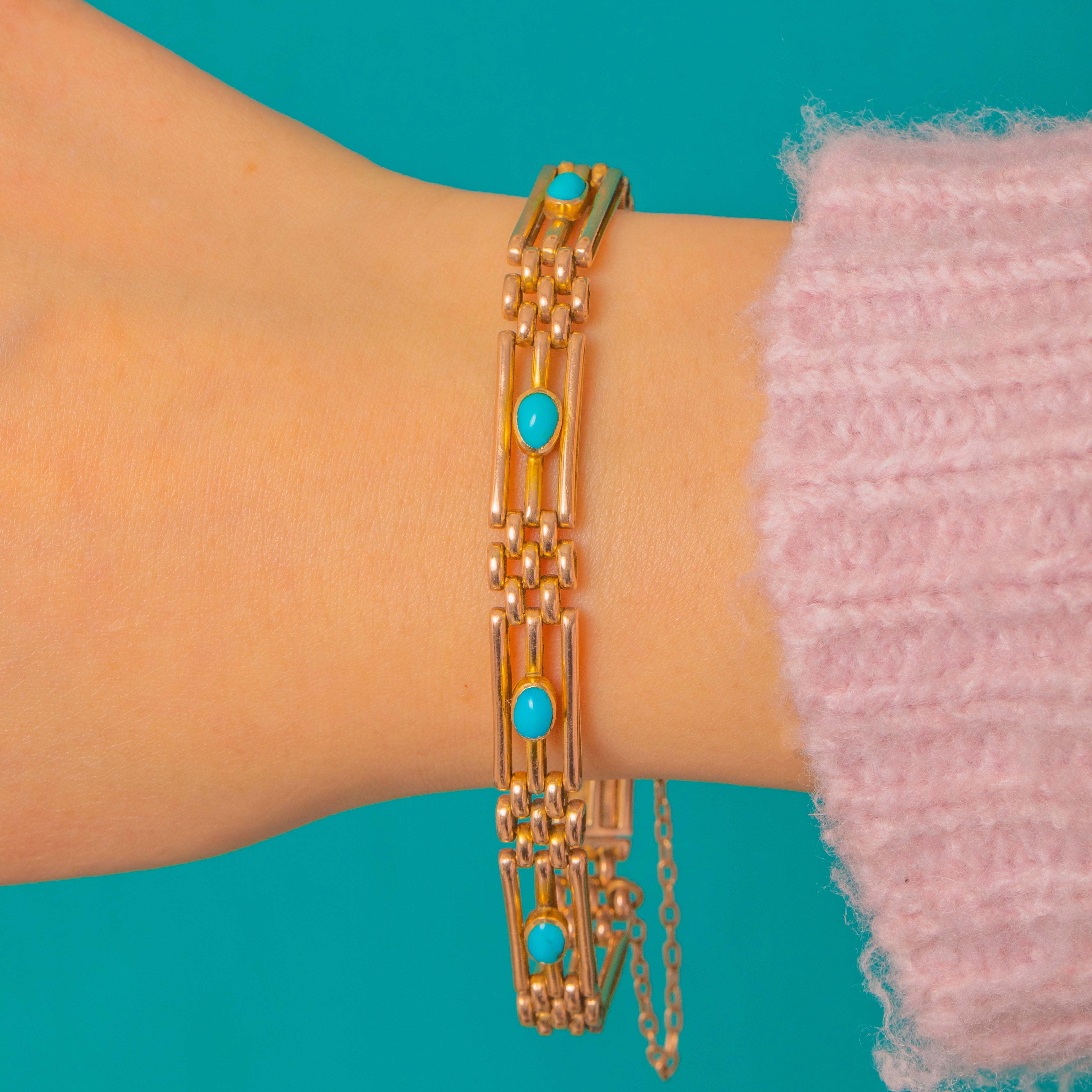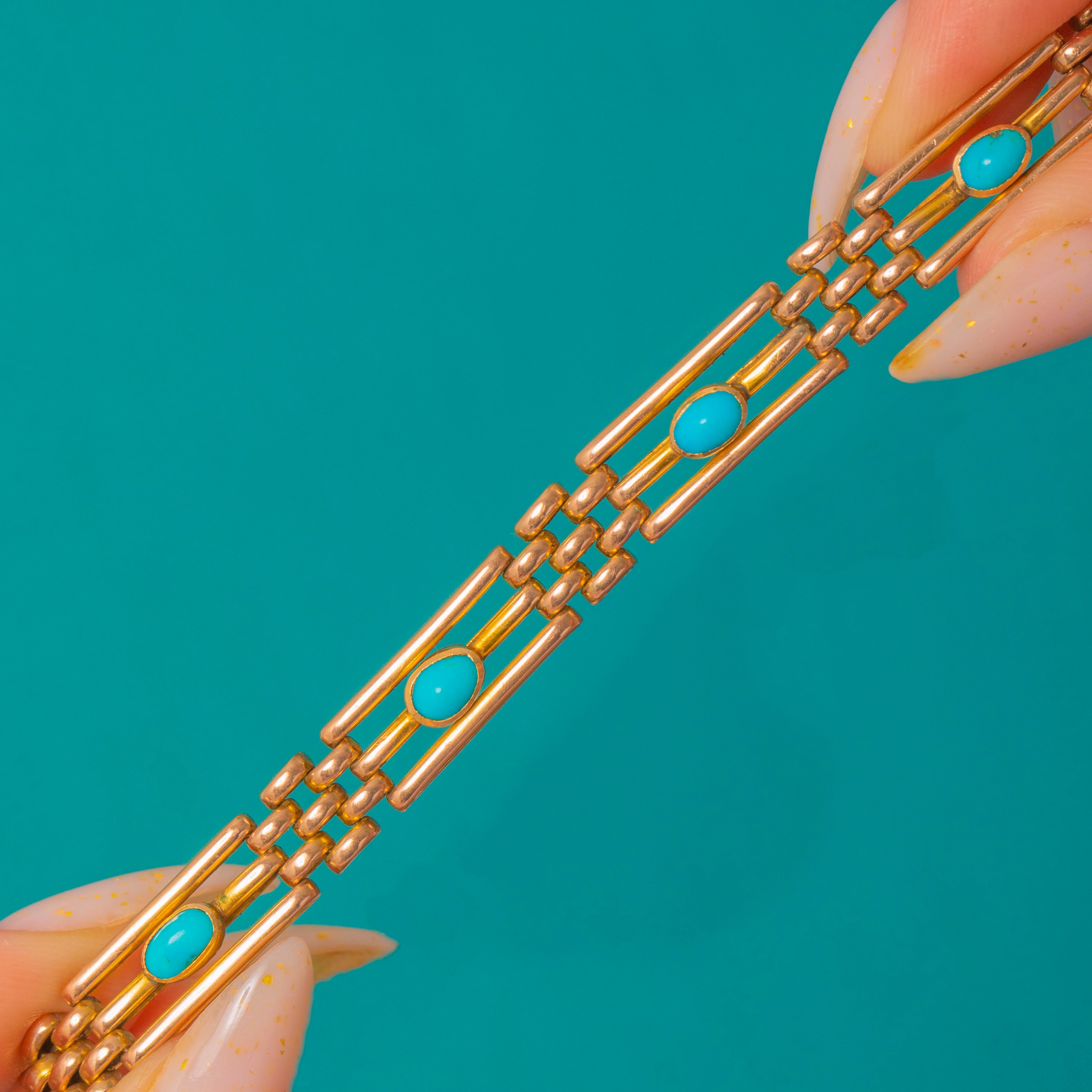 A sleek Victorian gate bracelet finished in warm 9ct Gold, set with a string of bright turquoise cabochons.