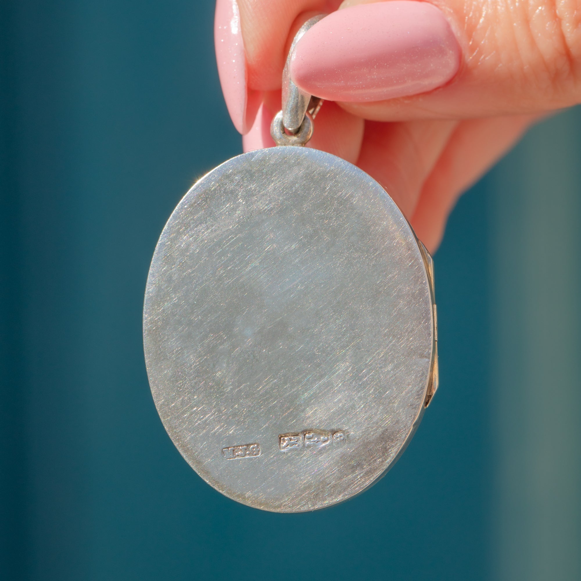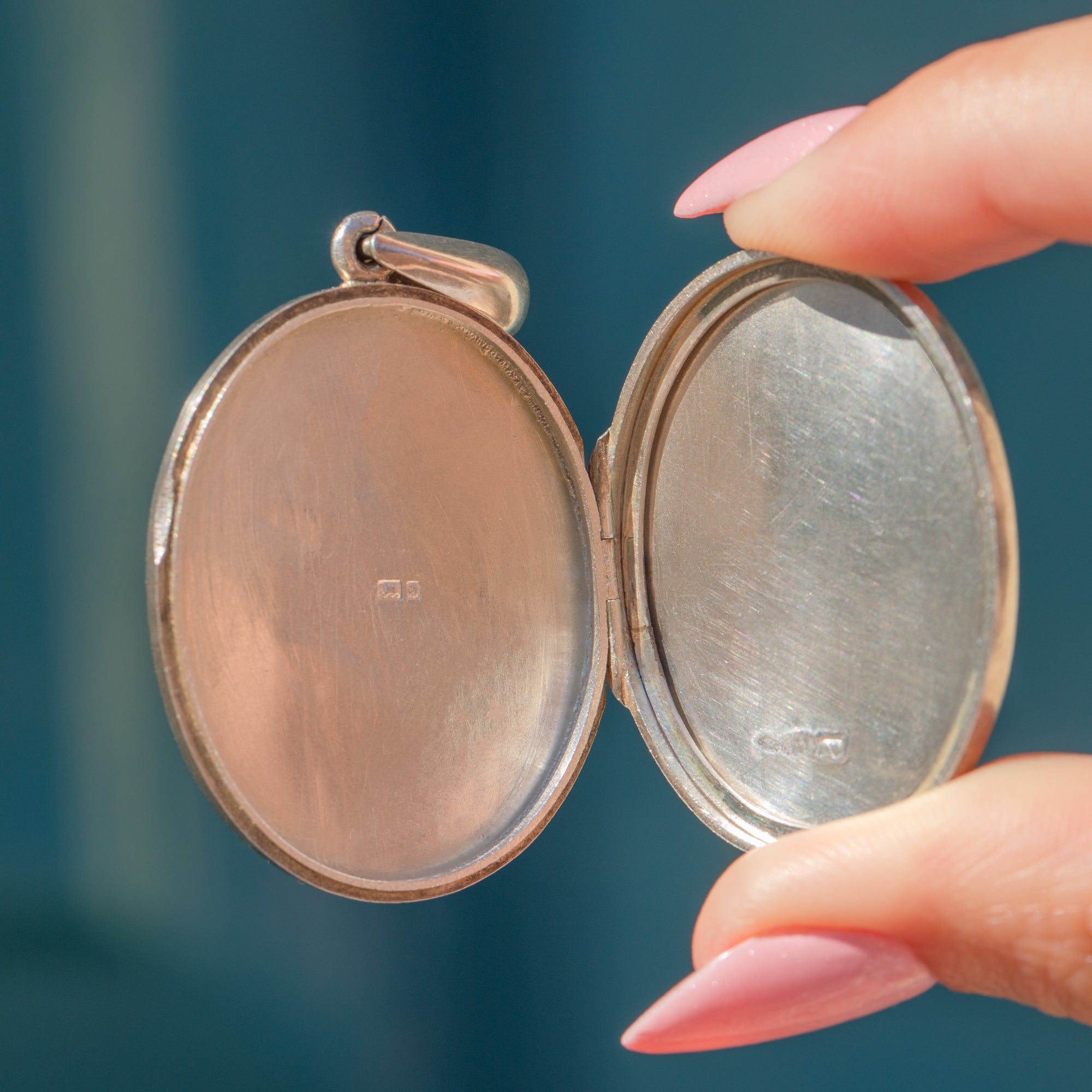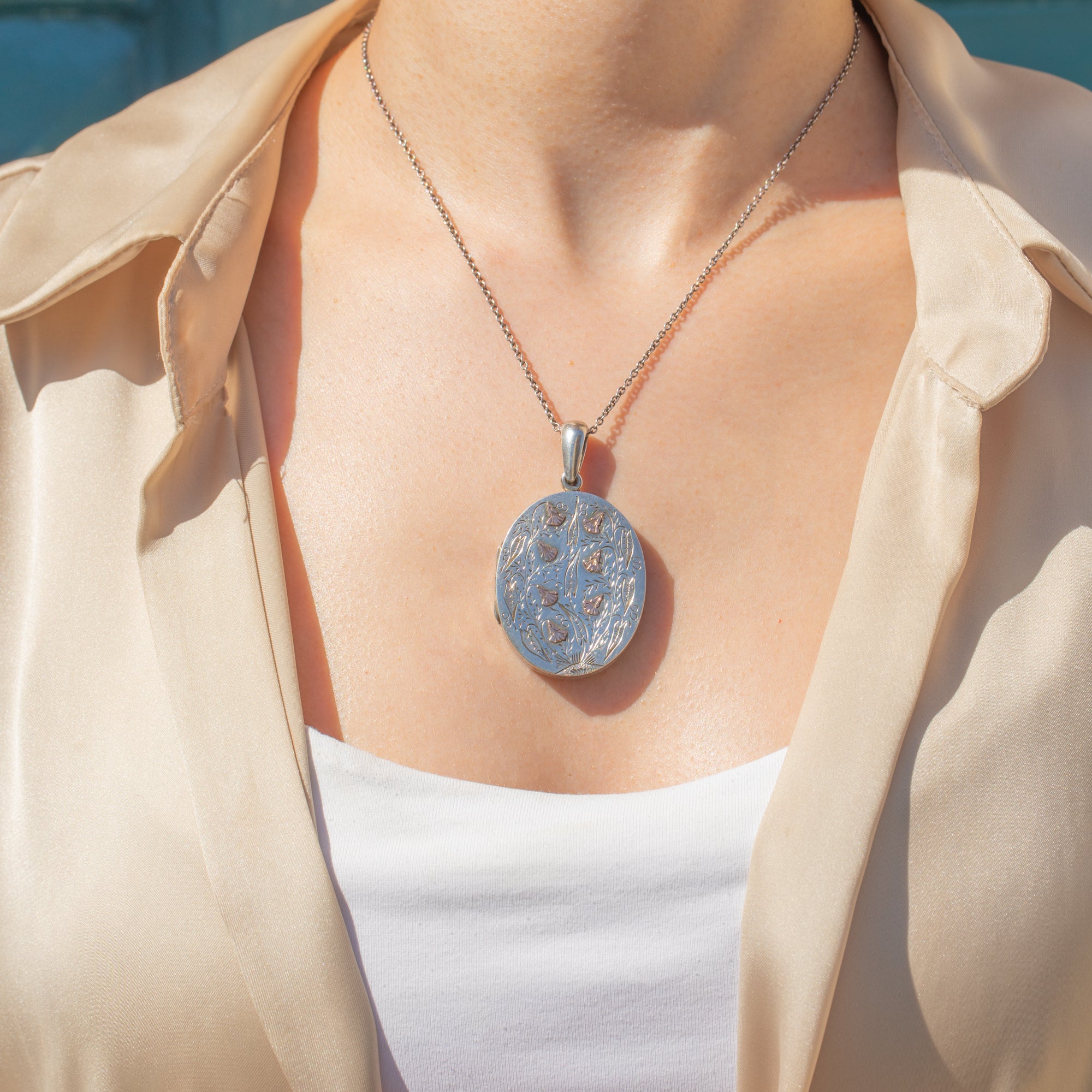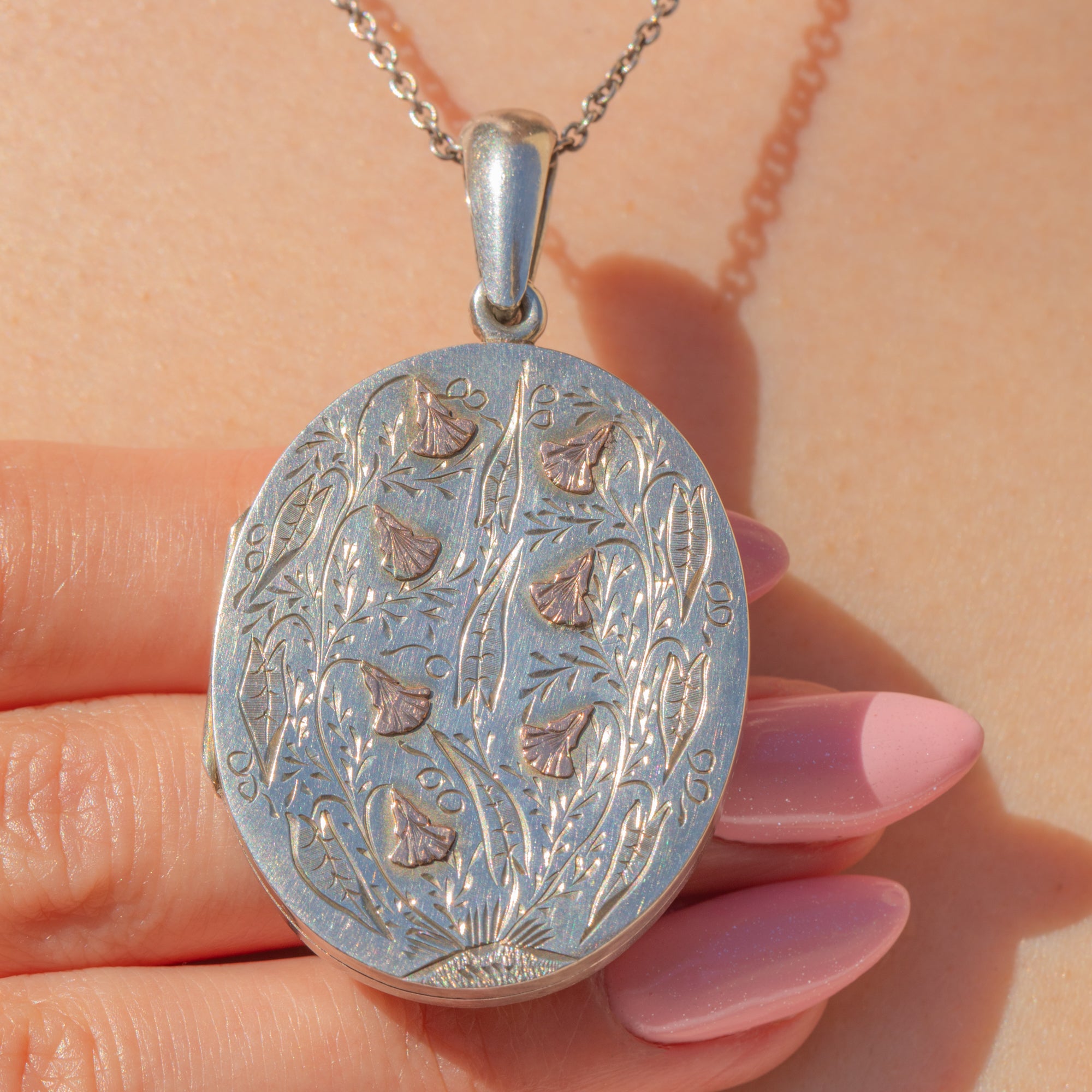 This Victorian Aesthetic Silver & 9ct Gold flower locket will look resplendent adorning your décolletage! Crafted from Sterling Silver and decorated with ornate foliate engravings and 9ct Rose Gold white trumpet flowers, this antique locket is steeped in romantic sentiment.
