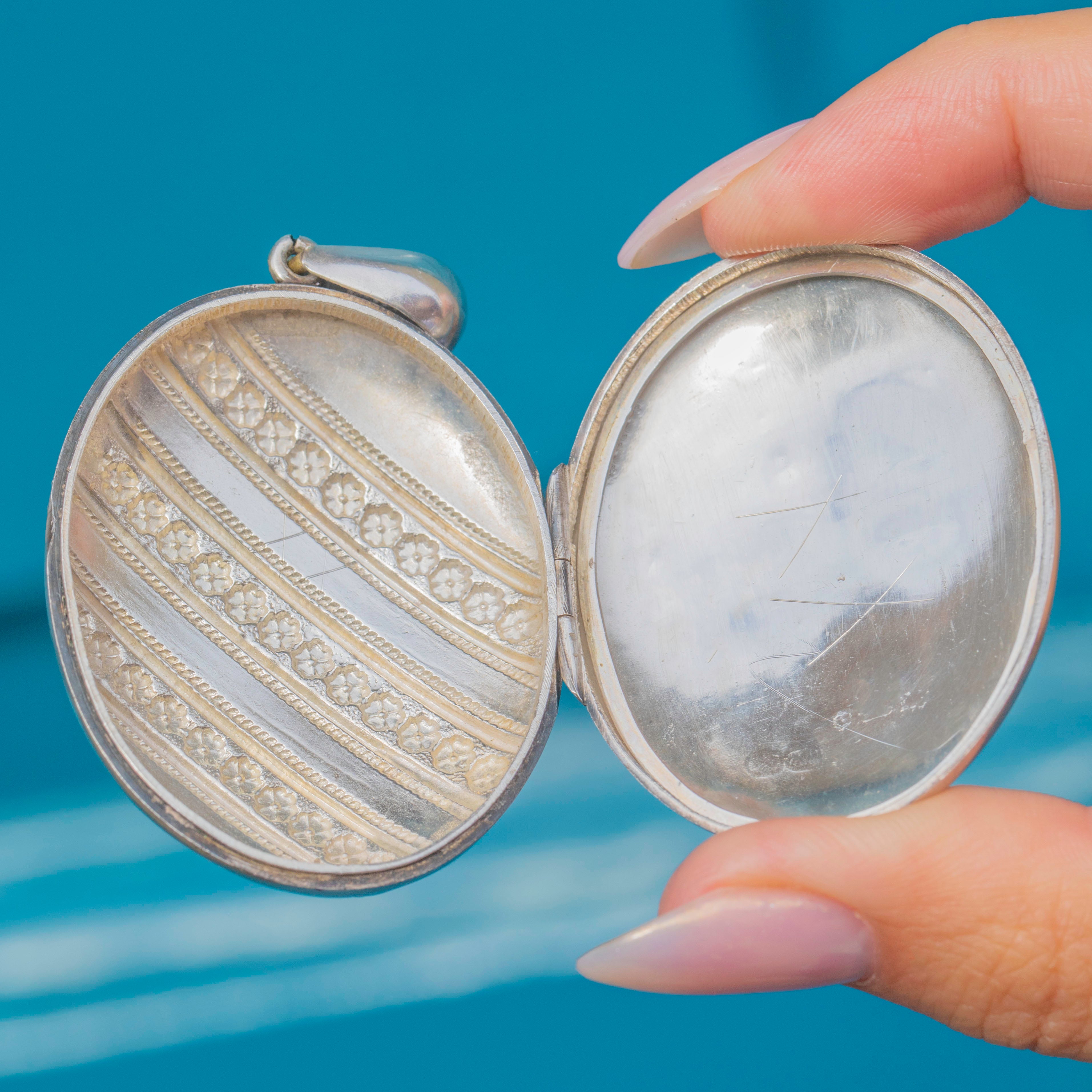 This large antique Silver locket is adorned by floral details, a quintessential Victorian motif which provides a lovely texture and depth. It is fully hallmarked and dated to 1880.
