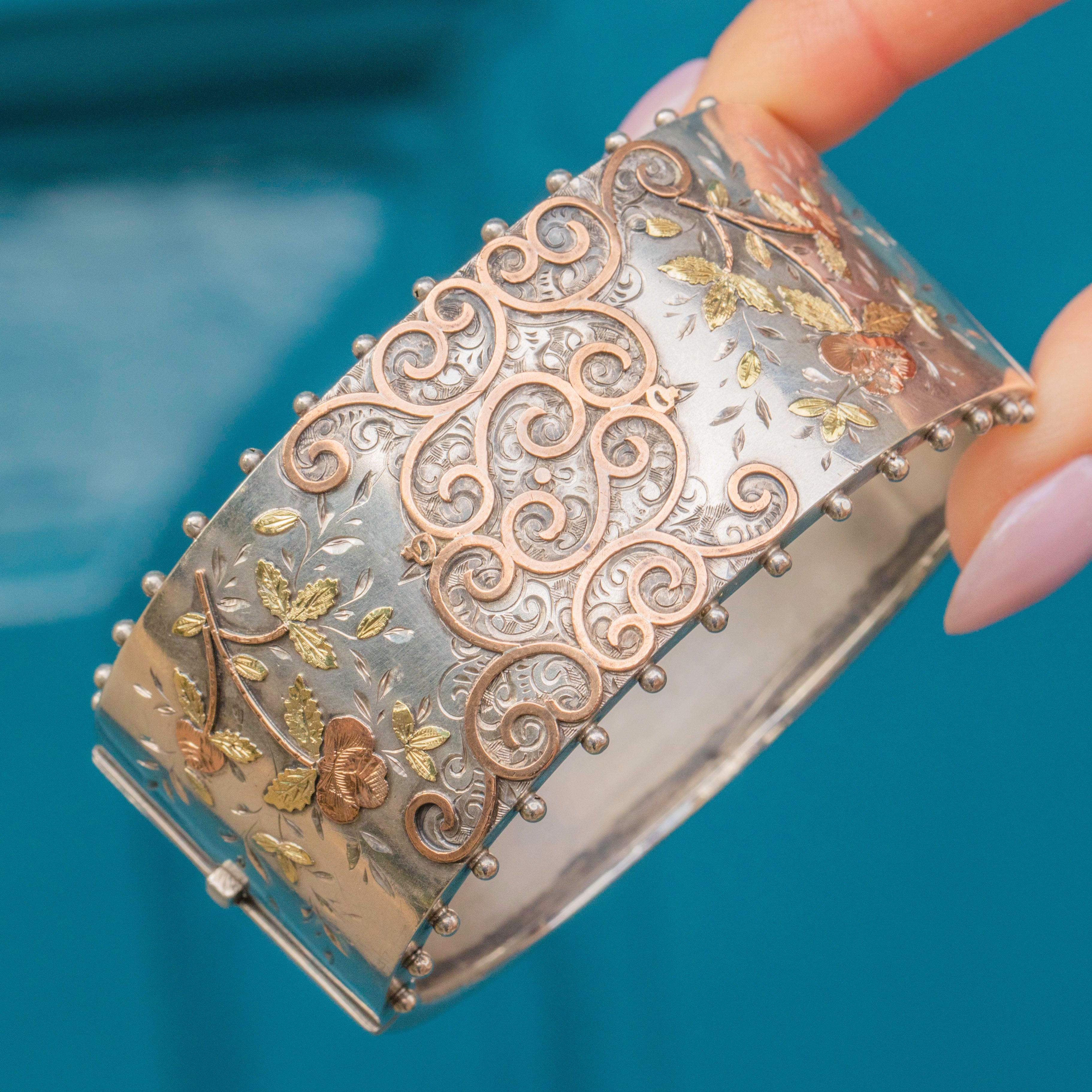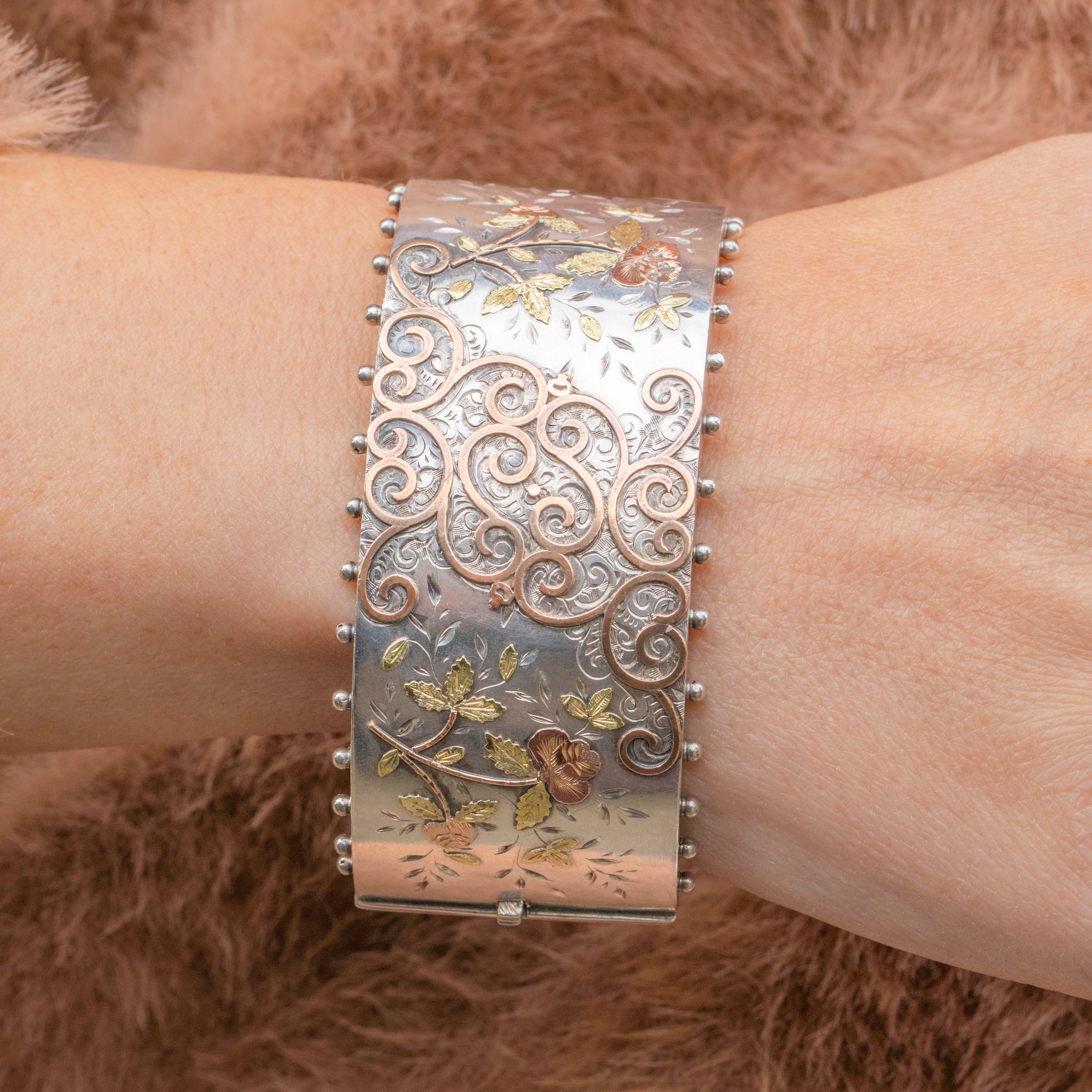 This Victorian Aesthetic Silver and Gold roses bangle is a flourishing garden of details! Her front is adorned with curvaceous Rose Gold accents akin to vines, flanked by two blooming roses with yellow Gold details creating a striking contrast.