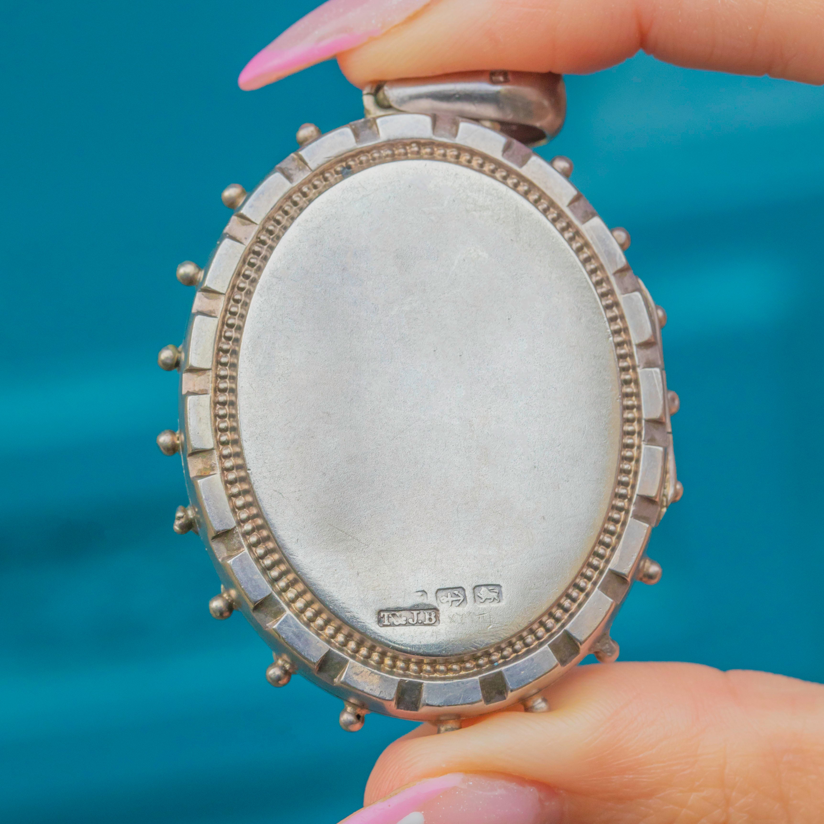 HALLMARKS: On back of locket: Maker's Mark "T&J.B", Birmingham Assay, Lion Passant, worn date letter which we believe to have once been an "f", dating this locket back to 1880.