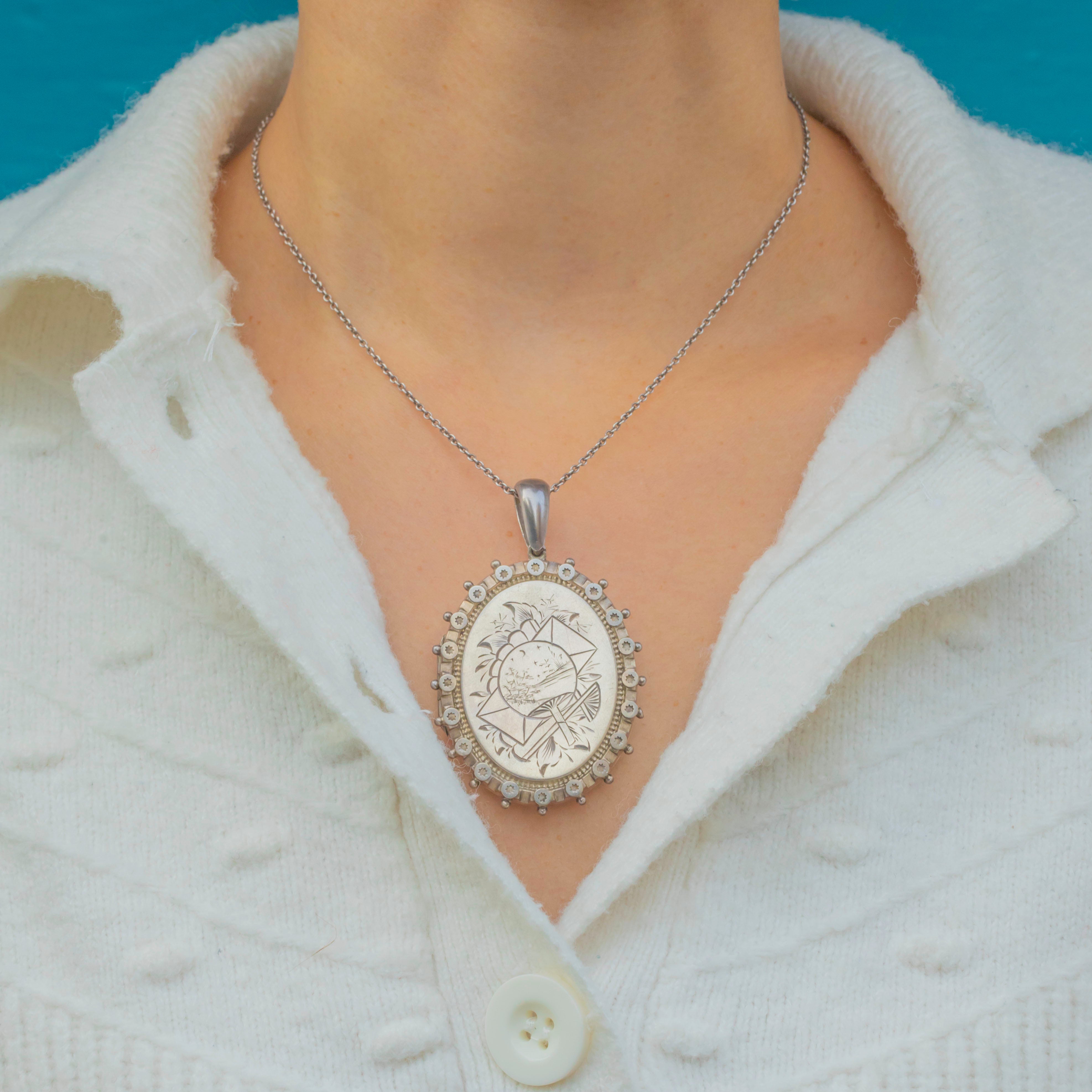 This striking Victorian aesthetic Sterling Silver locket is the perfect statement piece for women who love to stand out from the crowd! Featuring a unique motif of an East-Asian pastoral scene inscribed onto a fan, this antique locket is crafted entirely from Sterling Silver.