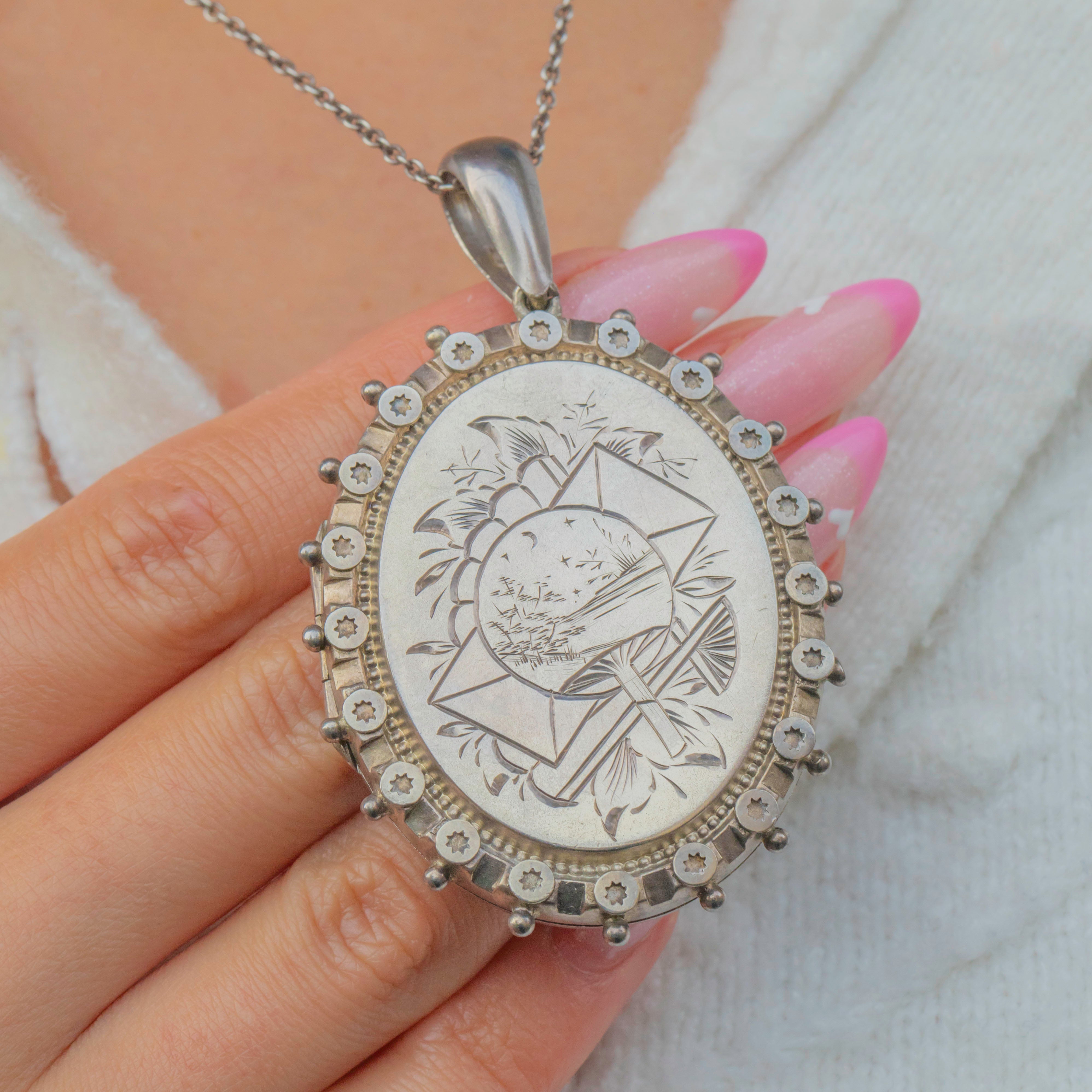 We love the unique design on the front of the locket, as well as the halo of sliced celestial-pierced features and beaded edge, typical of Victorian Aesthetic jewels.