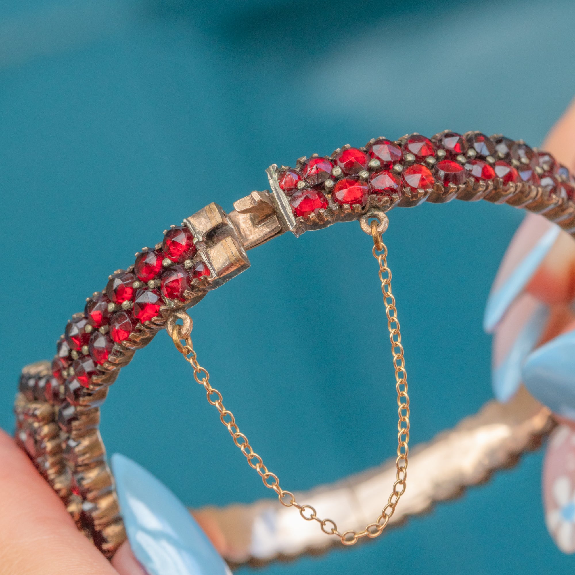 EXCELLENT: Each Garnet is radiant and set securely. The bangle closes securely and with a safety chain for added security, you can wear this Victorian piece with utmost confidence.