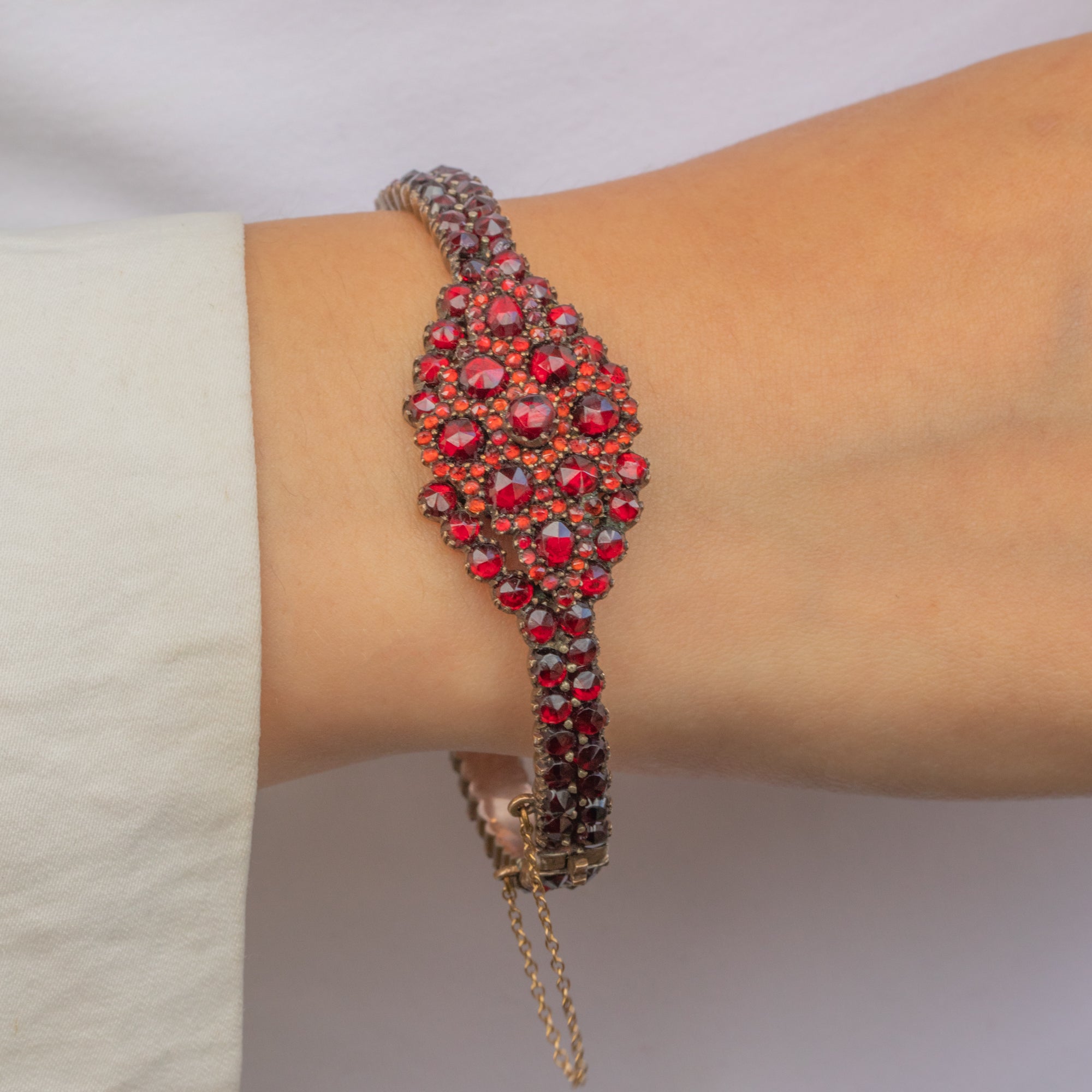 The rose-cut Garnets are meticulously arranged into a central layered flower formation, making this antique piece an exemplar of Victorian craftsmanship. Set in Garnet Gold, this elegant bangle will make a resplendent addition to your collection.