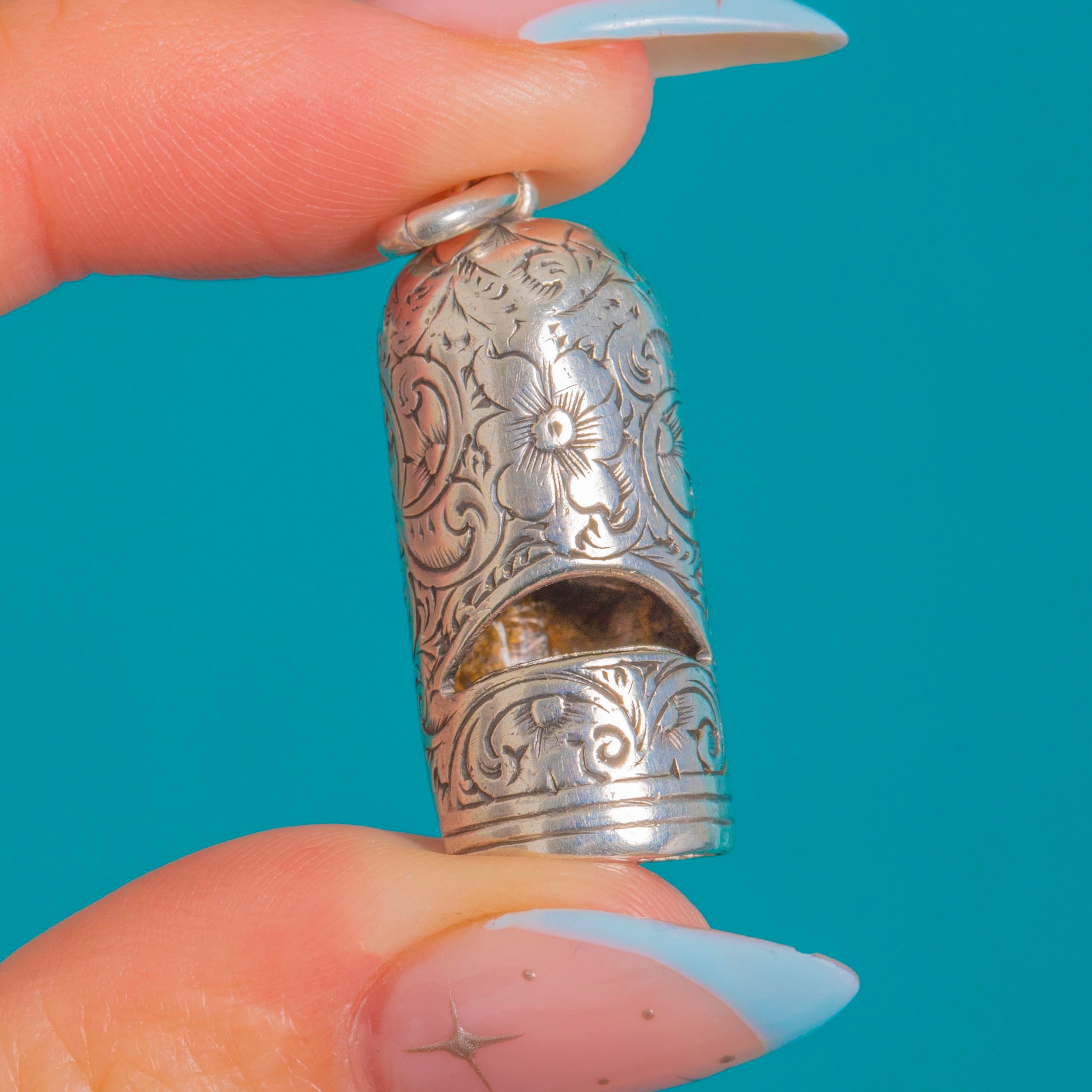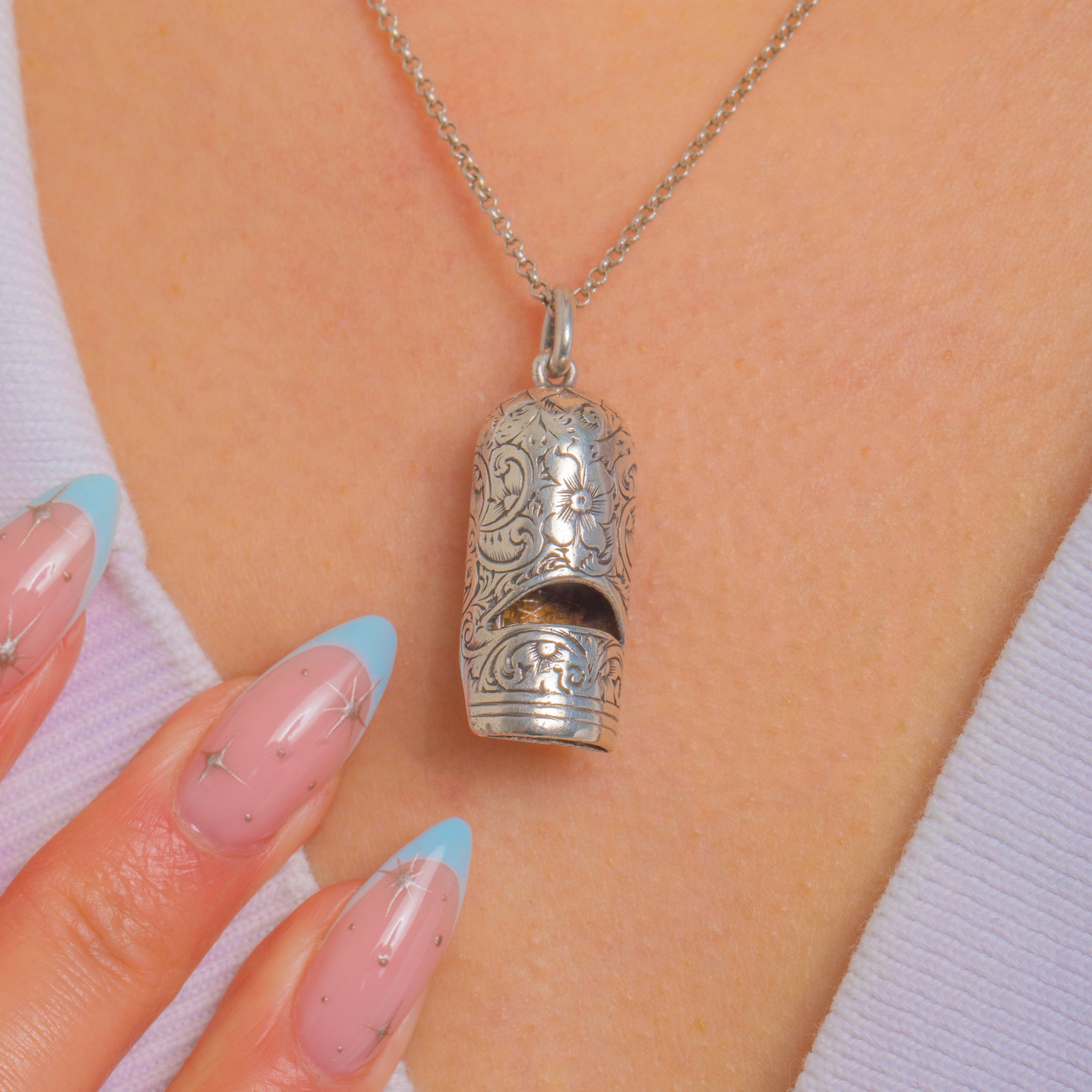 An ornate Victorian novelty with a practical twist, this Fine Silver whistle pendant is richly hand-engraved with scrolling foliage and tiny flowers across its tubular body and domed cap. The bright-cut work dances with light, while gentle patina in the recesses lends beautiful depth and character.