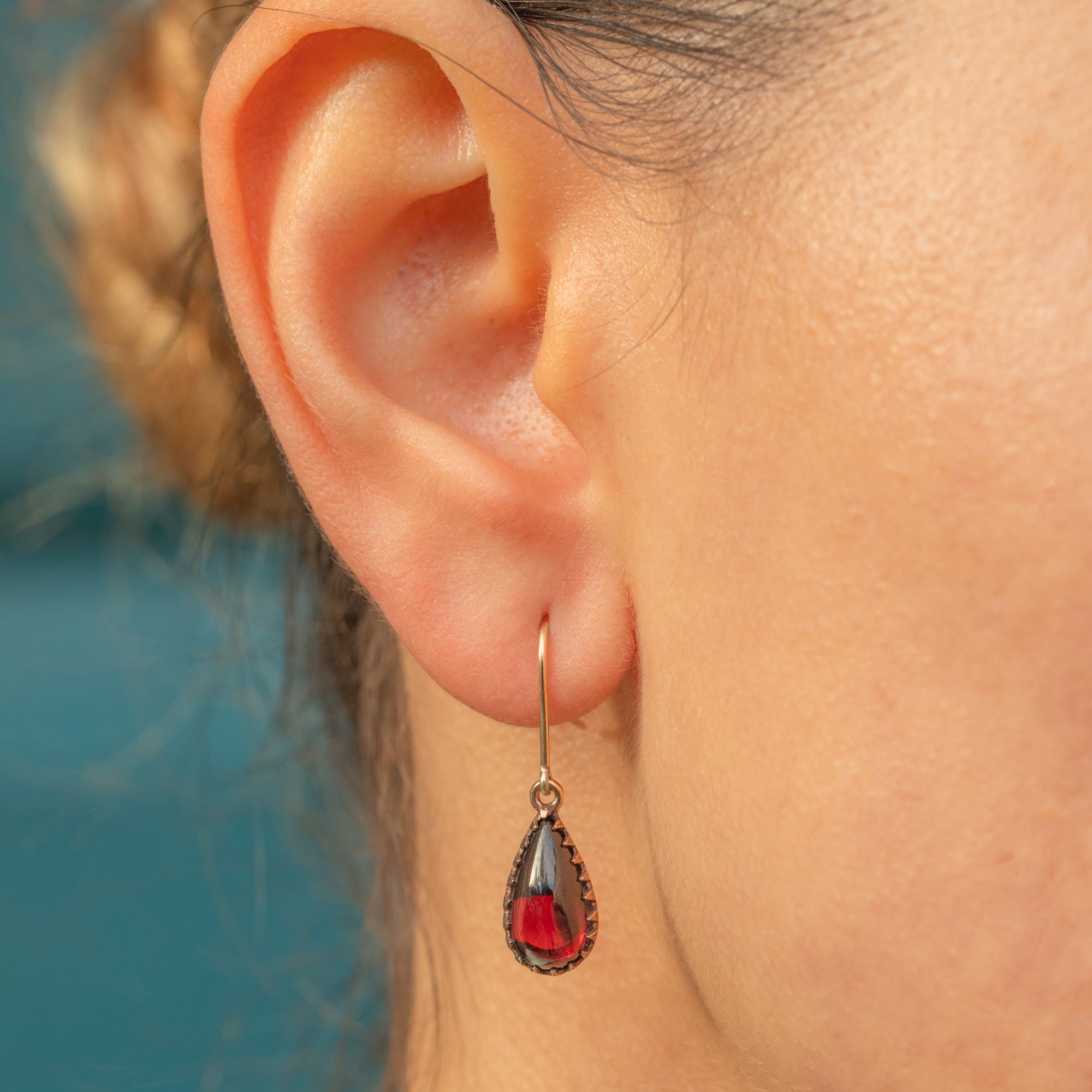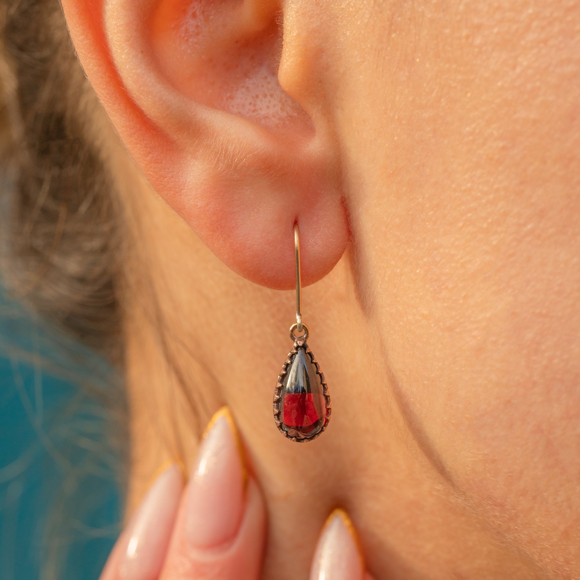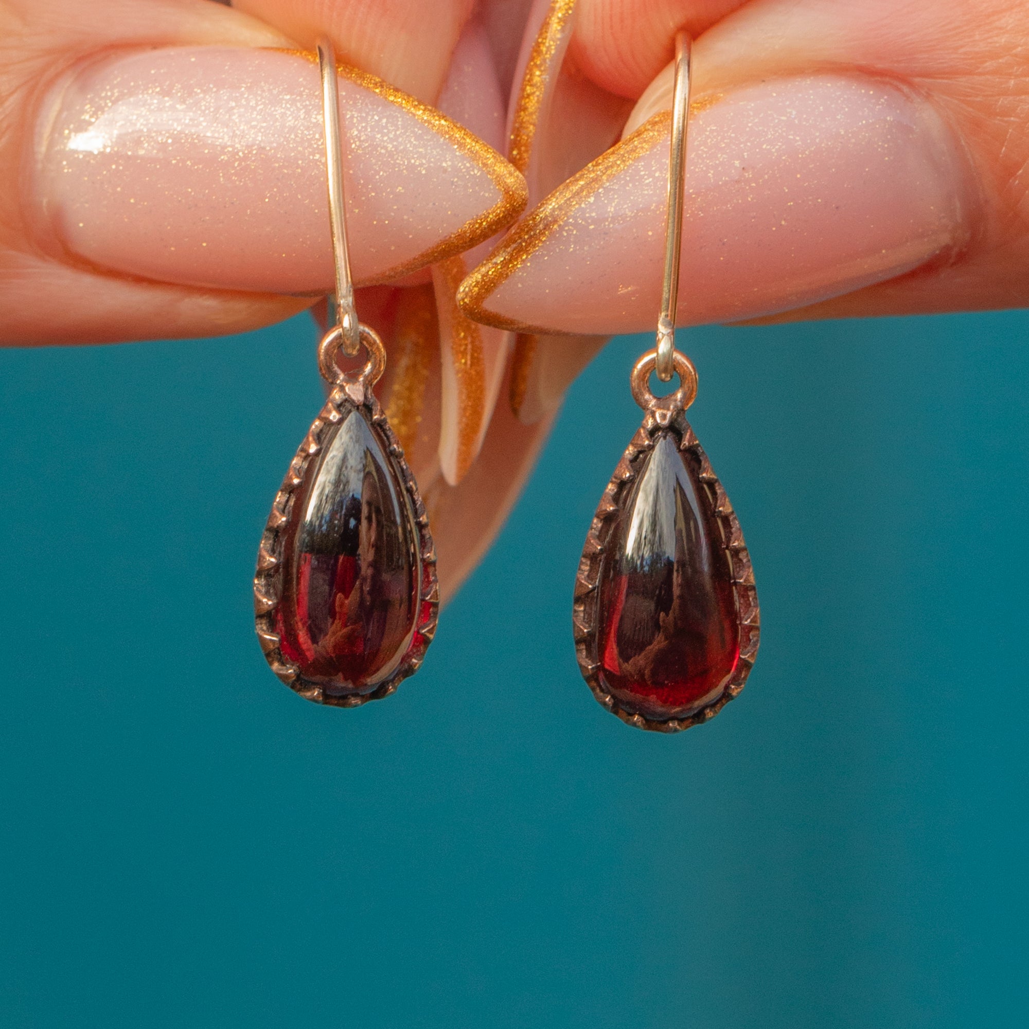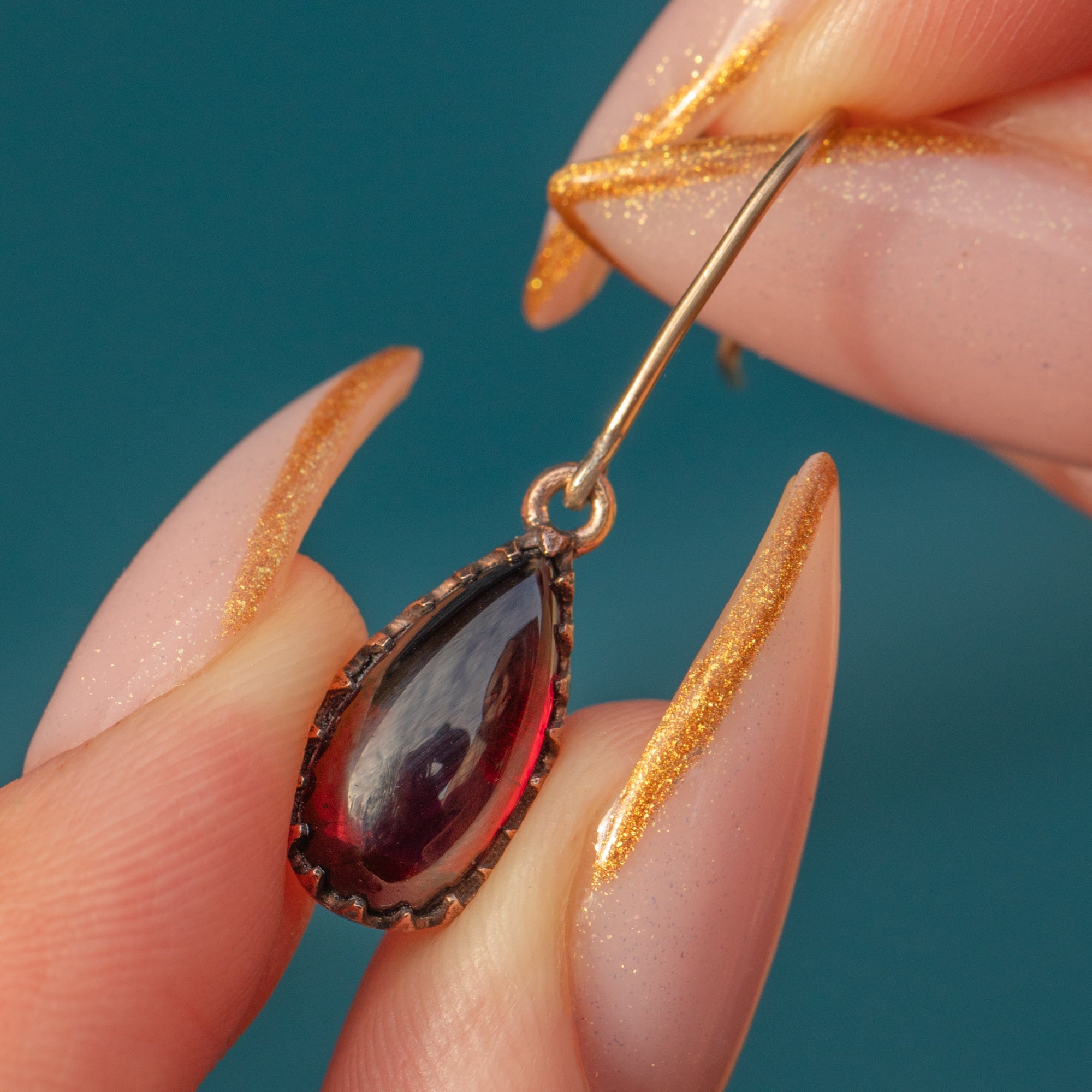 Glowing with deep cherry-red tones, these Victorian Garnet drop earrings are the perfect everyday touch of antique romance. Each earring features a smooth teardrop Garnet cabochon, its rich colour intensified by the domed, polished surface that catches the light beautifully.