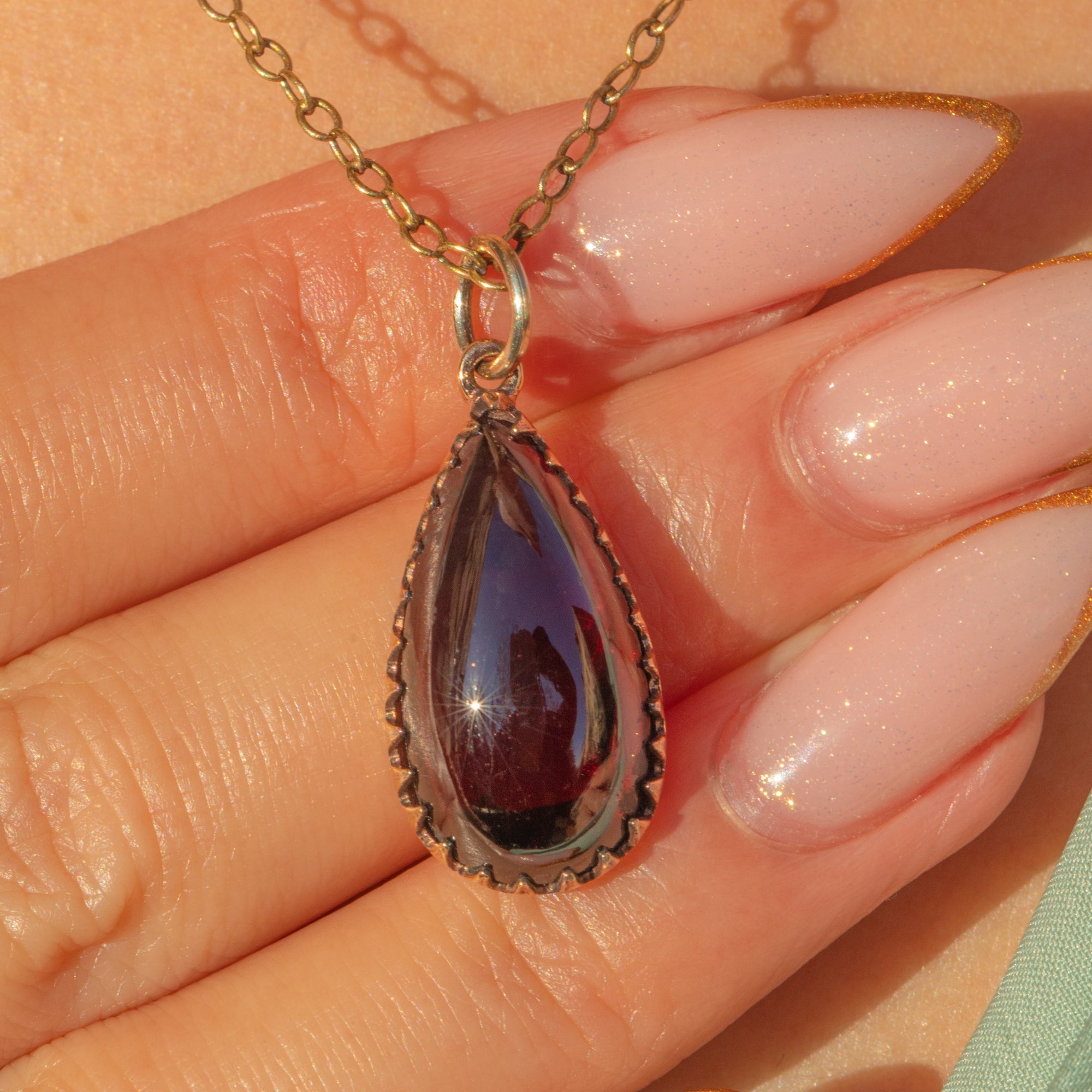 This Victorian Garnet teardrop charm is a richly coloured little treasure, set with a glossy cabochon Garnet in warm Garnet Gold and finished with a 9ct Gold jump ring, so it’s ready to wear. The elongated pear-shaped stone has beautiful presence for its size, with a deep red hue and smooth domed surface that glows in the light.