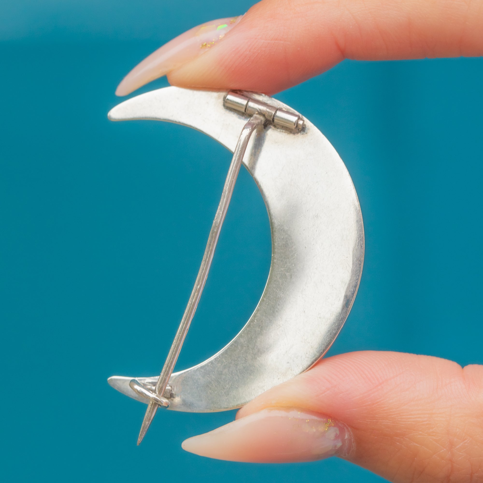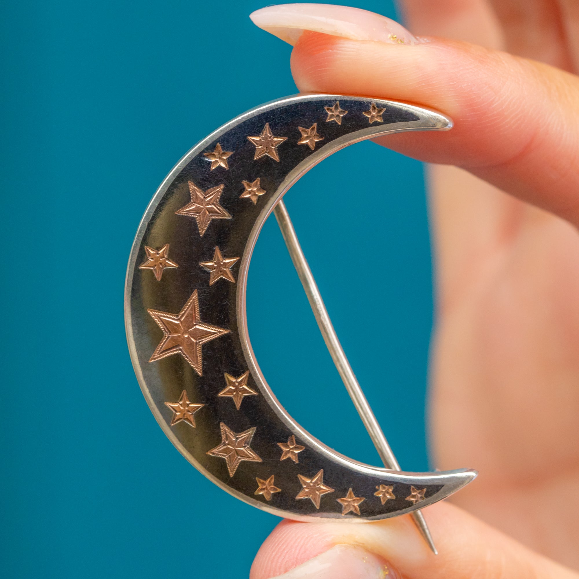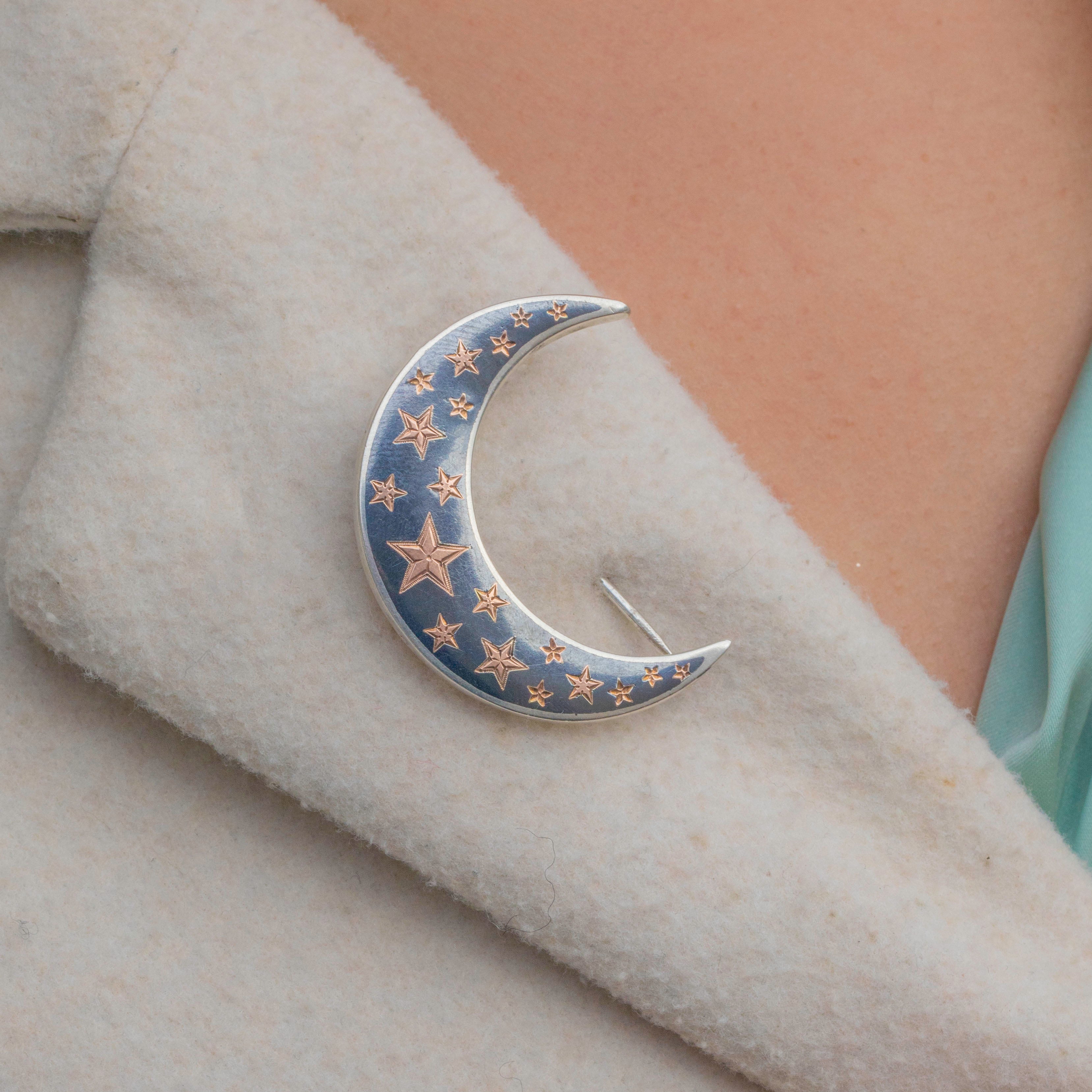 This Victorian brooch is a striking example of Niello work, crafted in Silver with Rose Gold highlights. The piece is decorated with a celestial motif of crescent moons and stars, a symbolic and fashionable design of the late 19th century.