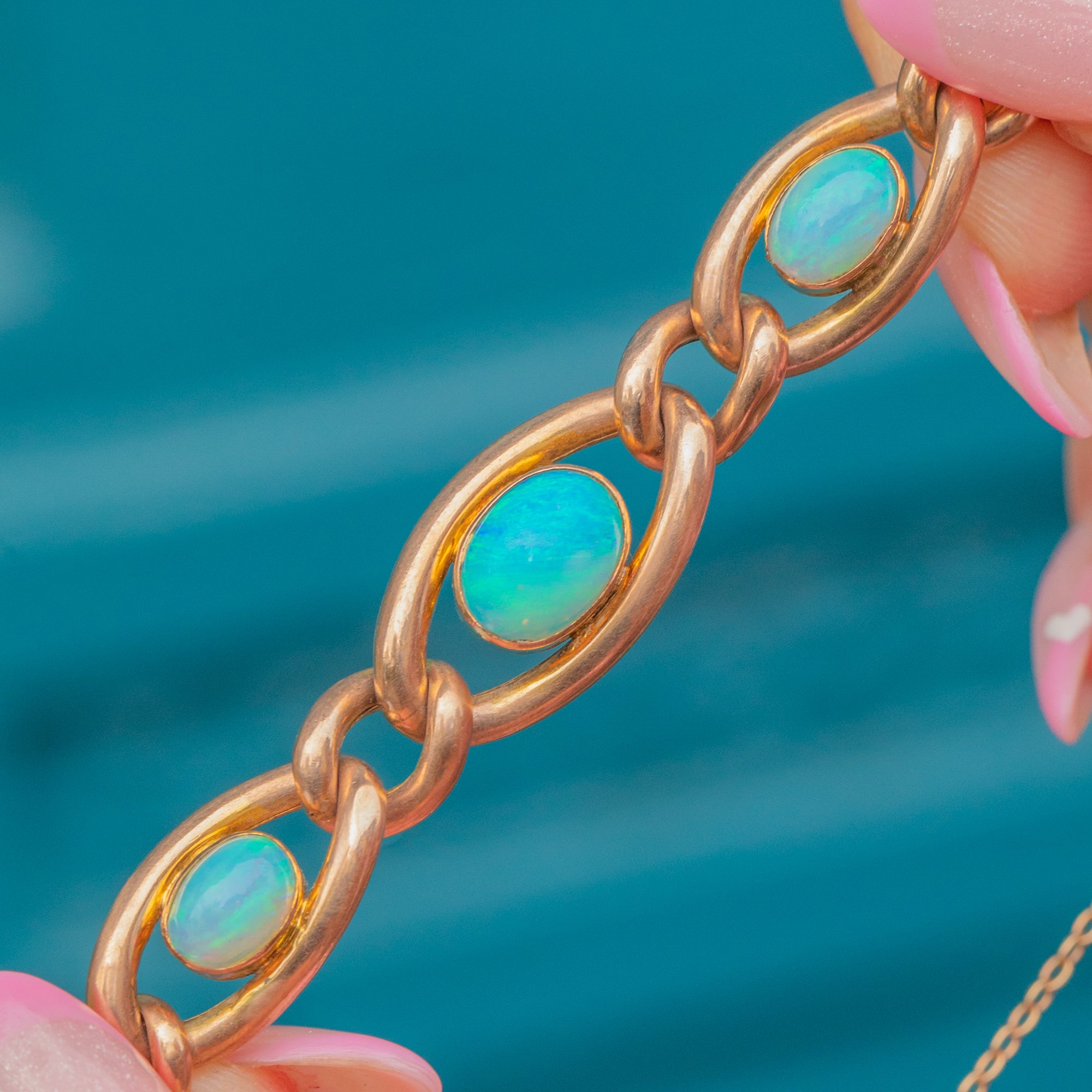 VERY GOOD: The Gold has a luscious, rosy hue and the links are robust and secure. There is one minor chip to the side of an Opal, obscured by the setting and not visible when worn. Otherwise the Opals are perfect with strong play of colour and secure settings.