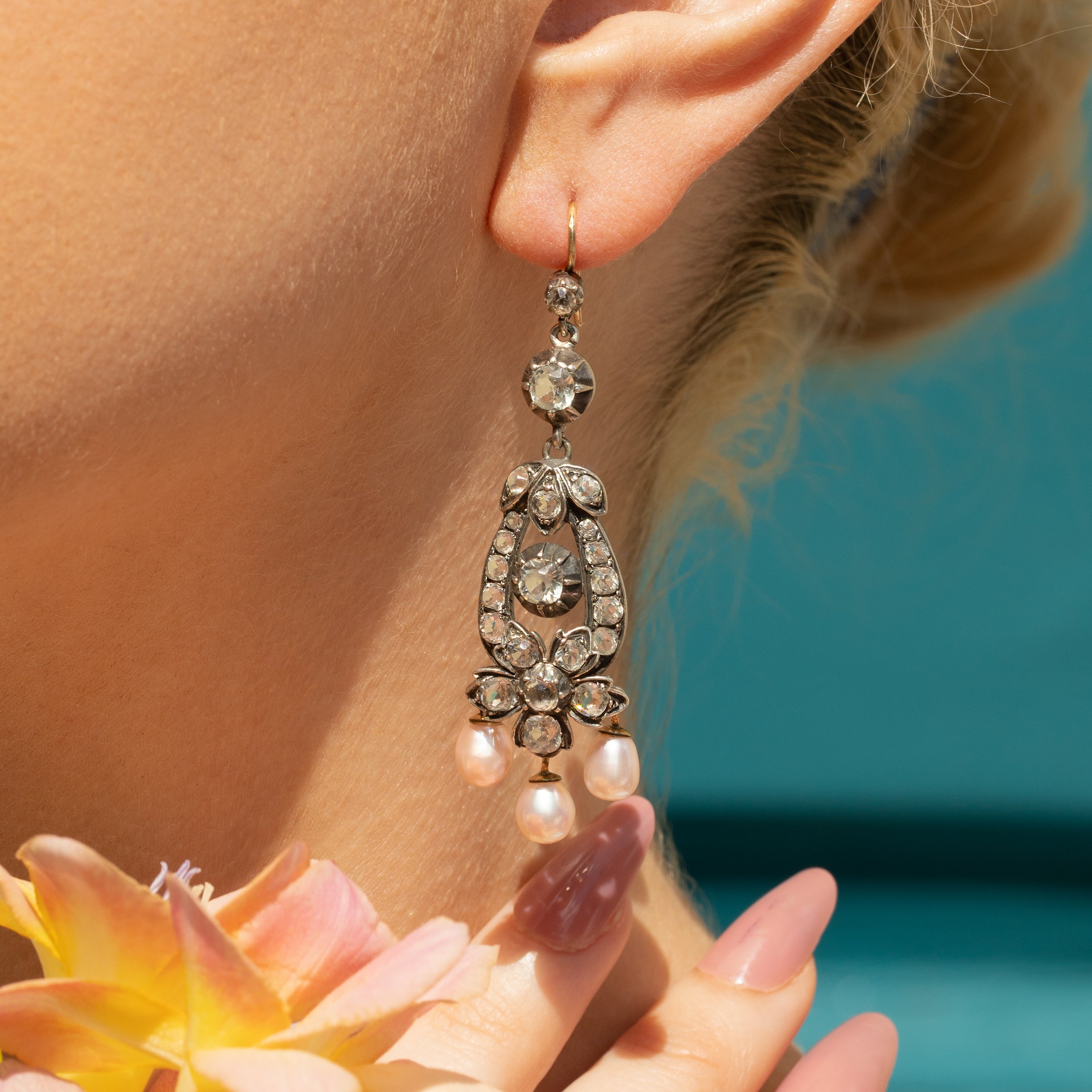 EXCELLENT. This pair of Victorian silver Paste & Pearl Girandole drop earrings are in excellent condition. The earrings have lasted very well through time, and although it is likely that the Pearls are a later replacement, they are in keeping with the design and look gorgeous on the ear. The Paste is lovely, and while some do have wear to note, they retain a fiery sparkle.