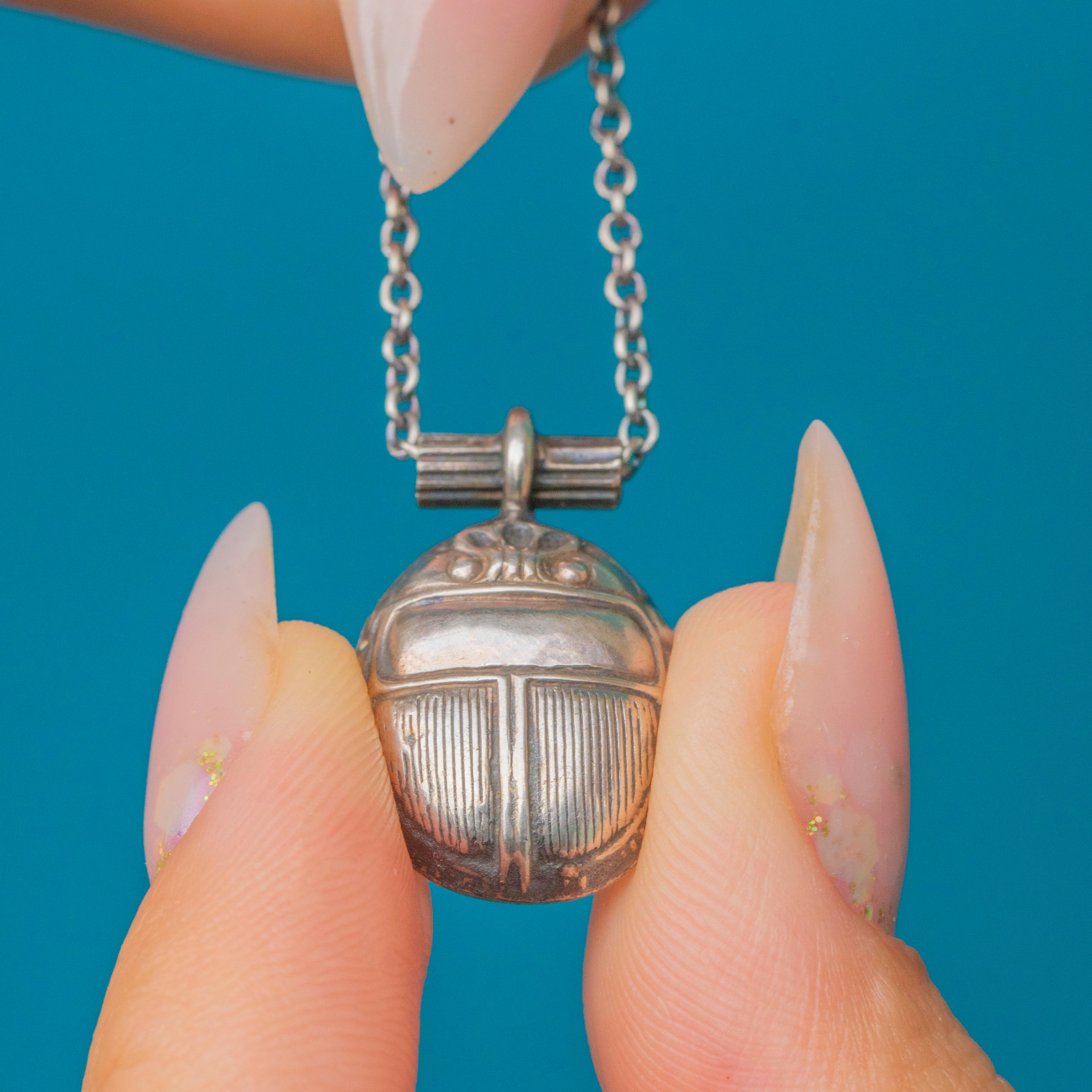 Victorian Silver Scarab Beetle Pendant with 17" Chain