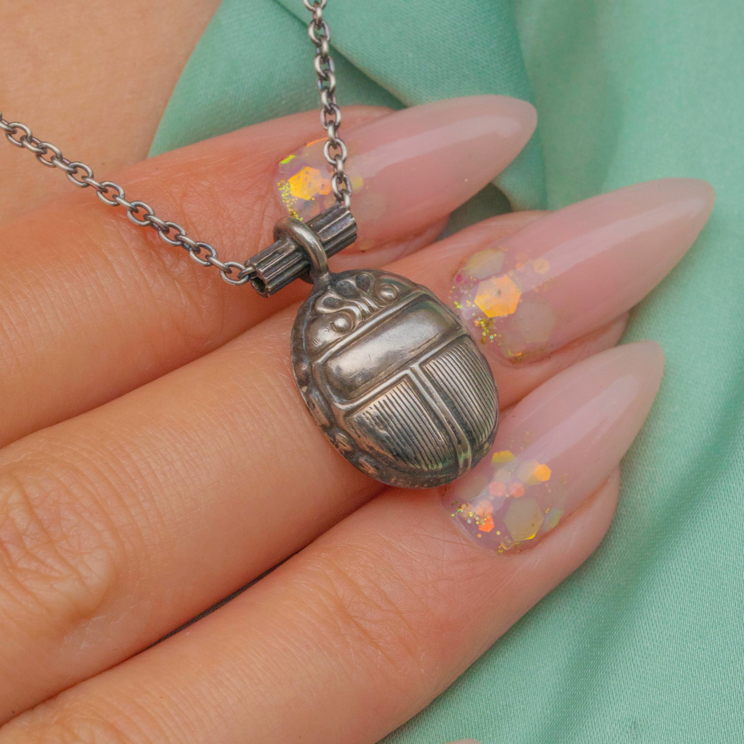 The scarab pendant has developed a rich patina over time, enhancing its depth and character. It hangs from a later Silver chain that can be worn at 17" or 15", giving flexibility in styling. A timeless piece of Victorian design, this jewel carries both history and elegance.