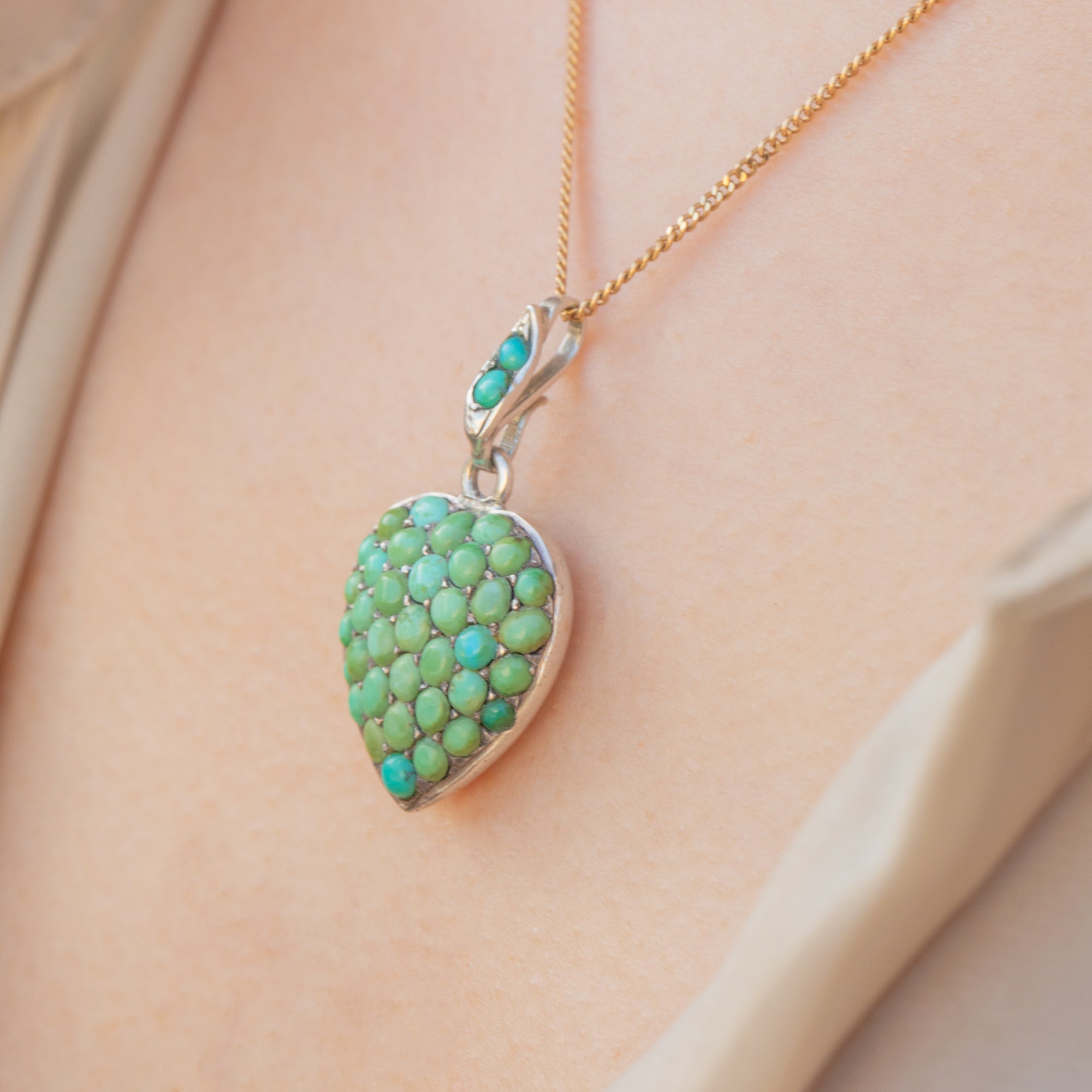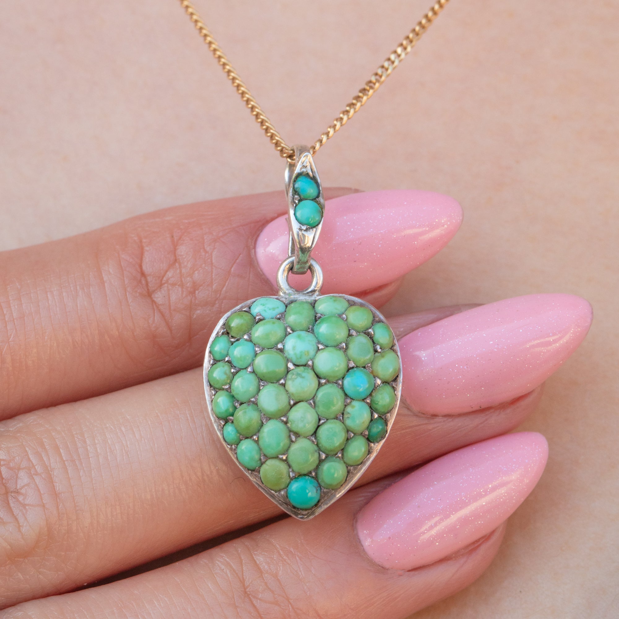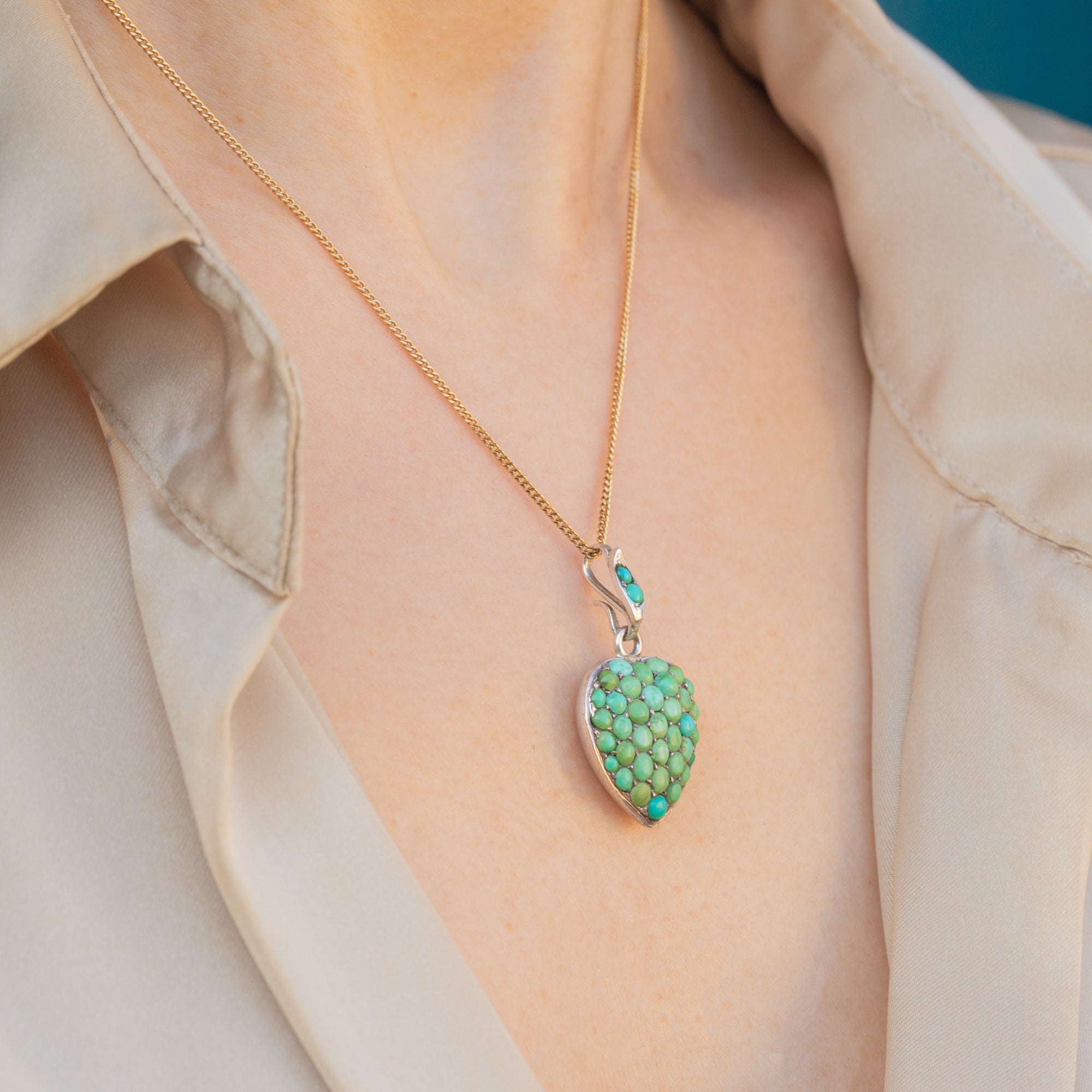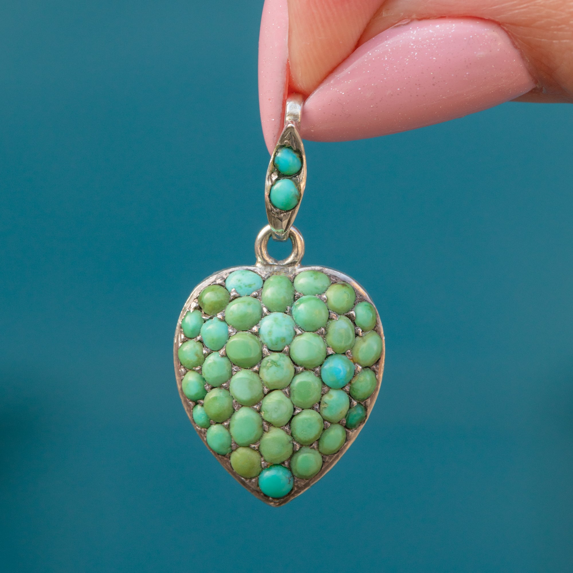 Crafted from glossy Sterling Silver, this Victorian pavé heart pendant is adorned with an array of Turquoise stones, each with a distinct and unique blue-green saturation. She is complete with a locket back, perfect for holding a cherished photograph close to your heart.