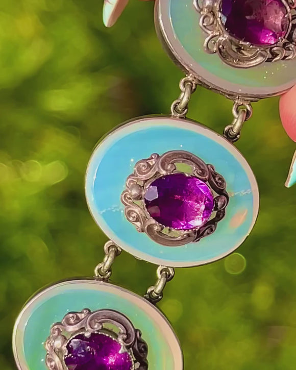 VERY GOOD: The White Chalcedony discs show light surface abrasions commensurate with age; the purple stones display minor facet and surface wear with bright colour retained. The Sterling Silver panels, articulation, and box clasp with safety chain are secure, with a gentle patina that enhances the detail. Two stones are later Purple Paste replacements (one adjacent to the clasp and one centrally), and some small screws to the backs of certain links are absent; this does not affect the security or wear of the bracelet.