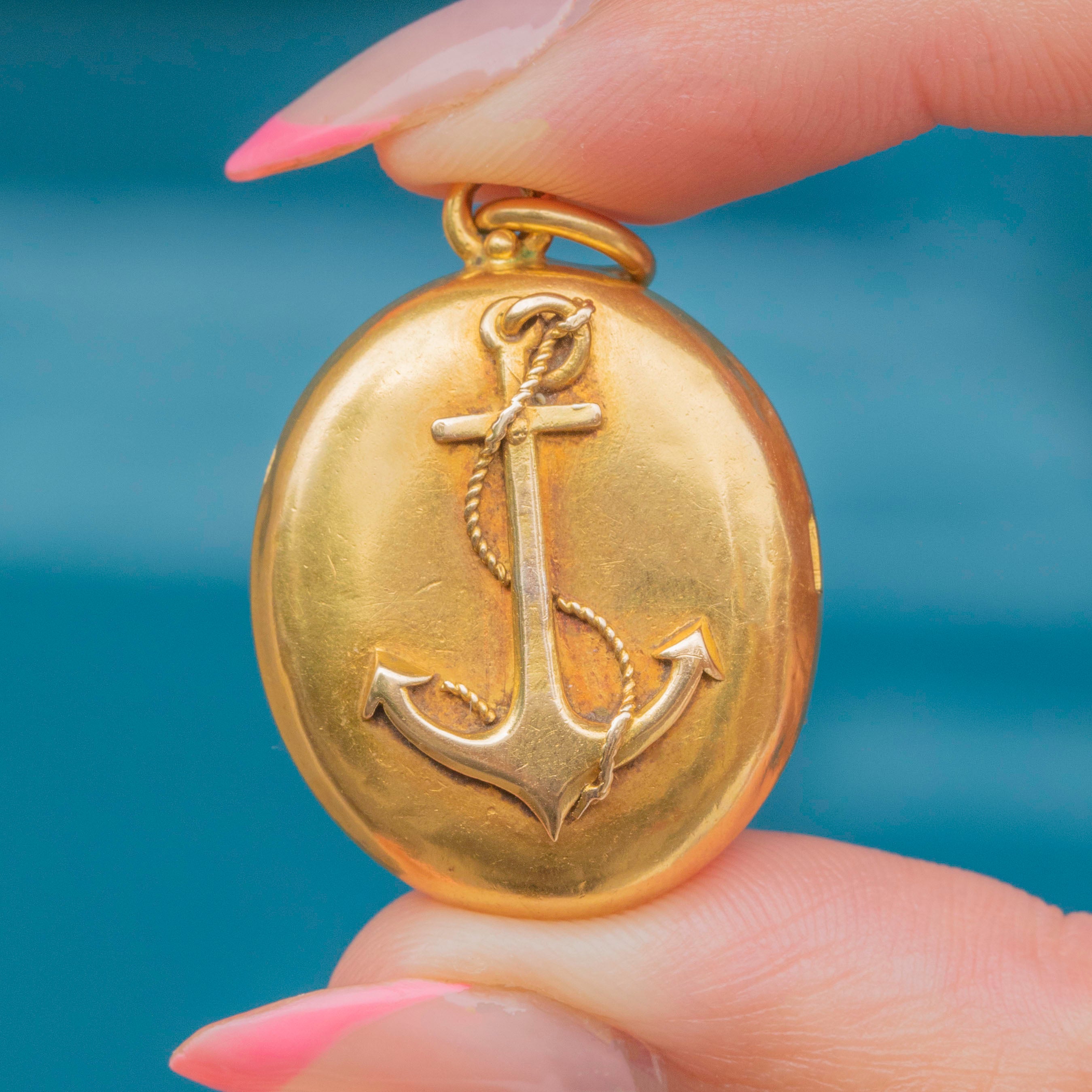 VERY GOOD: This Victorian solid 18ct Gold Banded Agate anchor locket is in very good condition. The Gold is brightly saturated throughout and all the details have remained defined. There are some mild dings around the outside of the locket, commensurate with age, but these aren't particularly noticeable when looking front on. The Banded Agate is smooth and securely set, free from chips or scuffs. Closing securely and with the original picture frame intact, you can use and wear this antique anchor locket with utmost confidence!