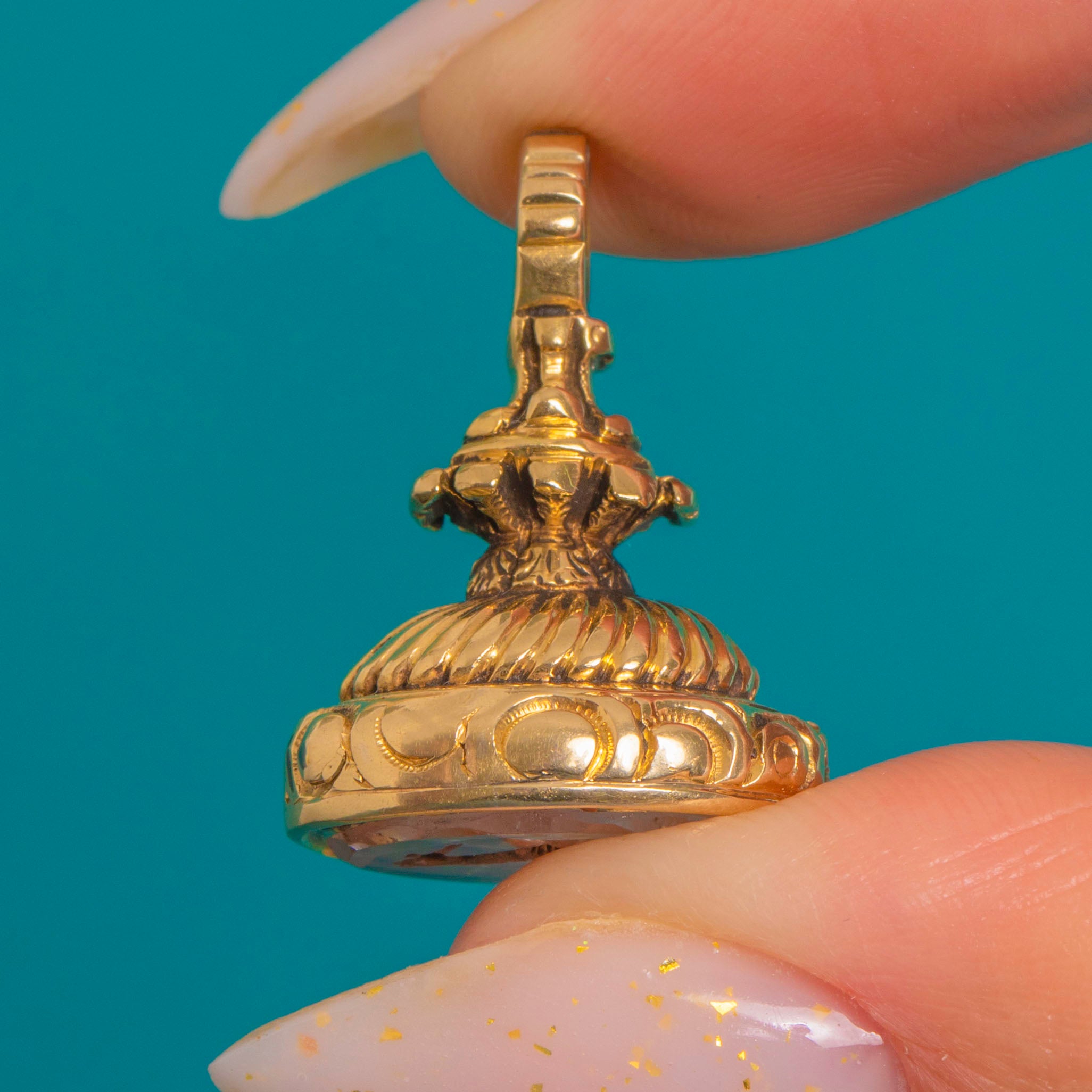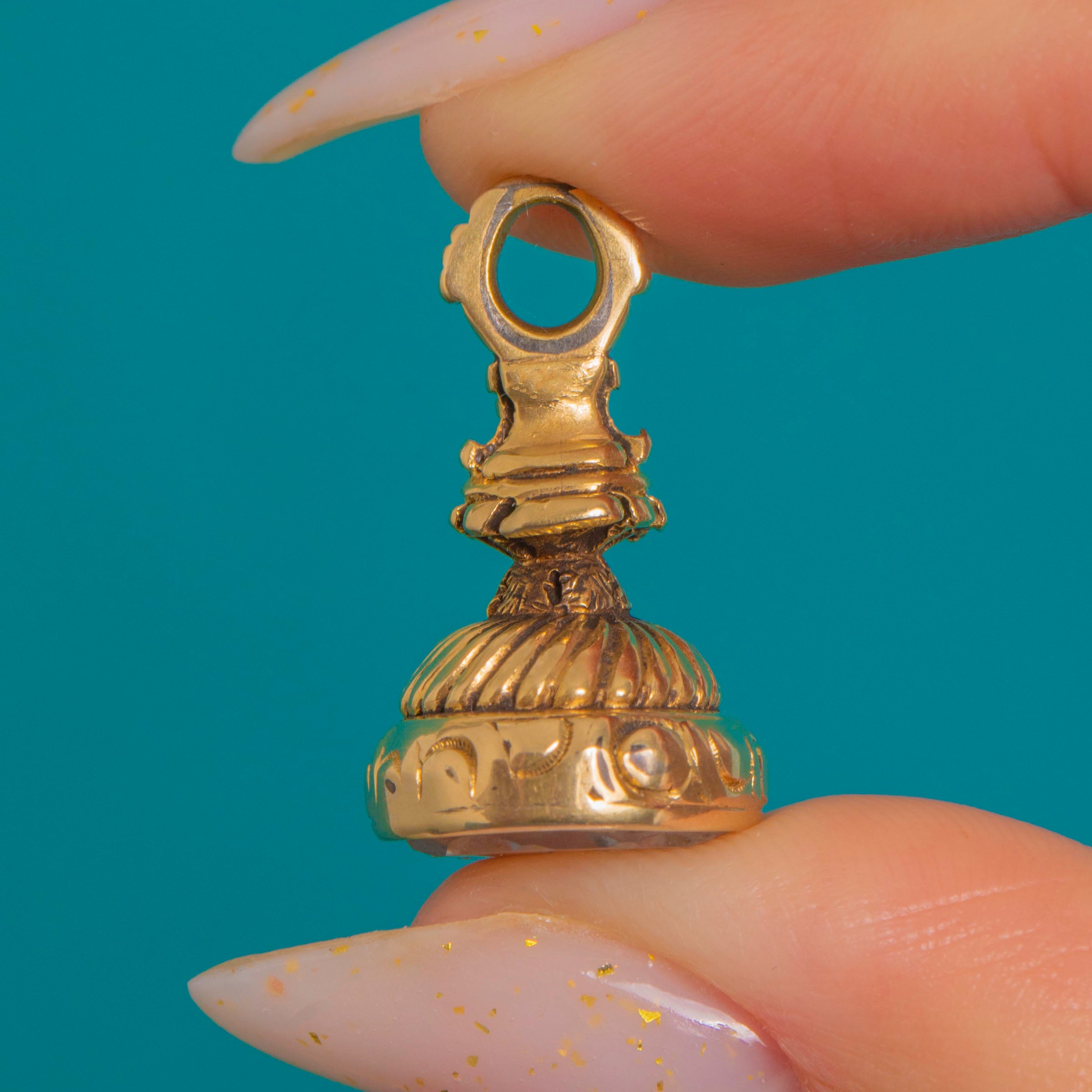 An exquisite Victorian Rock Crystal intaglio fob seal, crafted in richly chased 9ct Gold. The architectural urn-like handle rises over a gadrooned dome, framed by rope-twist and beaded borders, while foliate and scroll engravings add delightful texture and depth. The base holds a clear Rock Crystal tablet, intaglio-carved with a heraldic crest for a refined, classical finish.