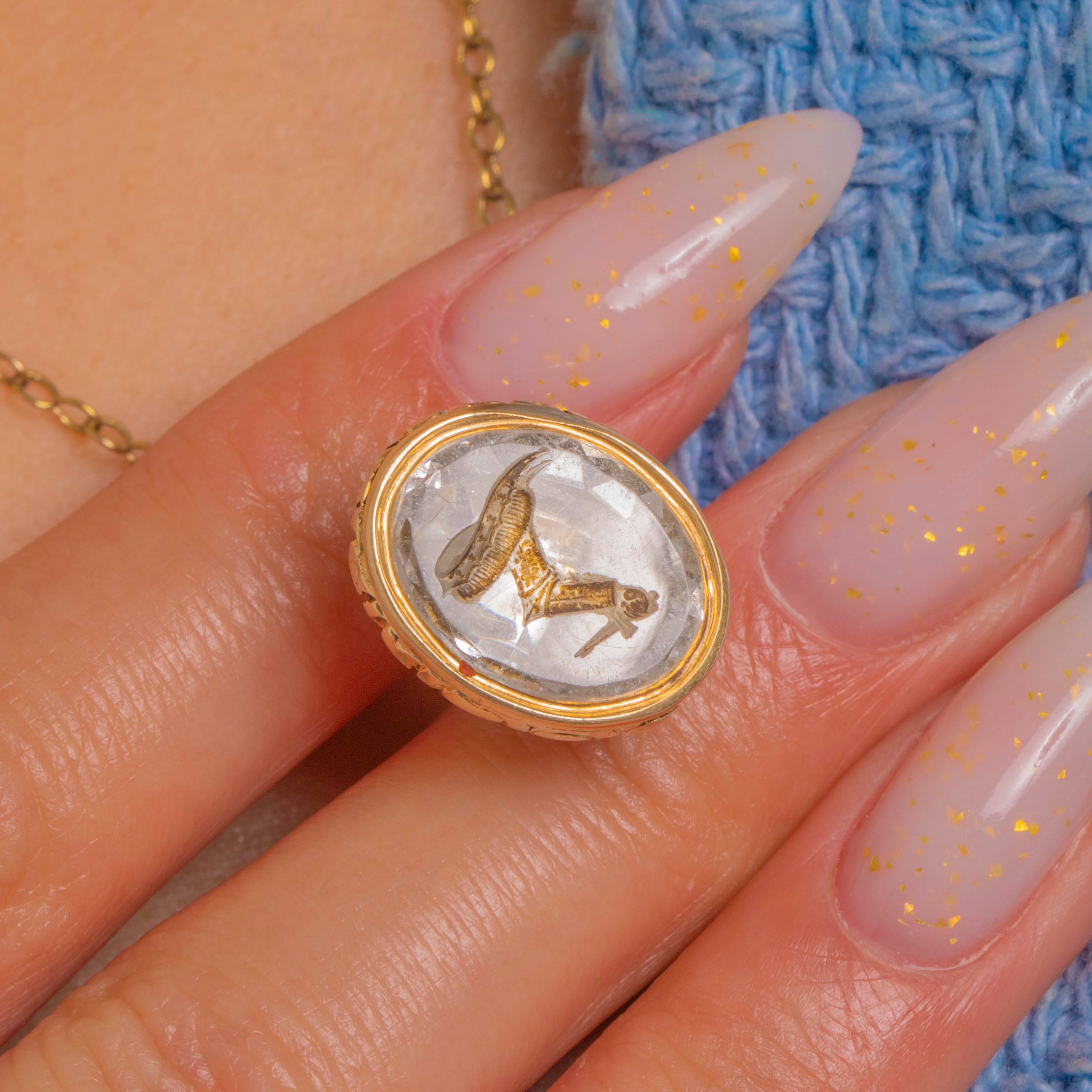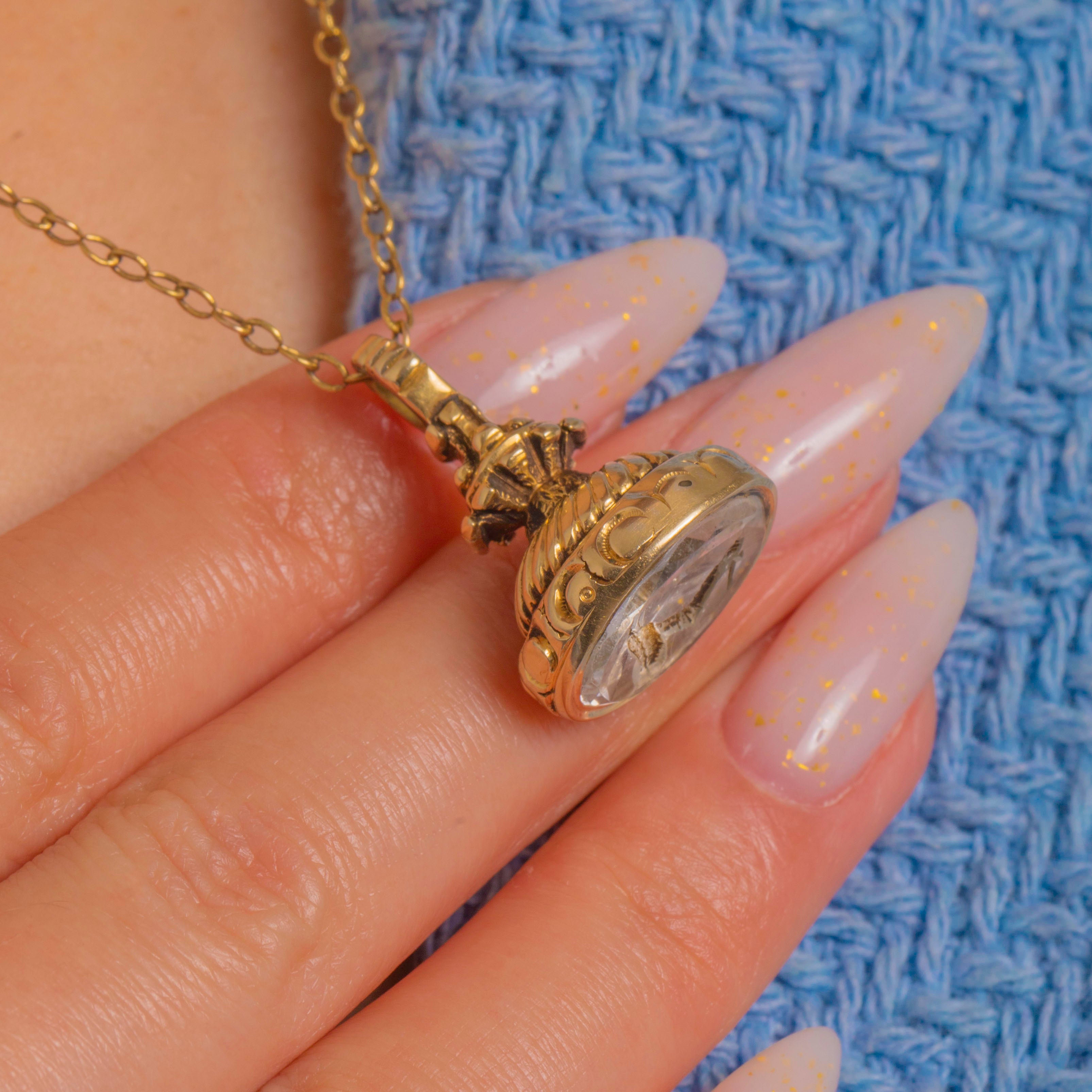 EXCELLENT: The Rock Crystal intaglio is bright with minor edge abrasions and light surface wear commensurate with age. The 9ct Gold mount is secure with a pleasing antique patina and gentle softening to the high points; the fixed bail is sound. No visible repairs or alterations.