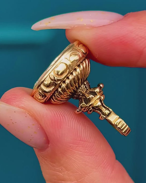 MATERIALS: Tests as 9ct Gold, carved Rock Crystal intaglio coat of arms (foiled).