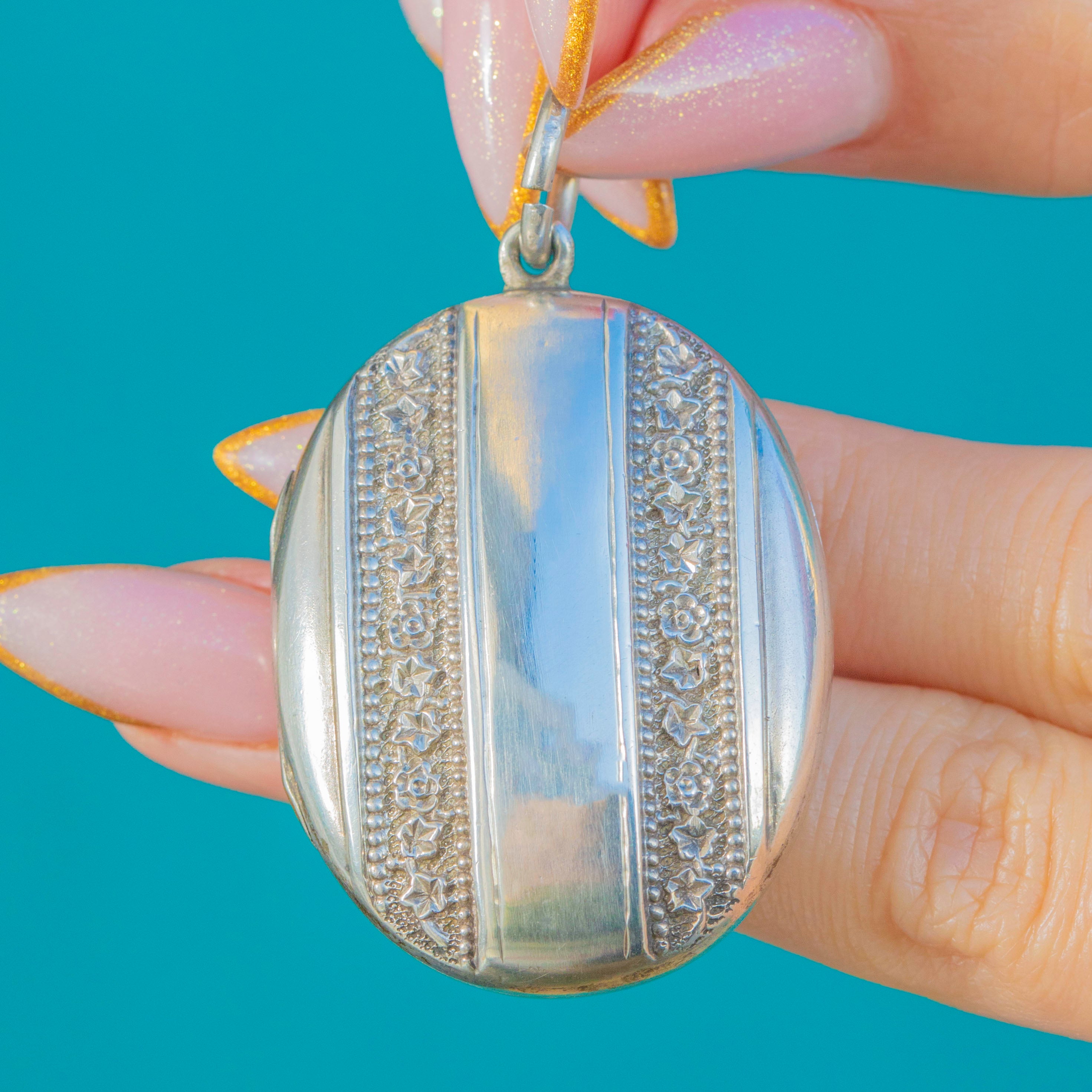This beautiful Victorian Sterling Silver locket features striking striped panels framed by deeply embossed floral and foliate motifs. The combination of polished domed surfaces and crisp repousse detailing creates a wonderfully eye-catching play of light—elegant, tactile, and unmistakably Victorian.