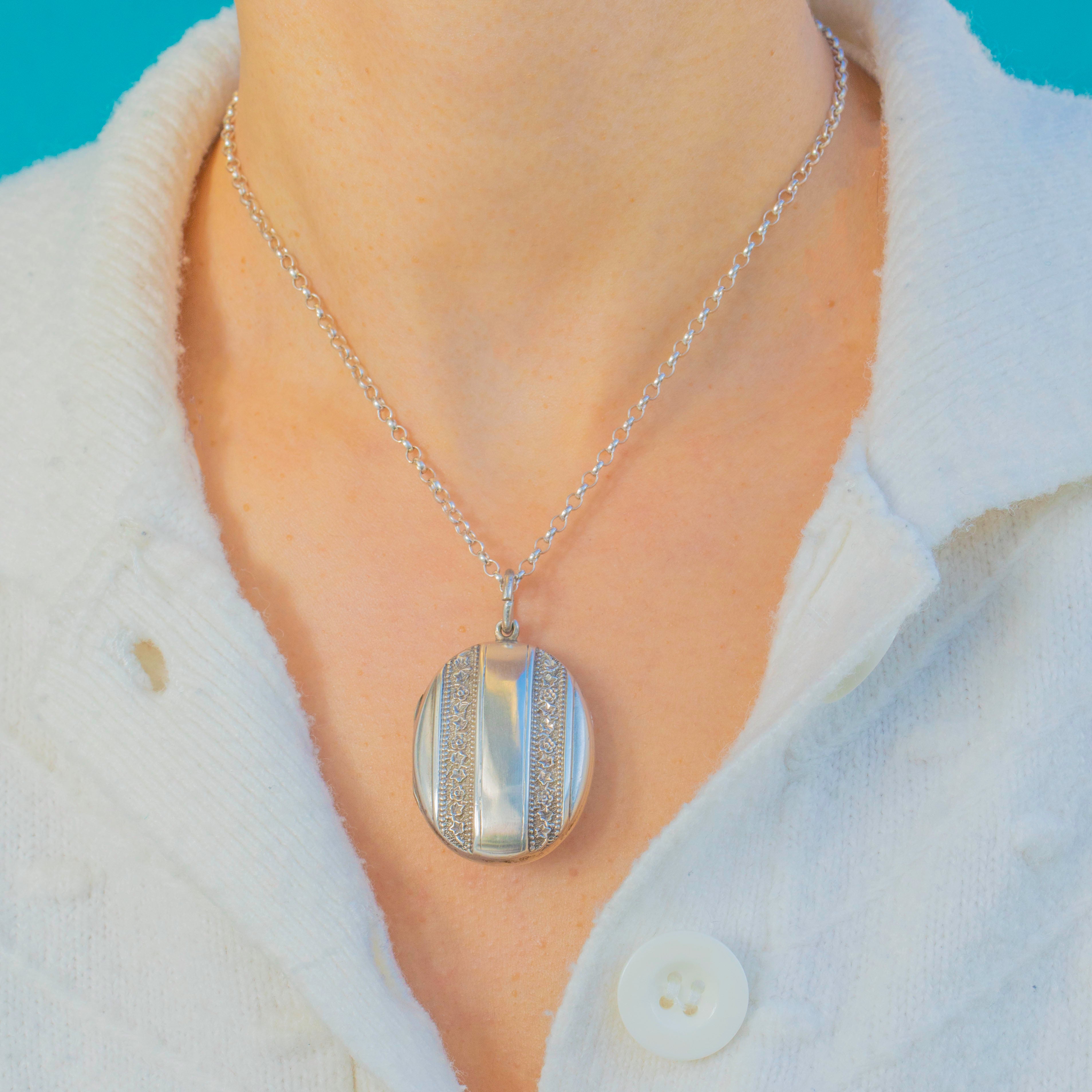 Inside, the locket retains both of its original Sterling Silver frames, ready to hold treasured photographs or keepsakes. A charming, classic piece of 19th-century Silver jewellery with excellent presence and craftsmanship.