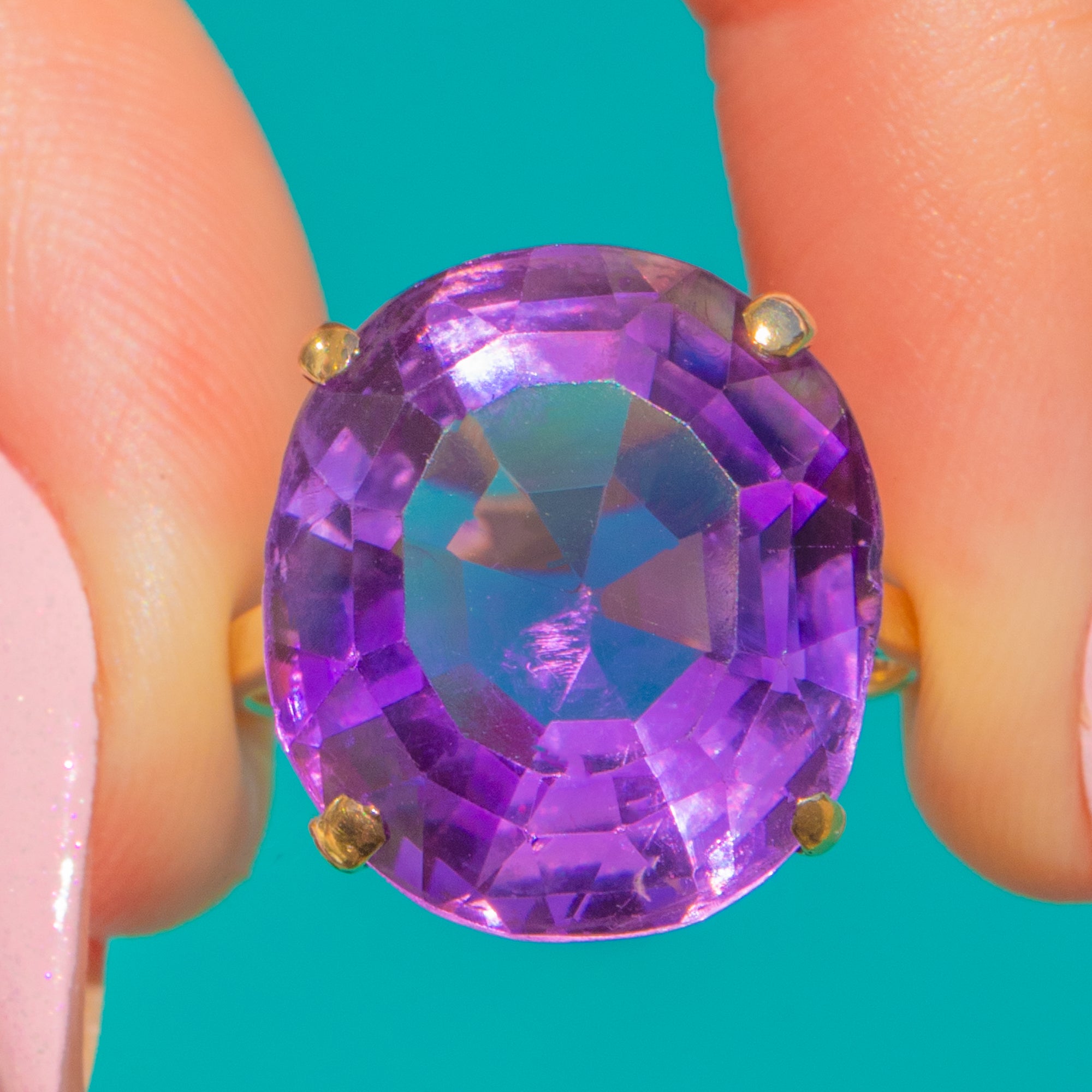 All the drama of mid-century glamour in one sweeping statement. This Vintage 9ct Gold cocktail ring showcases a vivid purple Amethyst of approximately 20.00cts, elevated in a bold, high-set open gallery that invites light to dance through every facet.