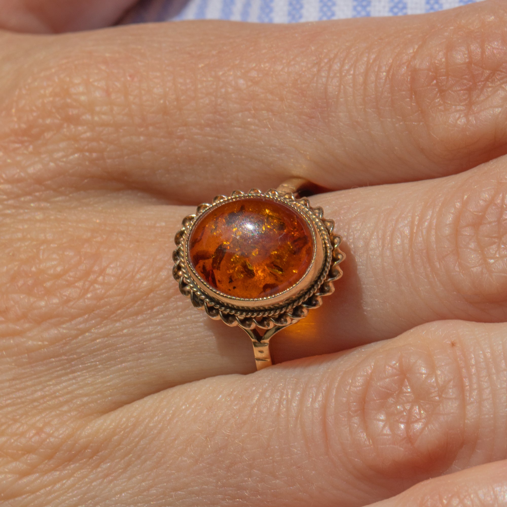 EXCELLENT. We are pleased to present this Vintage 9ct Gold Amber ring in excellent condition! The Amber is secure within her setting and the inclusions make her even more sensational. The Gold is in perfect condition throughout and has retained its structural integrity for comfortable wear.