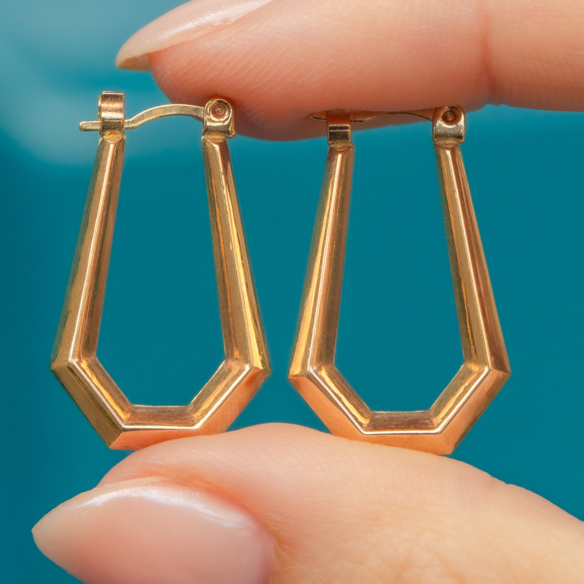 EXCELLENT. This pair of 9ct Gold hexagon hoop earrings are in excellent condition. The earrings have kept their shape well with no dings or dents visible, and the levers are in perfect working order. These Gold hoops are ready to be worn straight from the box!