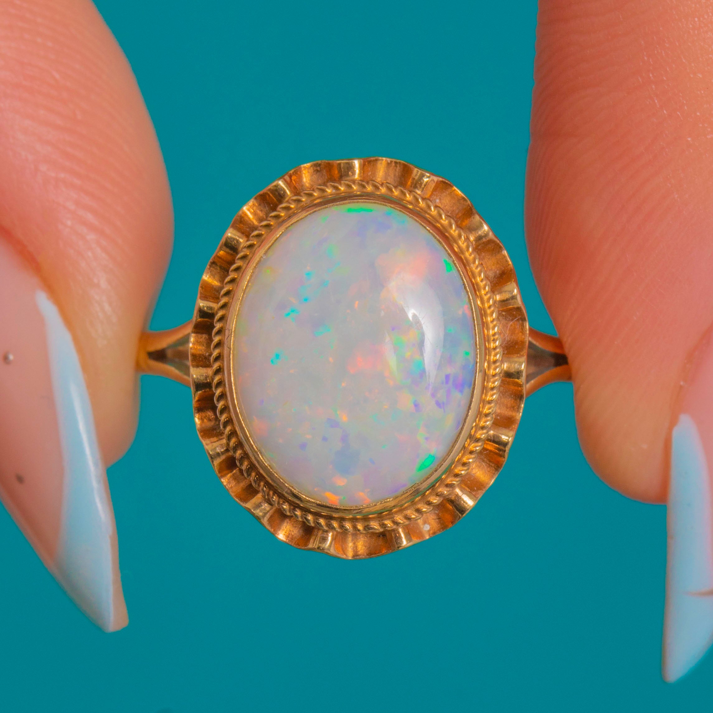 Alive with opalescent fire, this Vintage 9ct Gold ring showcases a natural, solid Opal cabochon glowing with flashes of green, orange and red. The oval gem is wrapped in a refined rubover bezel and framed by a rope border and scalloped edge, creating a graceful rosette or “ballerina” feel. Slim split shoulders and an elevated, open gallery keep the silhouette airy and romantic.