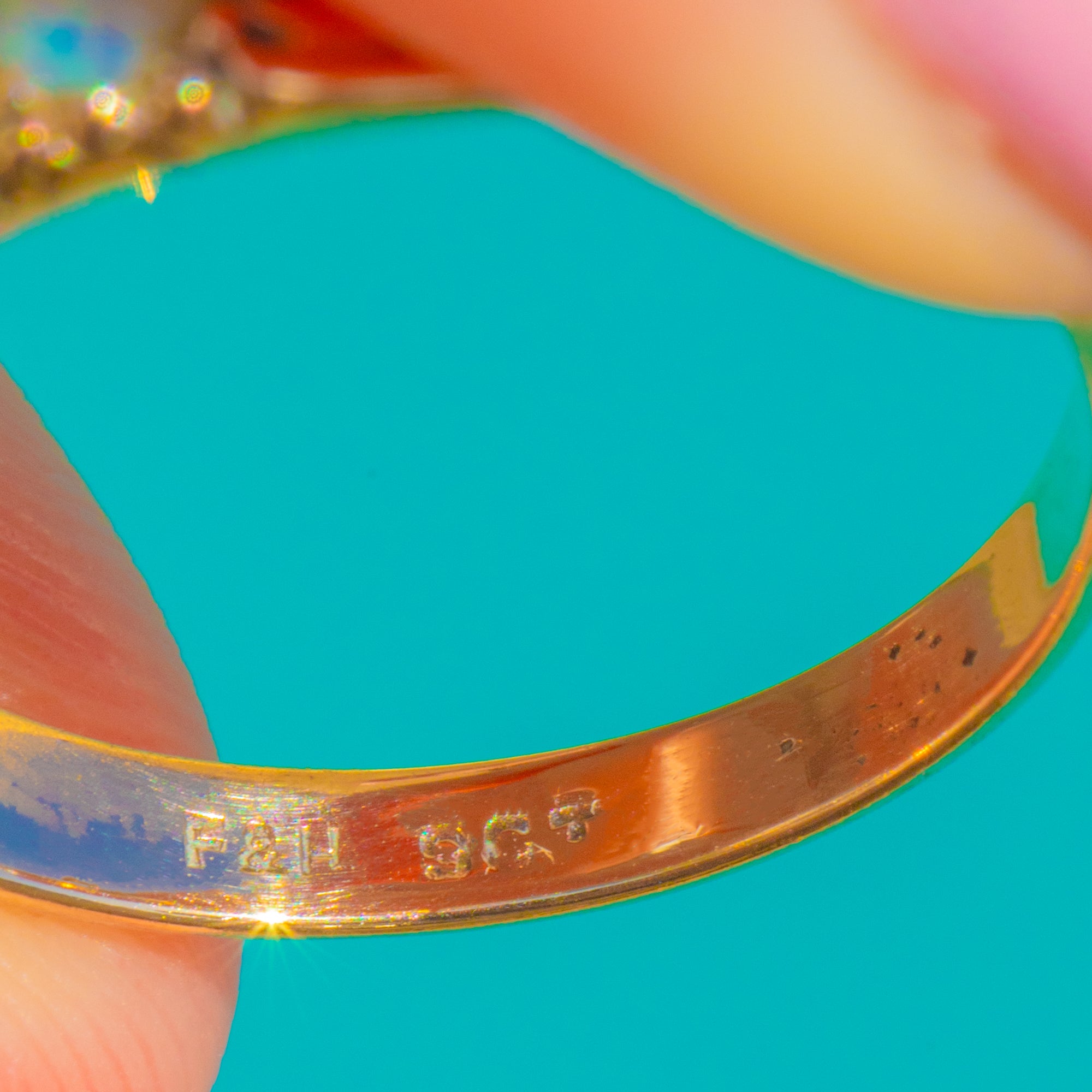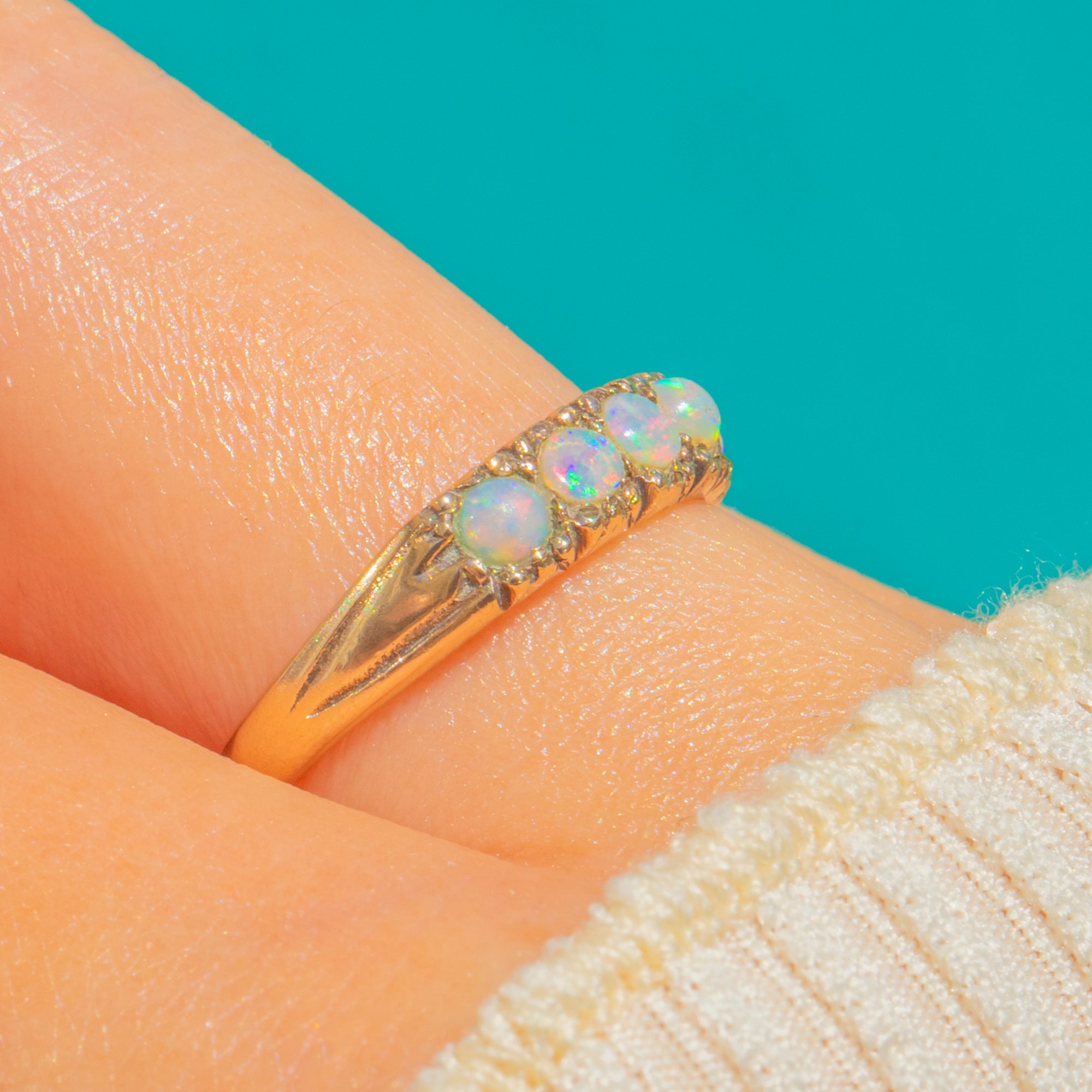 EXCELLENT: The Opals are in beautiful condition with very minor surface wear not visible to the naked eye. The 9ct Gold band is robust and shows only light surface marks consistent with gentle, well-cared-for wear, and the settings are secure. No signs of resizing or restoration are evident.