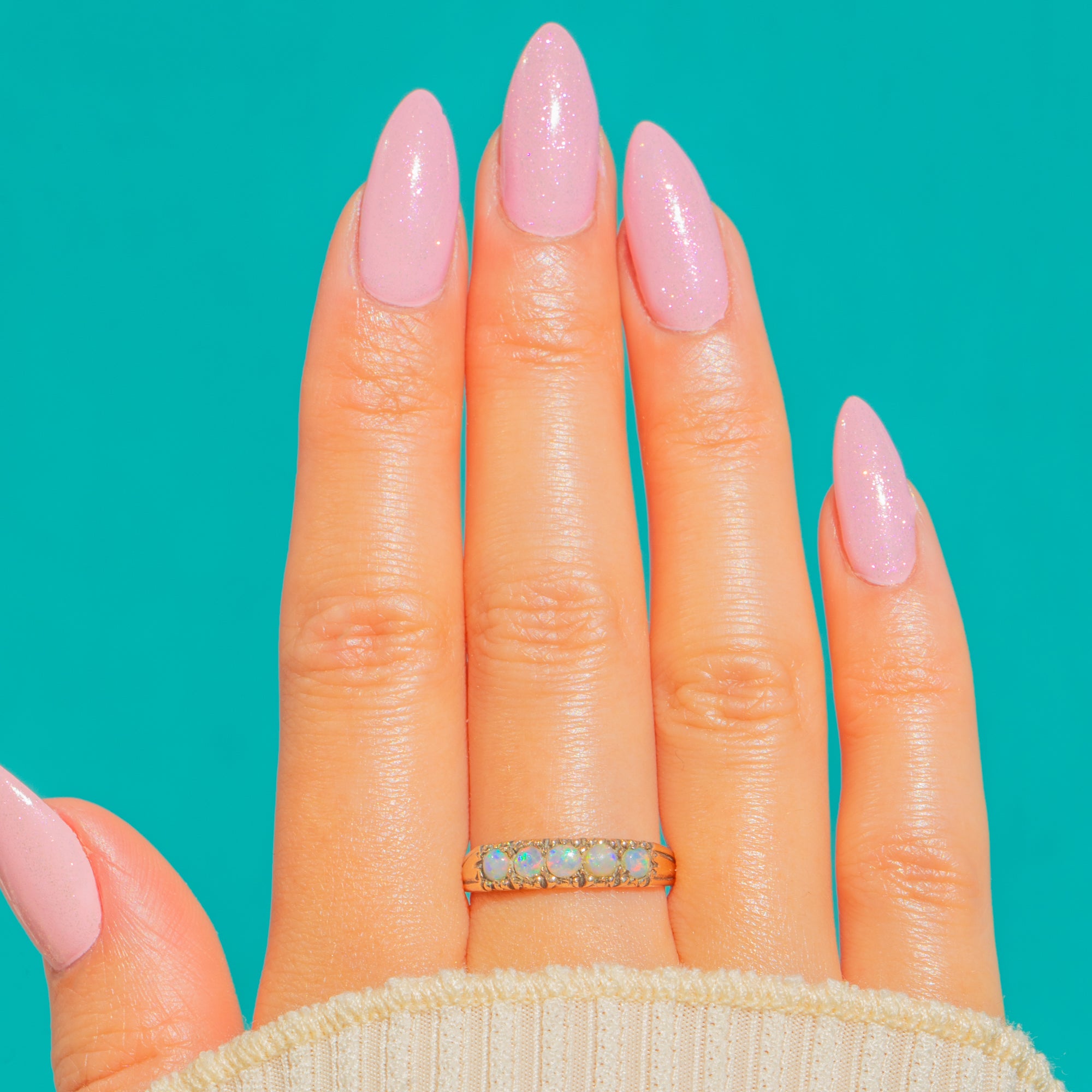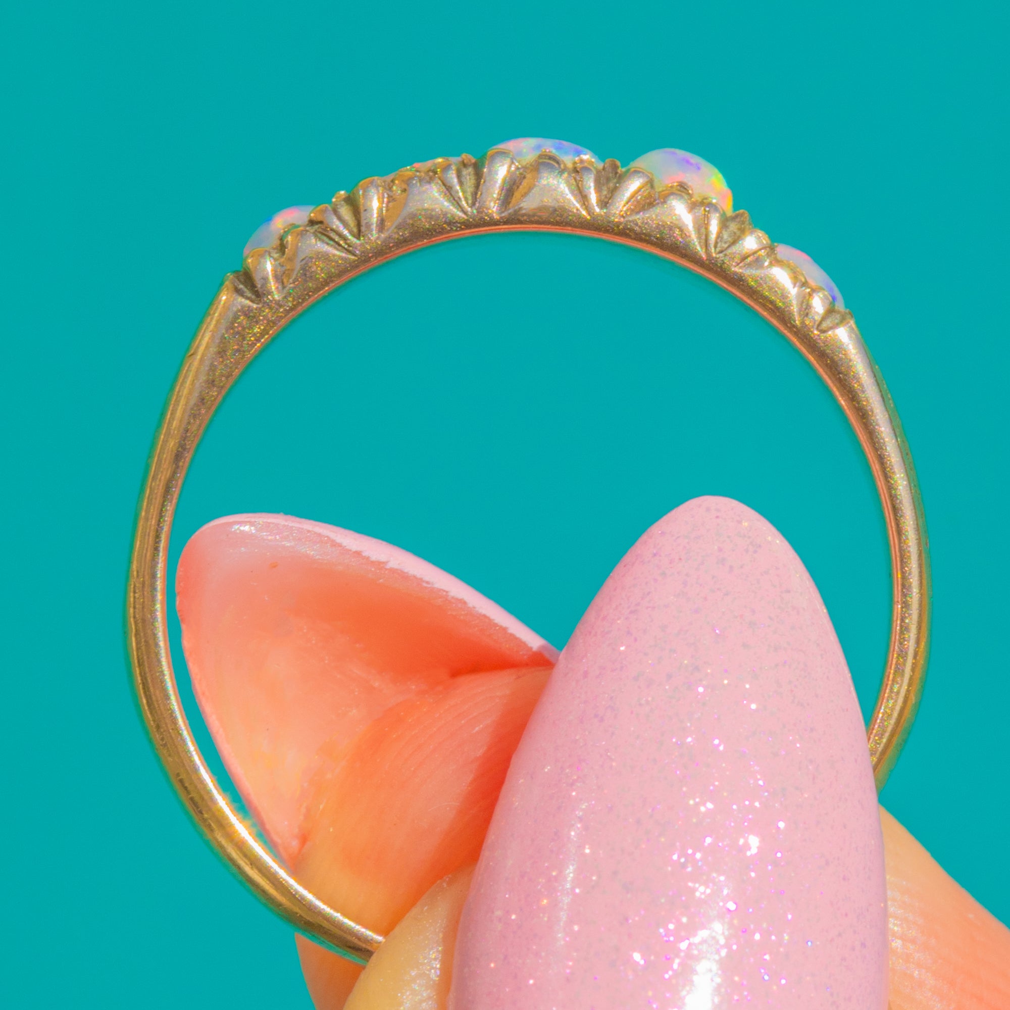 A charming mid-century Vintage five-stone ring in 9ct Gold, set with luminous Opal cabochons in a low, slim profile.