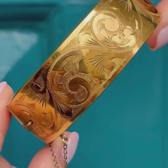 VERY GOOD: We bring this Vintage 9ct Rolled Gold engraved cuff bangle to you in wonderful condition. The 9ct Rolled Gold is akin to sunshine - rich, buttery and radiant! There is some wear to the inside and the back of the bangle, but nothing untoward given her Vintage age. The engravings are crisp with no signs of wear to note. The clasp shuts securely with a click so you can wear this vintage bangle with the utmost confidence.