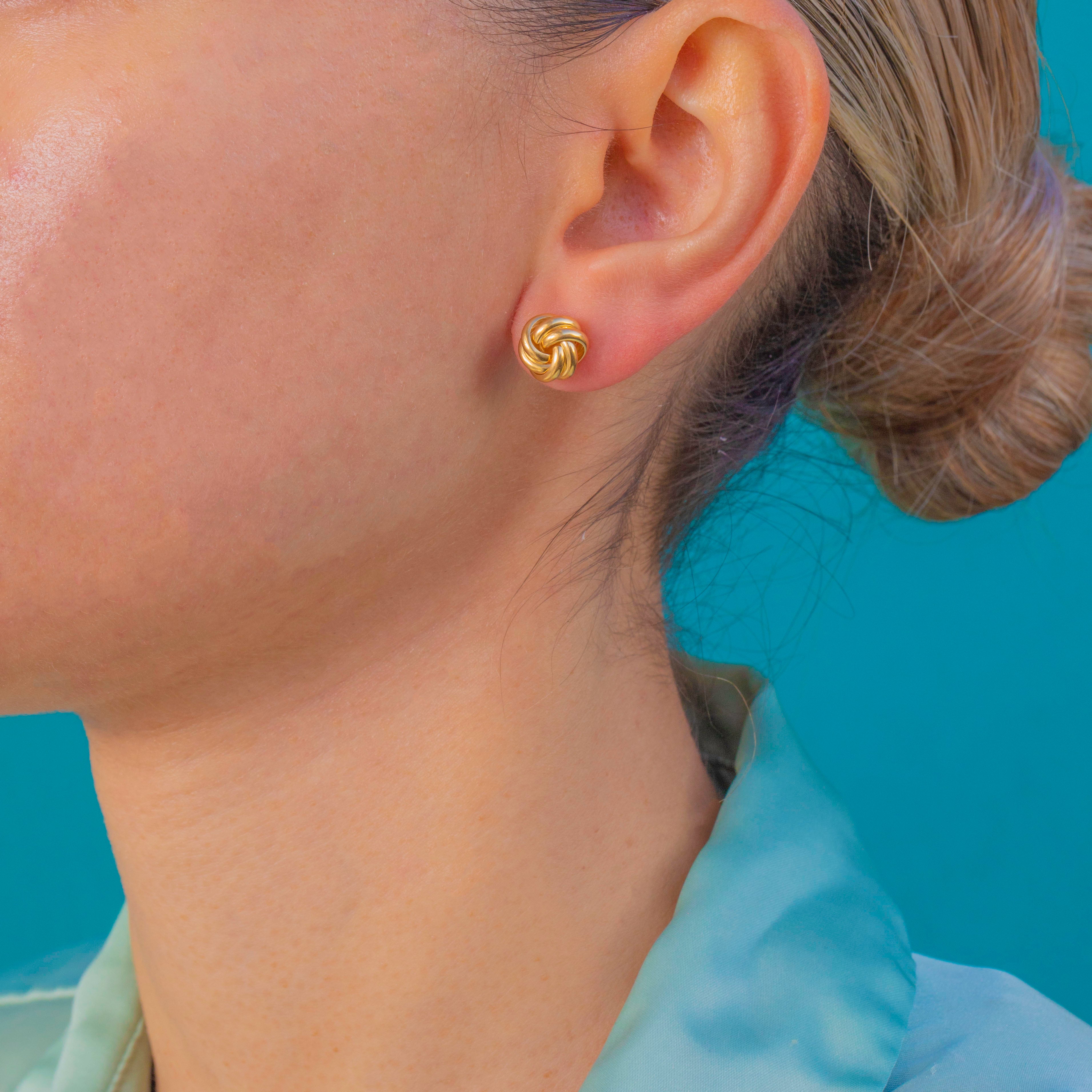 A classic pair of Vintage 18ct Gold knot stud earrings, sculpted in smooth, interlaced loops with a luminous high-polish finish. The compact, button-like knots offer a timeless, minimalist silhouette that sits elegantly on the lobe.