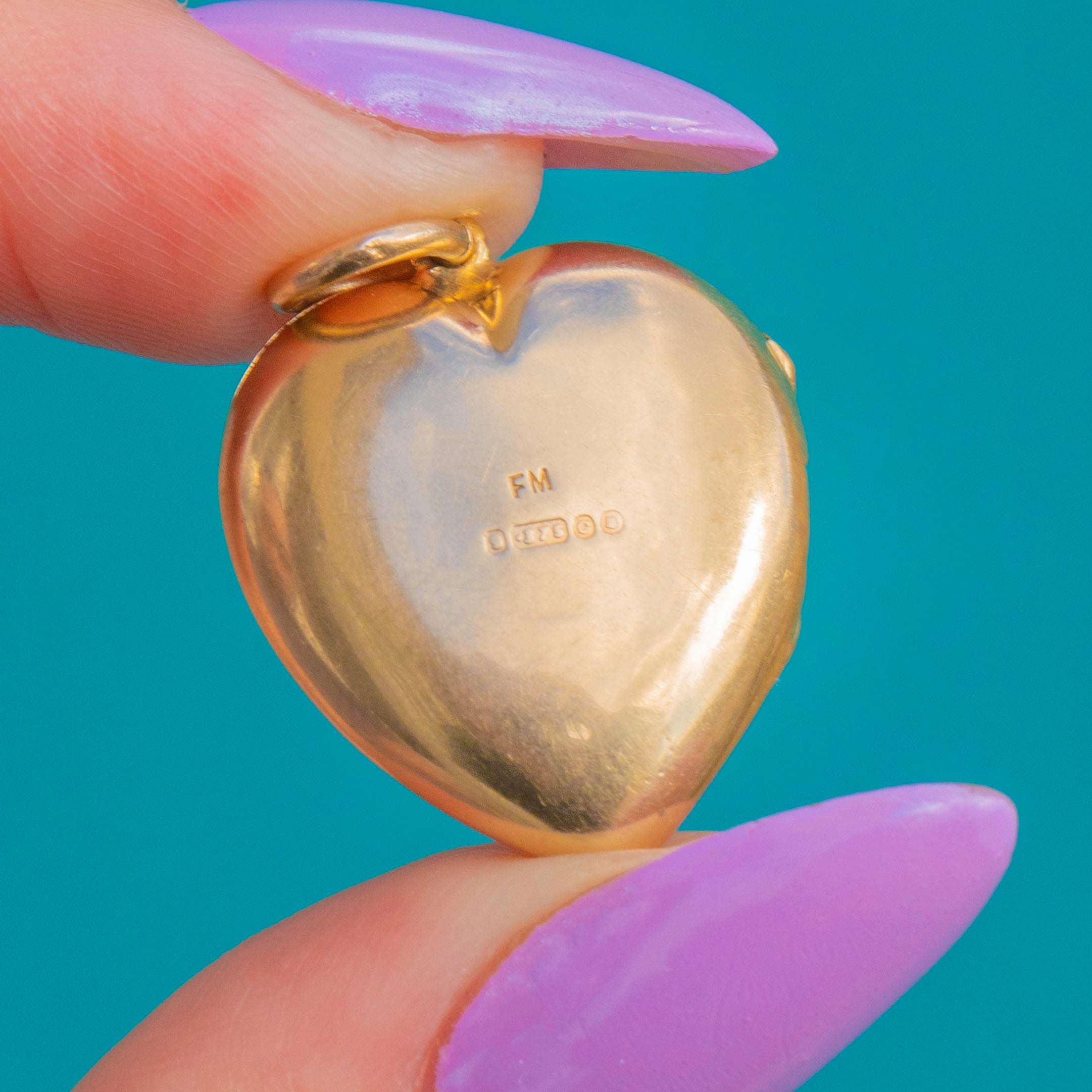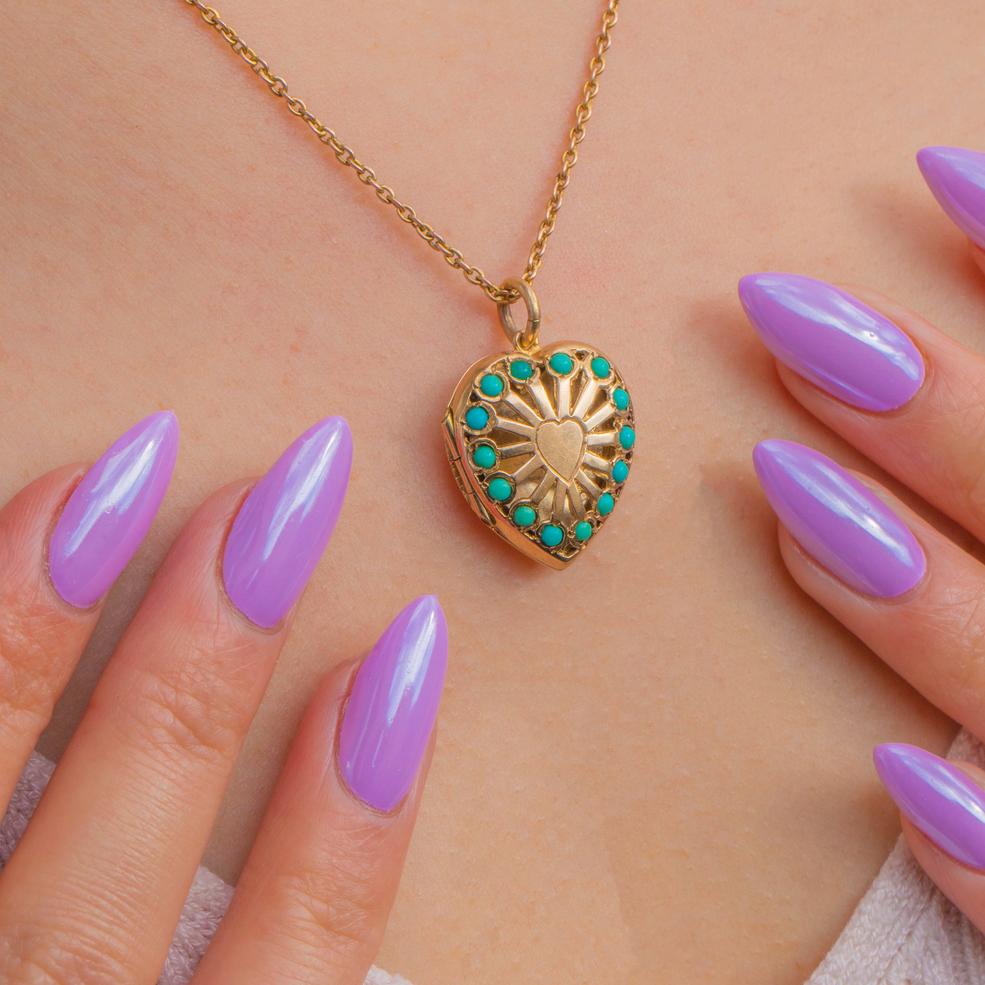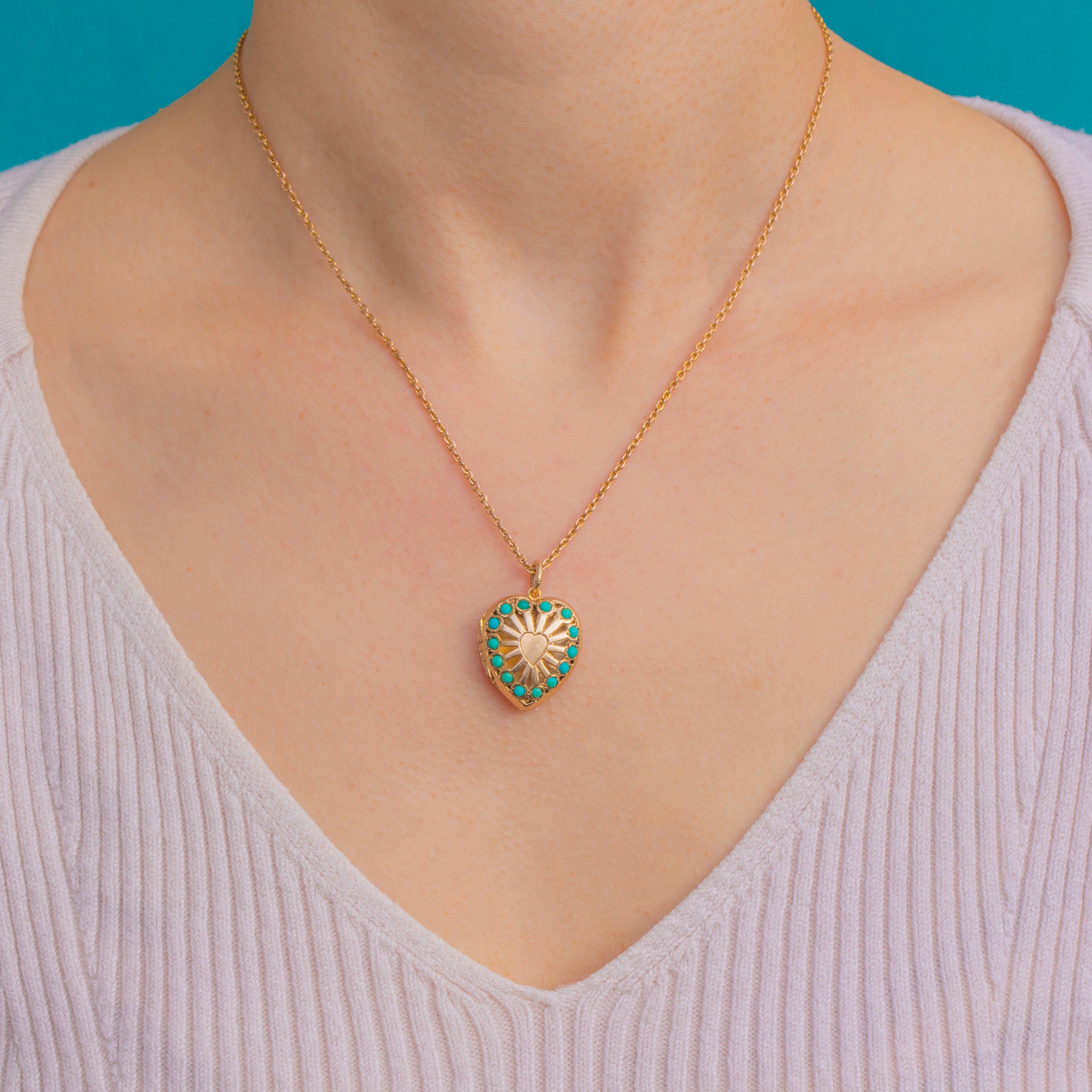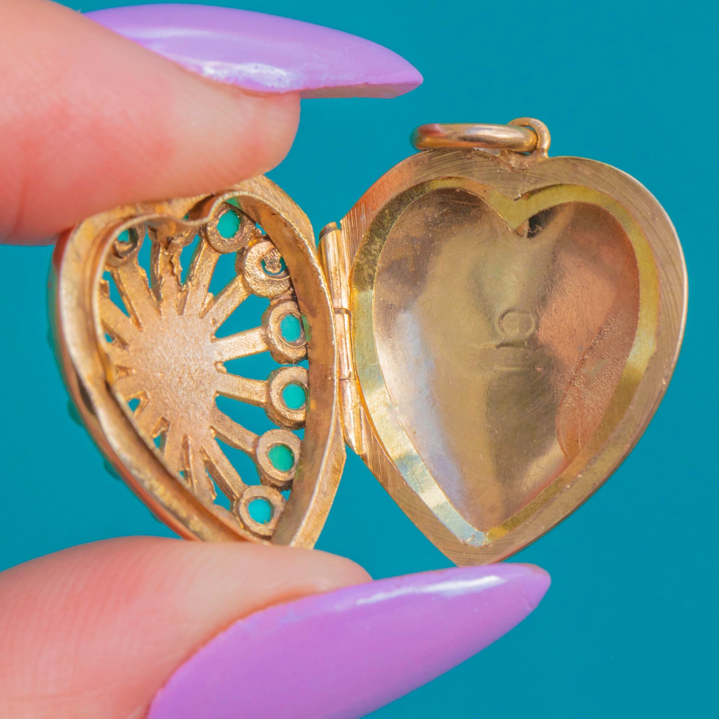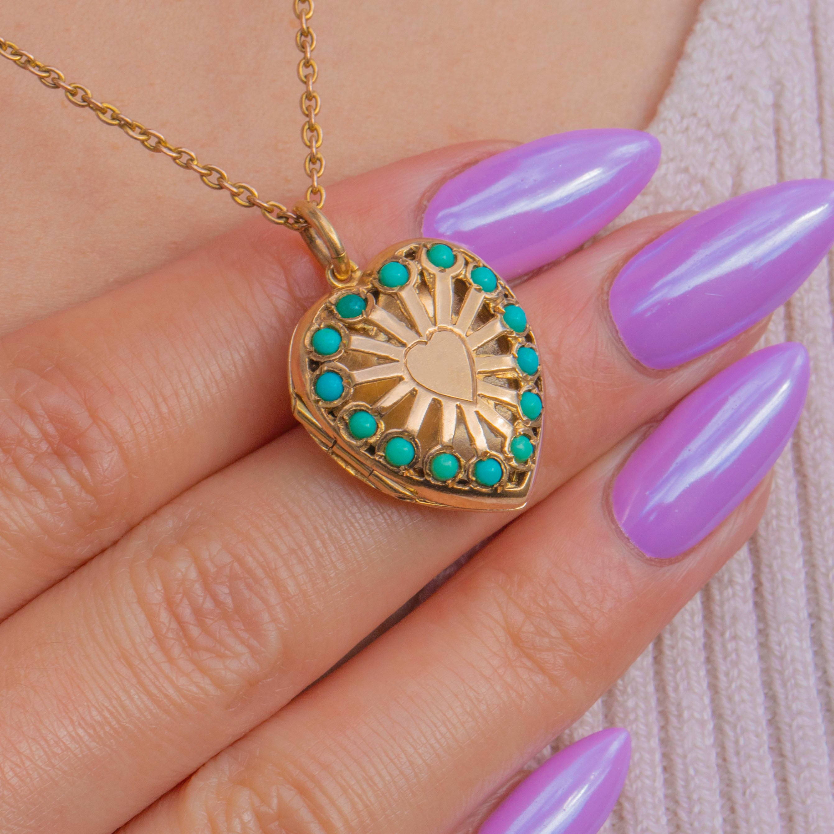 A sweet Turquoise halo encircles a raised heart on this 9ct Gold locket, dated to 1958. The front is enriched with radiating sunburst detail and a ring of vivid blue Turquoise cabochons, creating a charming play of colour against warm, buttery Gold.
