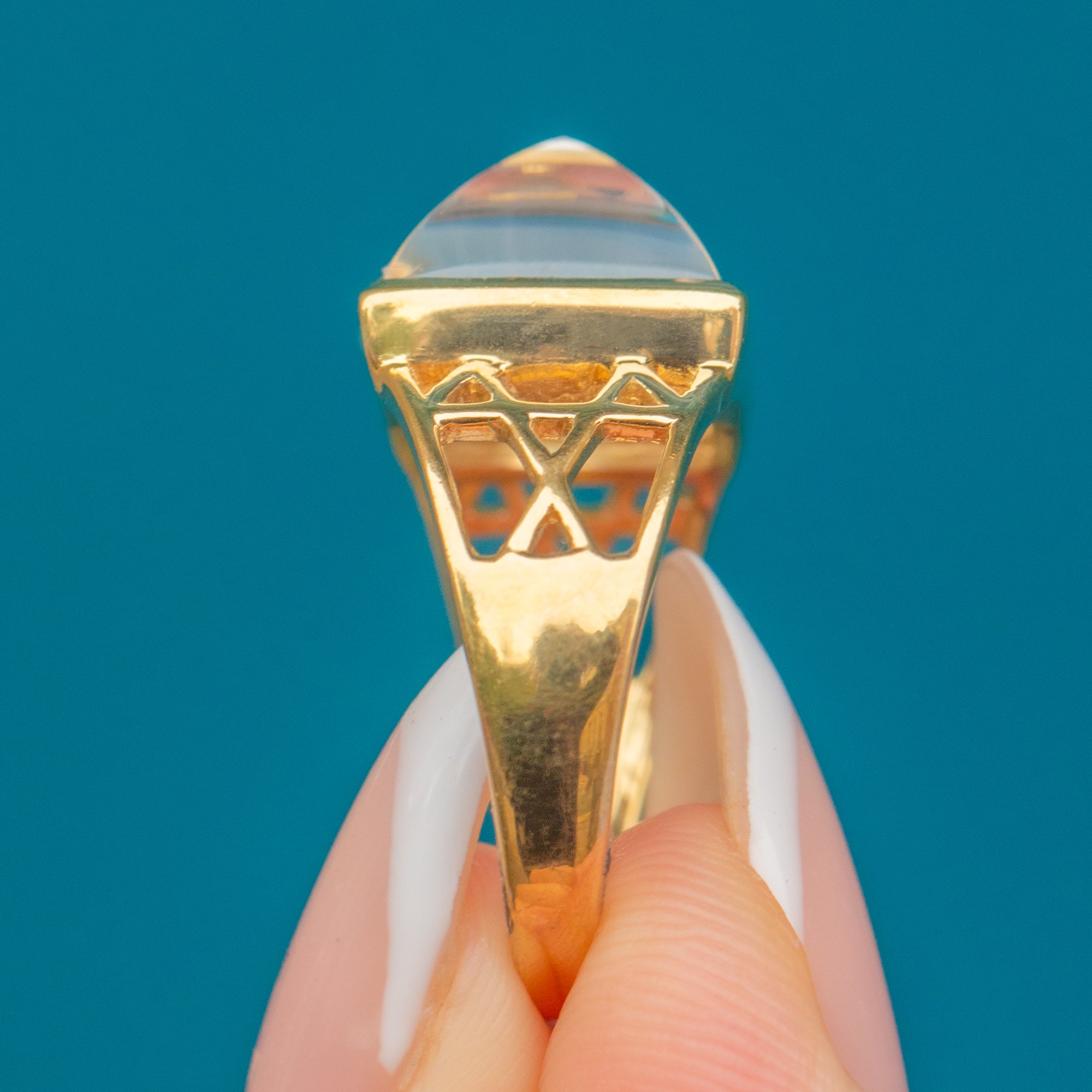 The substantial Gold setting is crafted with openwork shoulders, adding an extra layer of visual interest and lightness to the design. Known as the "Uri Geller Ring", this style is celebrated for its mystical and eye-catching qualities. A fabulous piece of Vintage jewellery, perfect for collectors or anyone seeking a distinctive everyday ring.