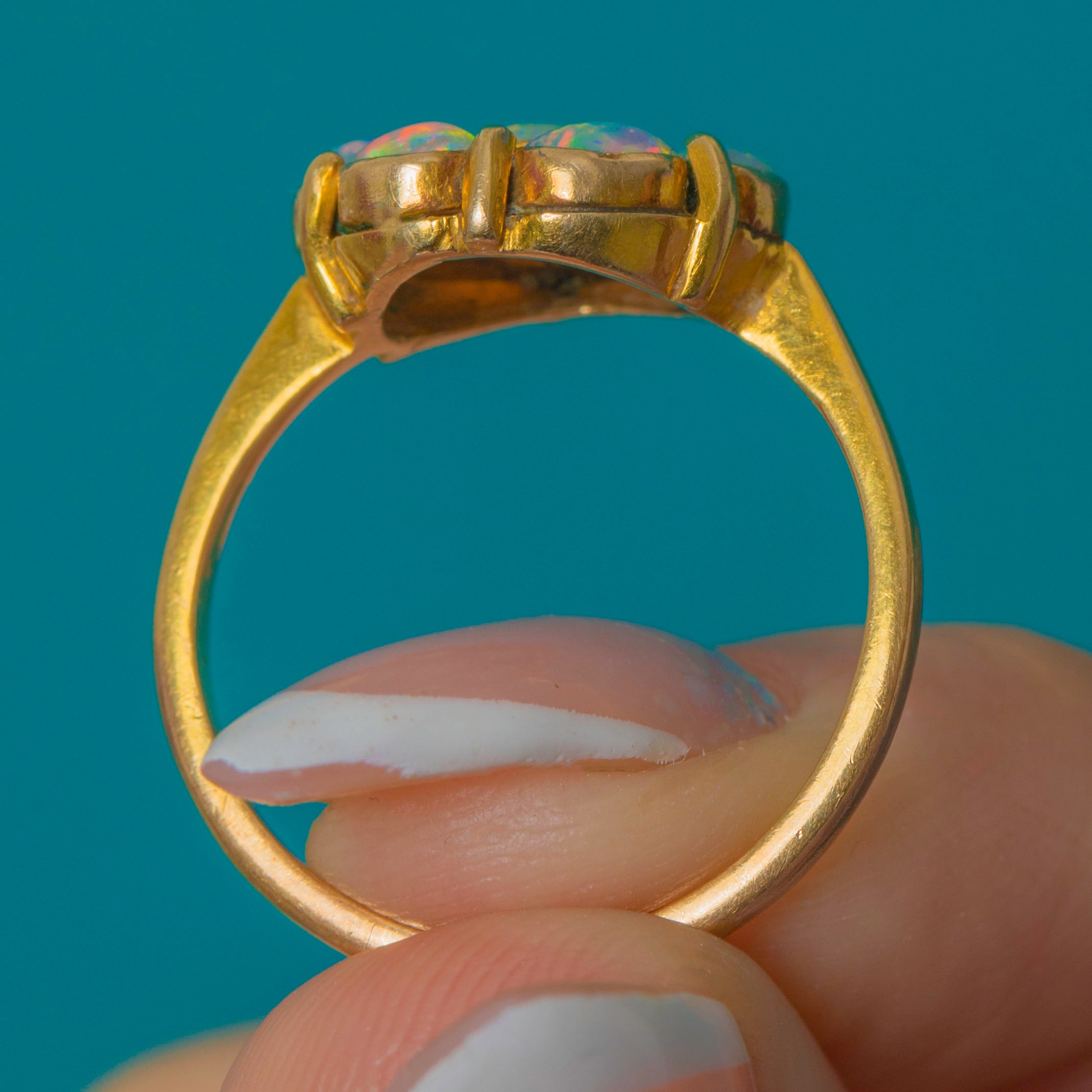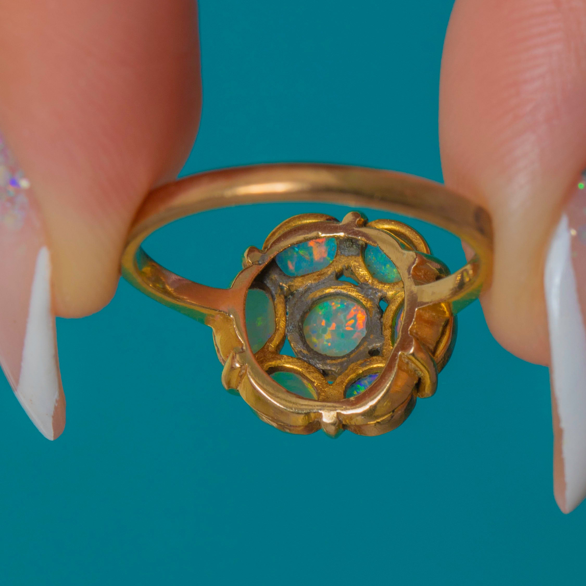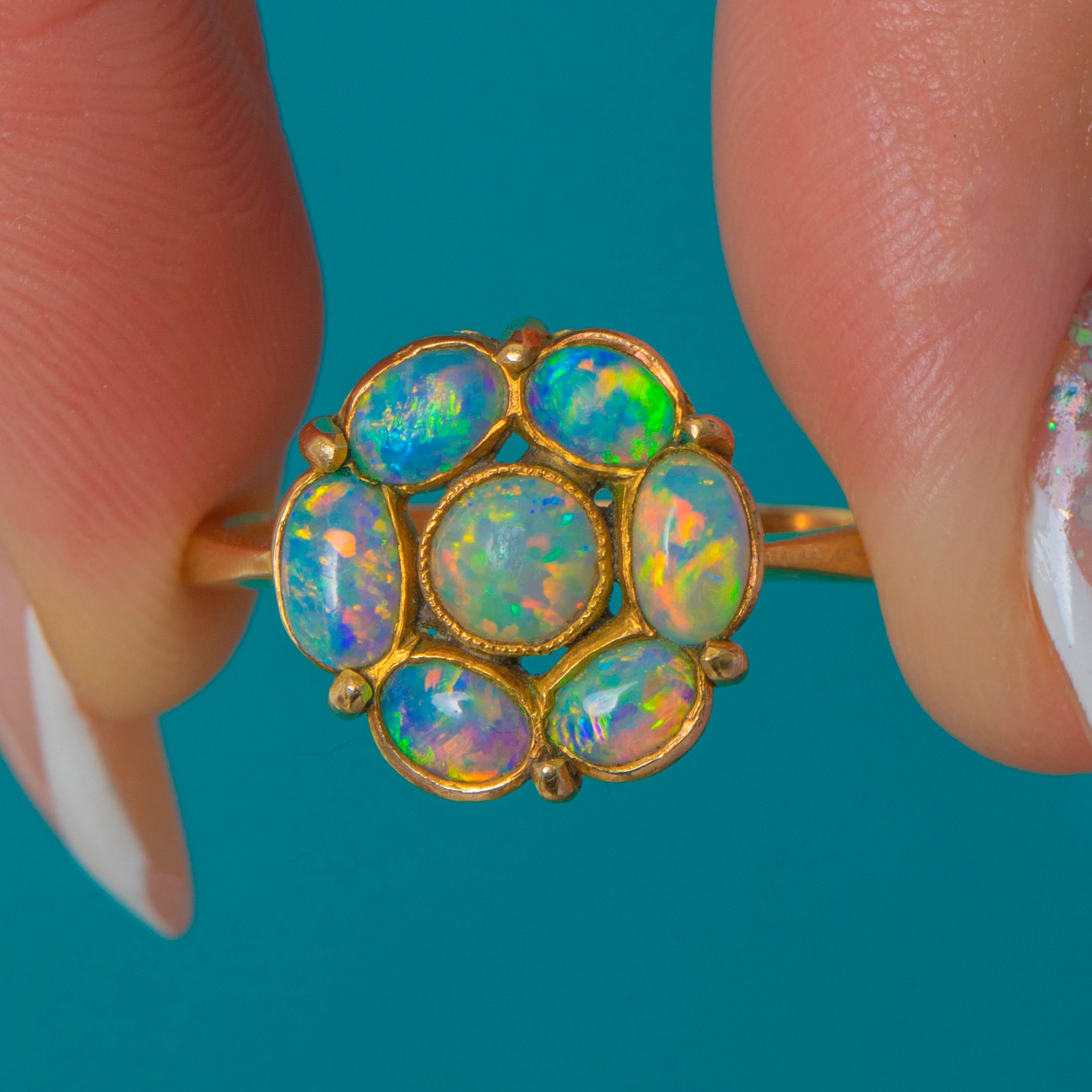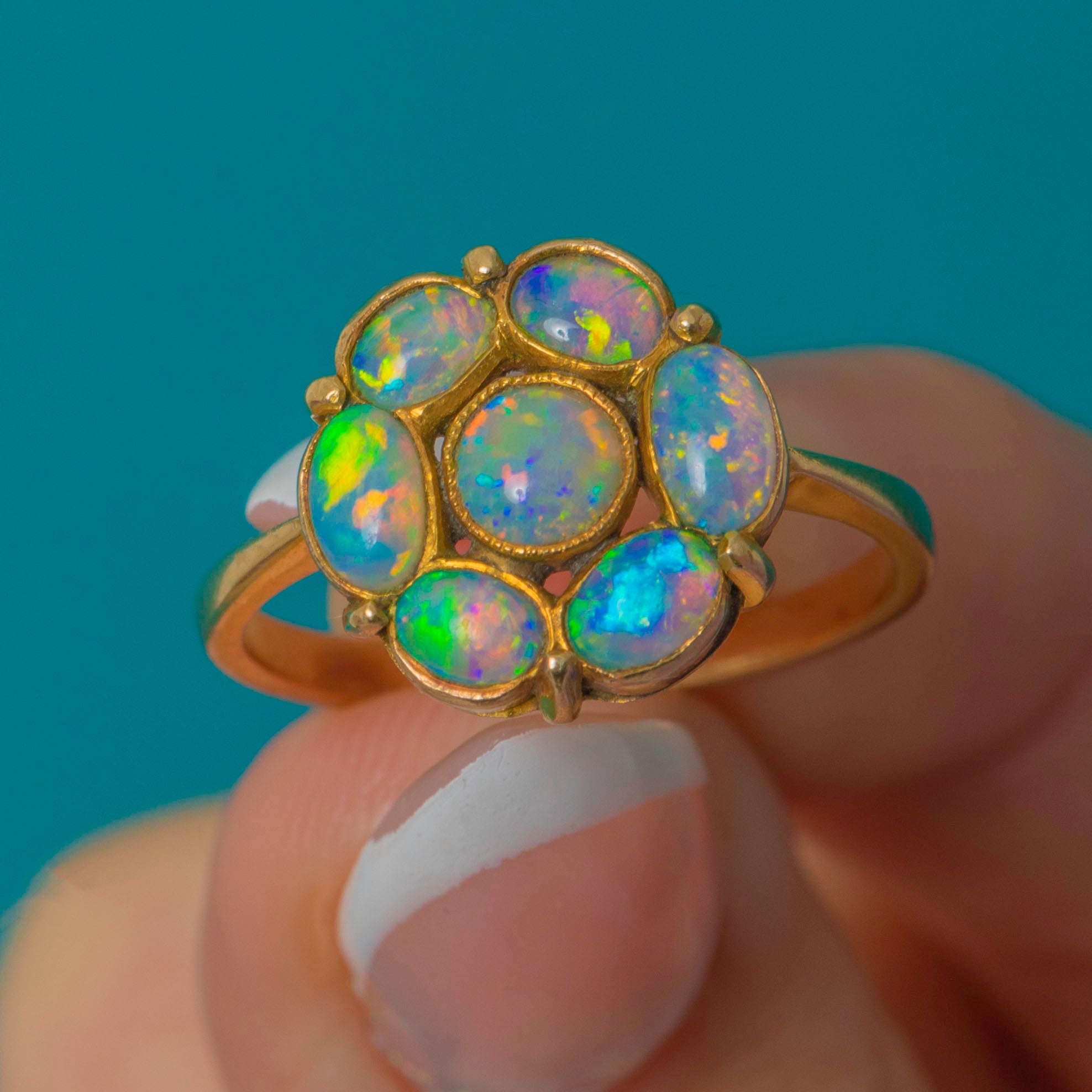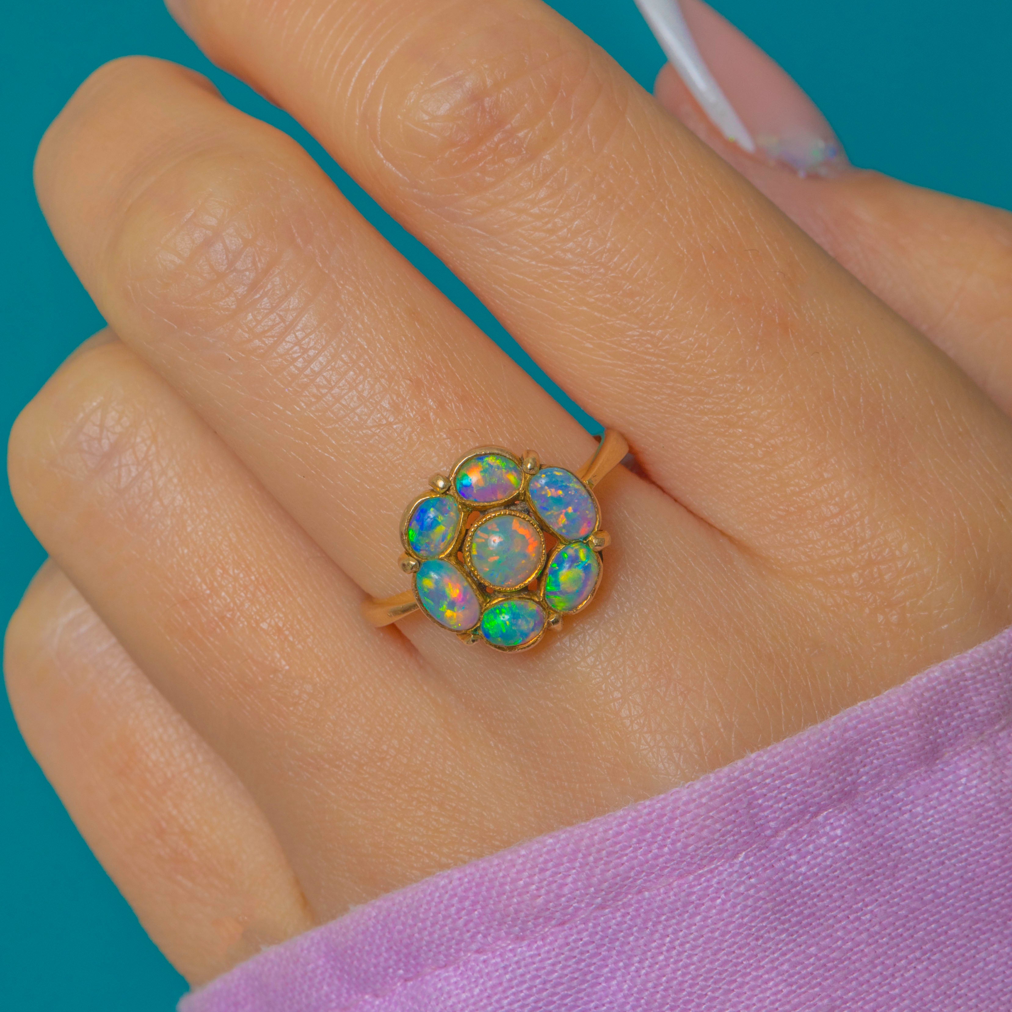EXCELLENT: The Opals are bright and vivid with no chips, cracks or noticeable wear. The 9ct Gold setting is crisp with minimal surface marks in line with age. A beautifully preserved Edwardian cluster ring.