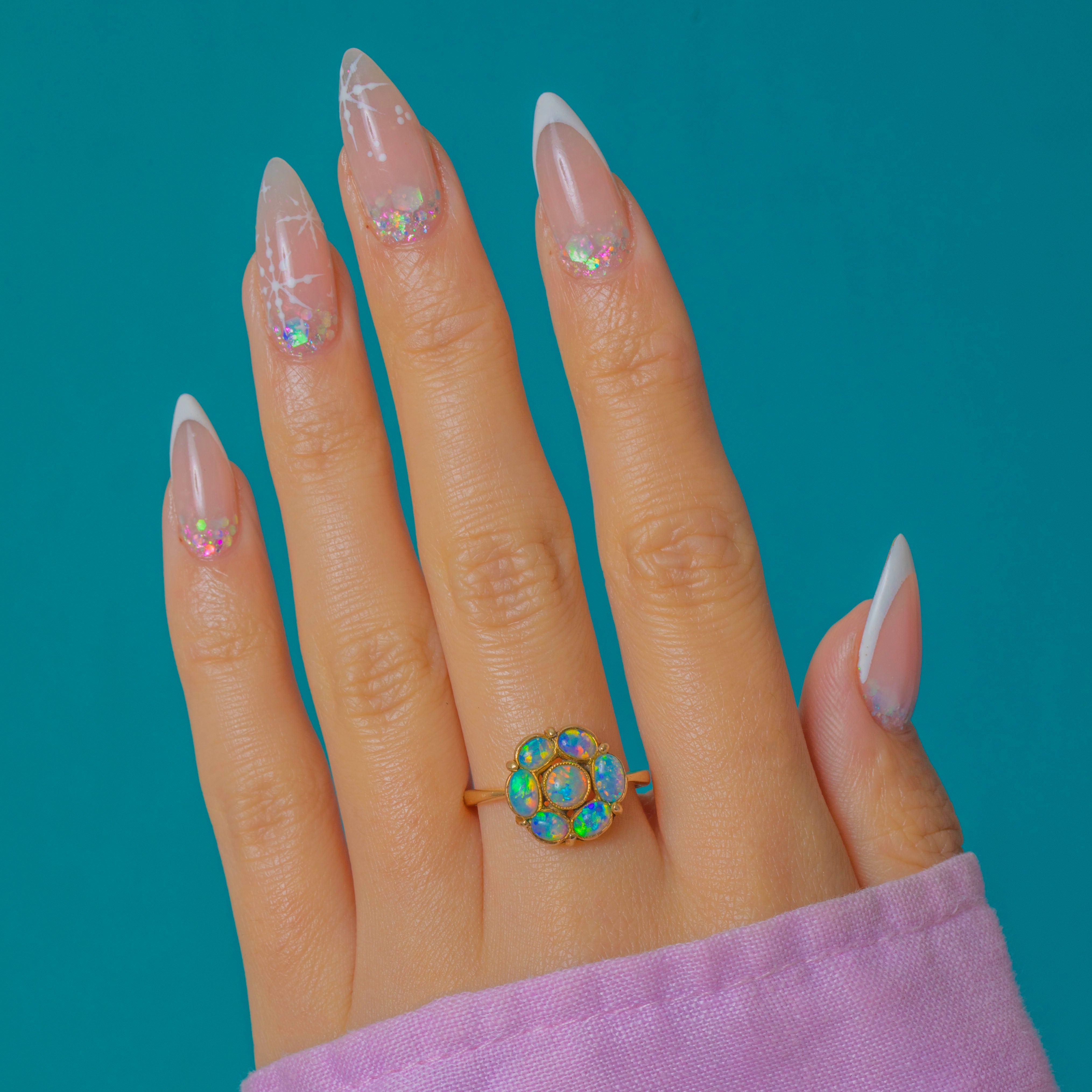 This Edwardian Opal flower ring is a wonderfully pretty piece, set with vivid natural Opals arranged in a classic floral cluster. The Opals glow with lively colour, each one catching soft flashes of light that bring the ring to life.